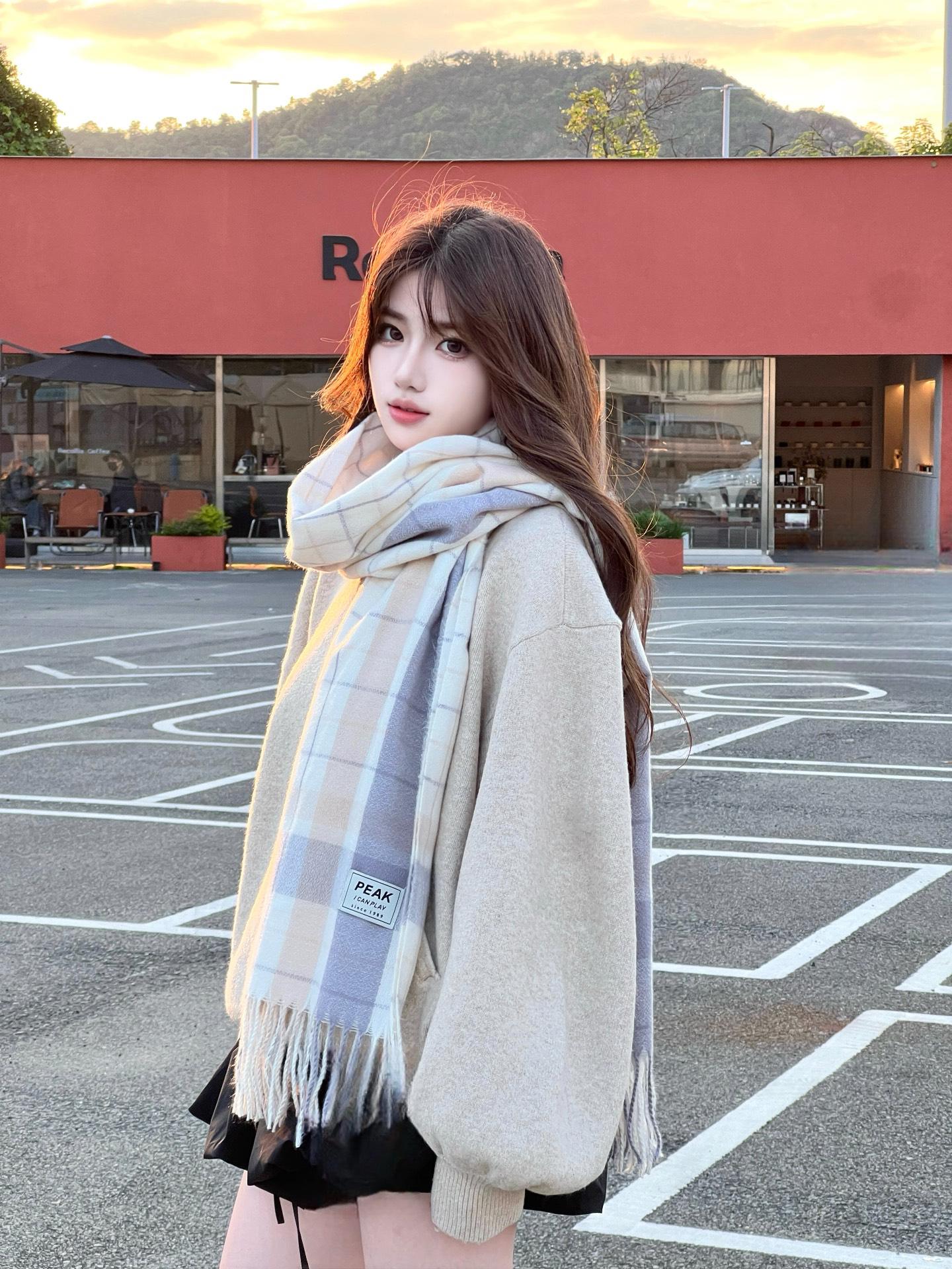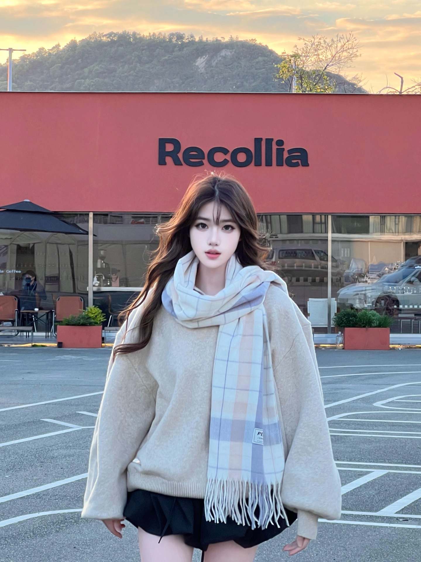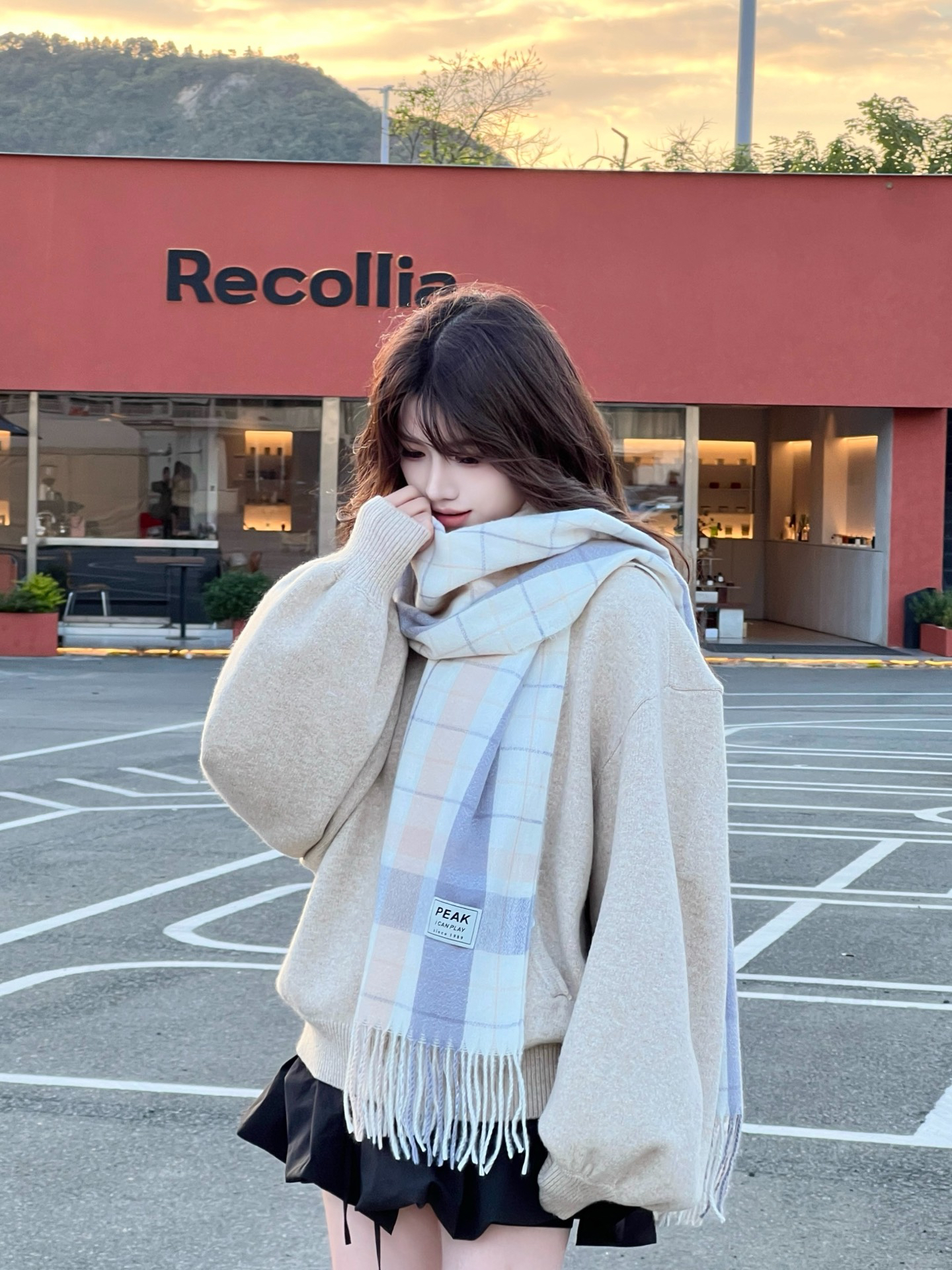 表白今天的落日 光落在身上好好看 带上一条围巾 好有氛围感 到了秋冬天我感觉围巾真的是既保暖又能增加搭配感 而且戴起来真的好显脸小呀 像这种浅色格子 也会衬的整个人都很清新 喜欢喜欢~ 图源于@清一XXX,侵删