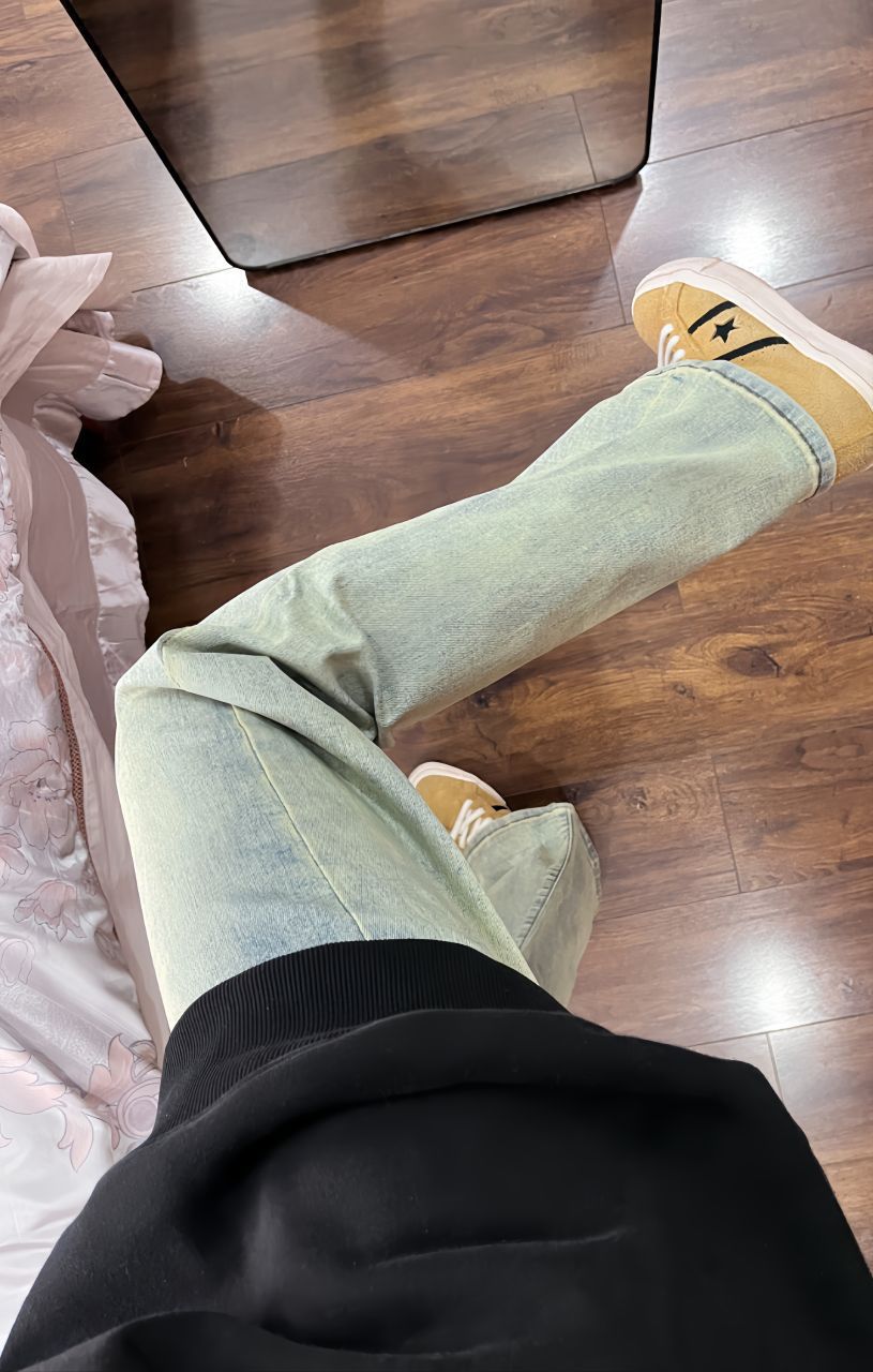 黑色卫衣搭配浅绿微喇牛仔裤 脚踩黄色星星板鞋,复古与潮流碰撞 随性又吸睛,轻松拿捏时尚感。