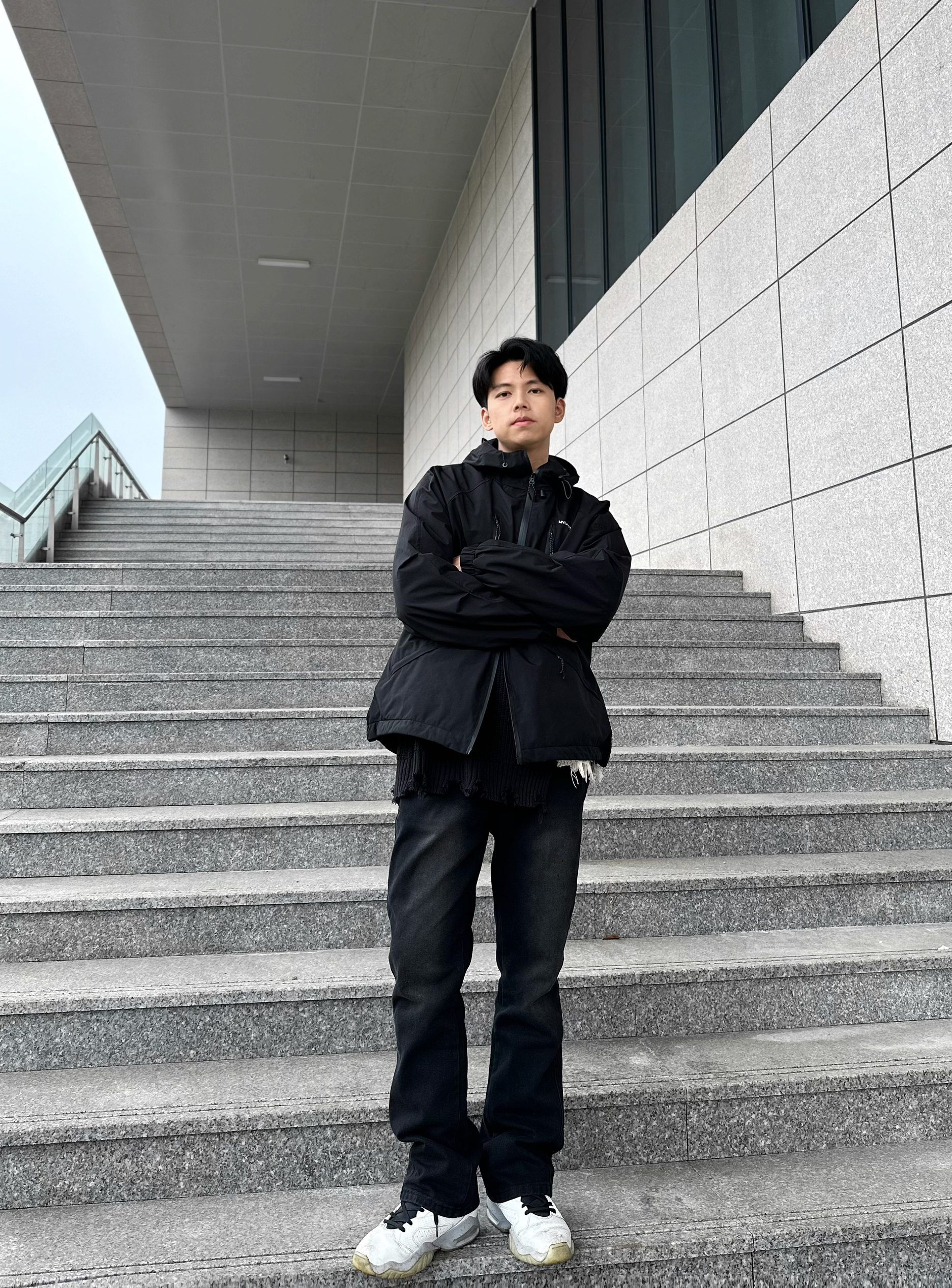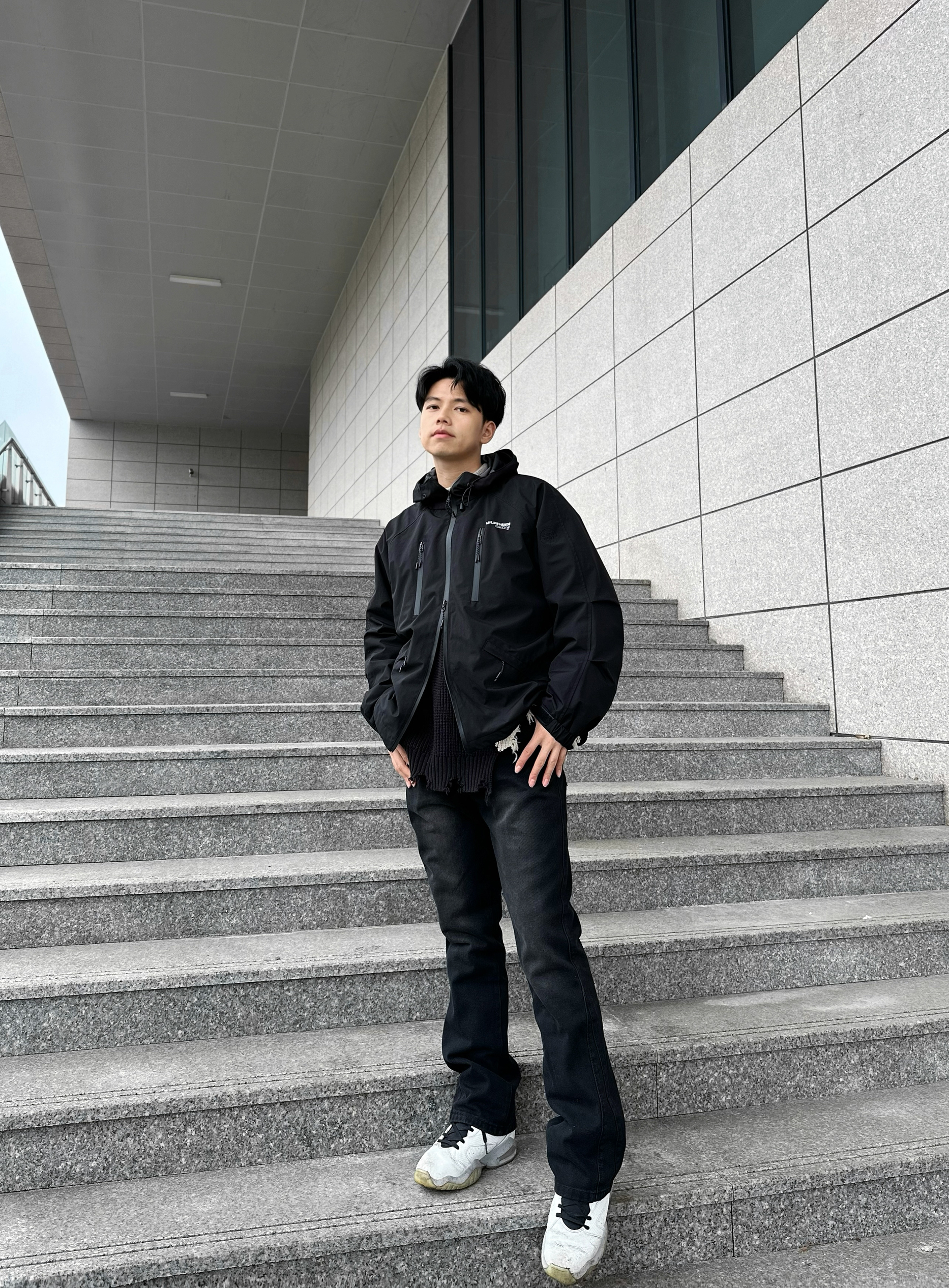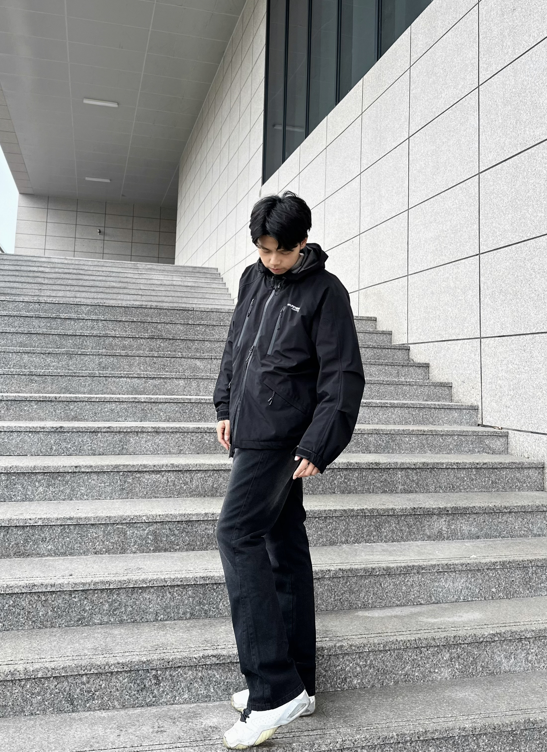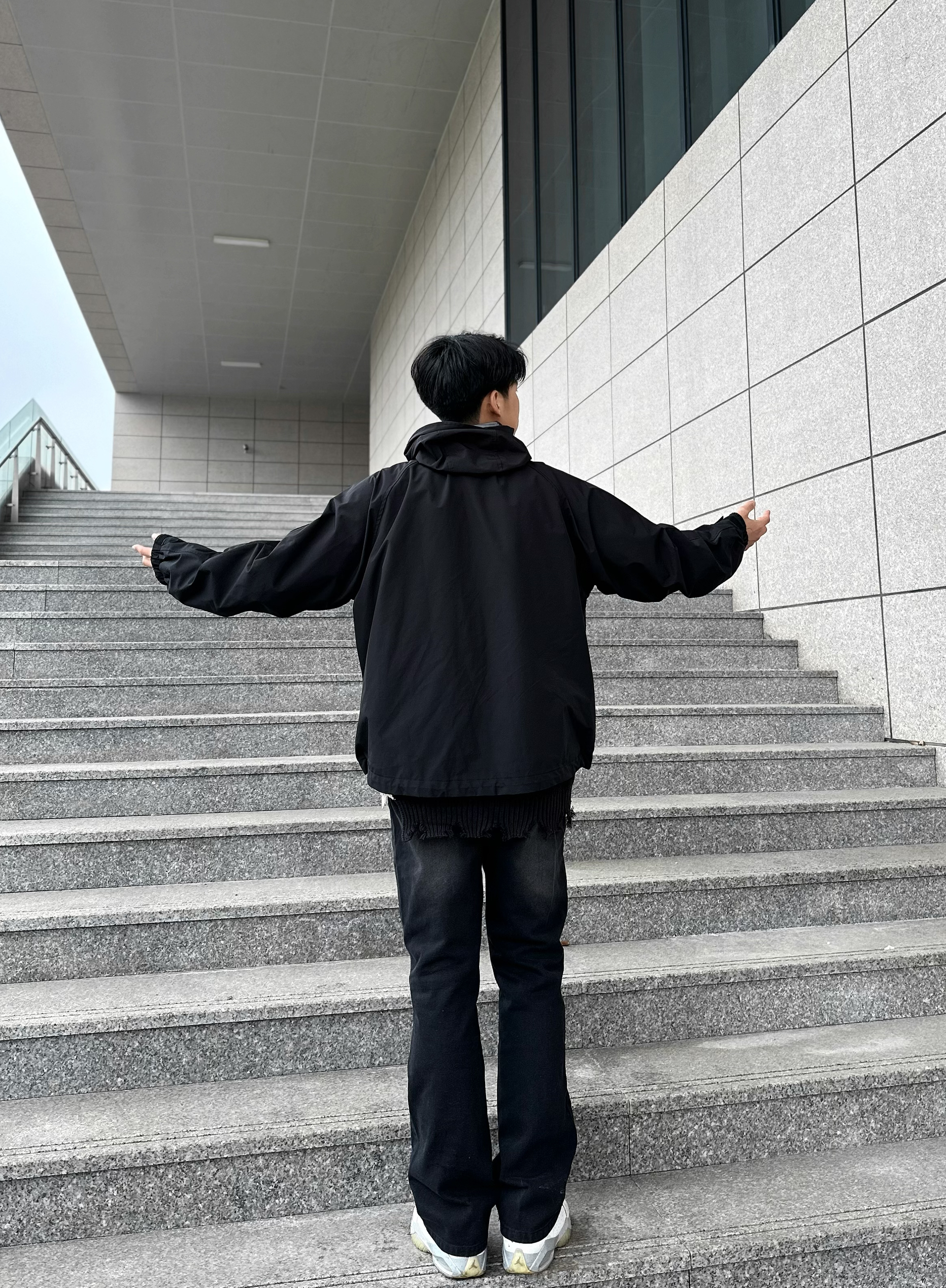 真不知道穿什么的时候 真的可以试试同色系穿搭 今天上身是黑色冲锋衣 下半身搭配的是黑色微喇叭牛仔裤 在裤身做了水洗渐变的效果 非常耐看 个人177 70kg 穿3XL 宽松~