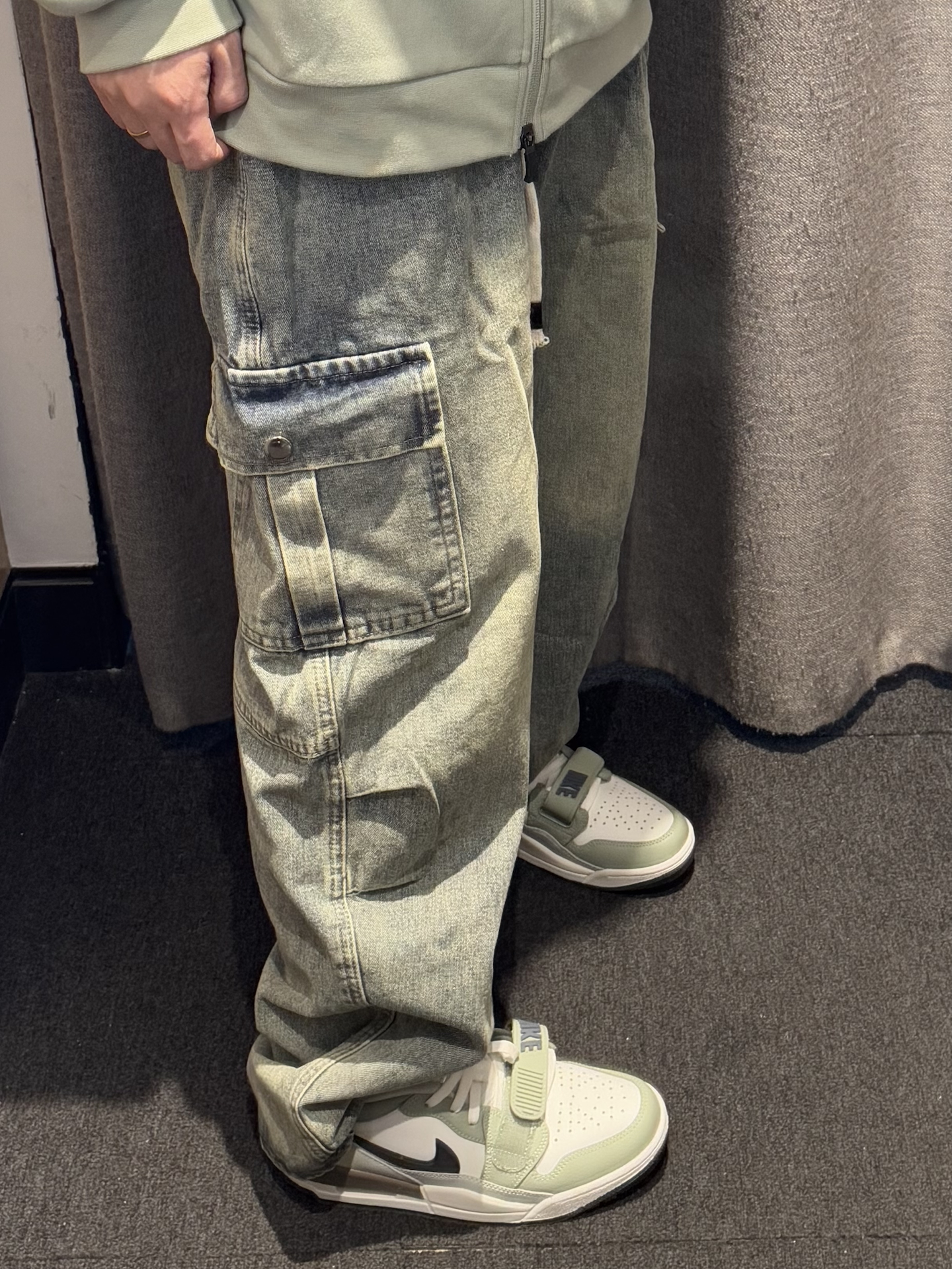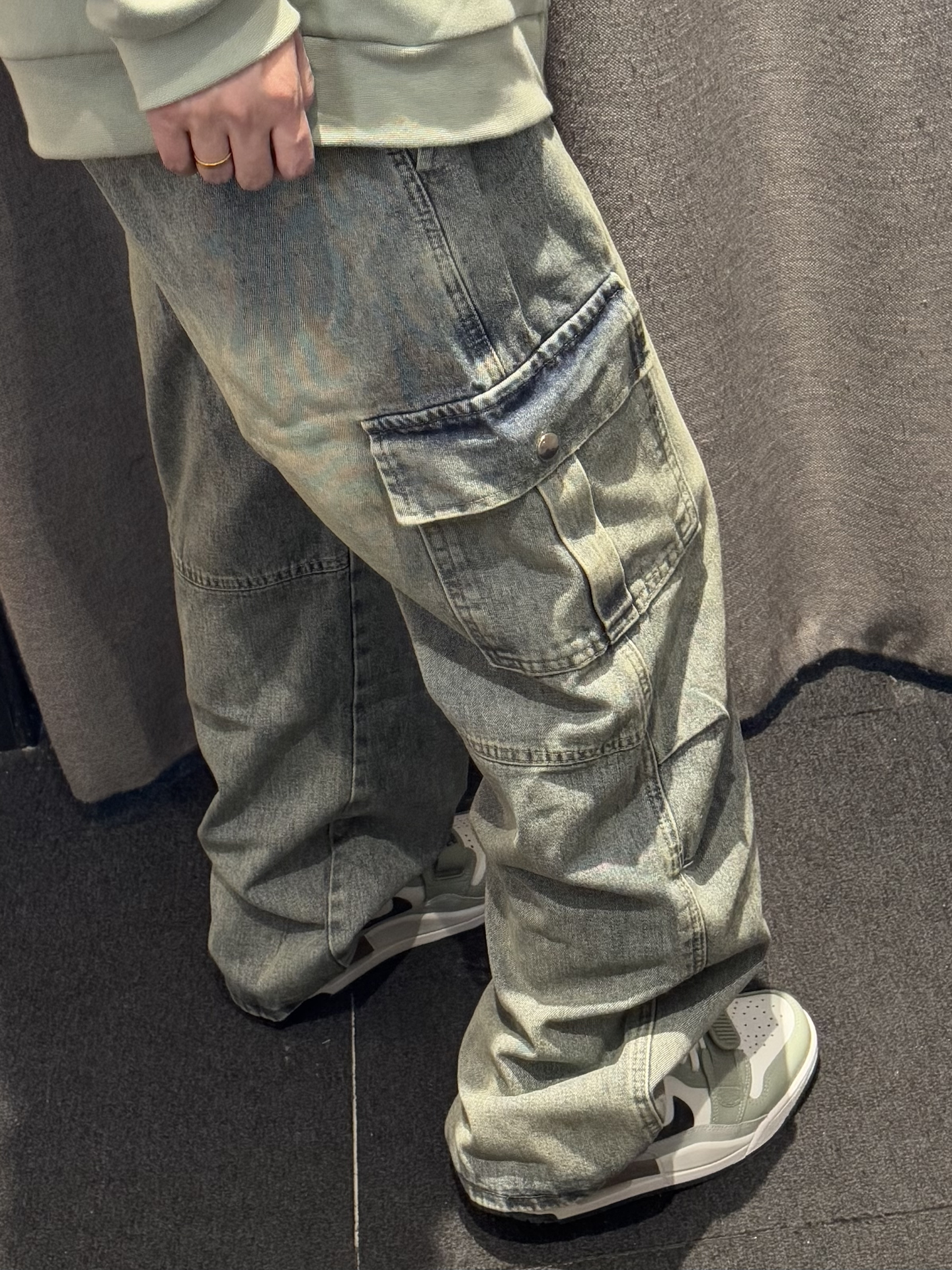 谁懂啊 美式工装牛仔裤上身也太帅了❕ 大口袋设计真的很爱~ 牛仔质感的做旧工艺 很显高街 宽松版型很有垂感 超好搭配 这条裤子我穿一次爱一次✌🏻 南 南