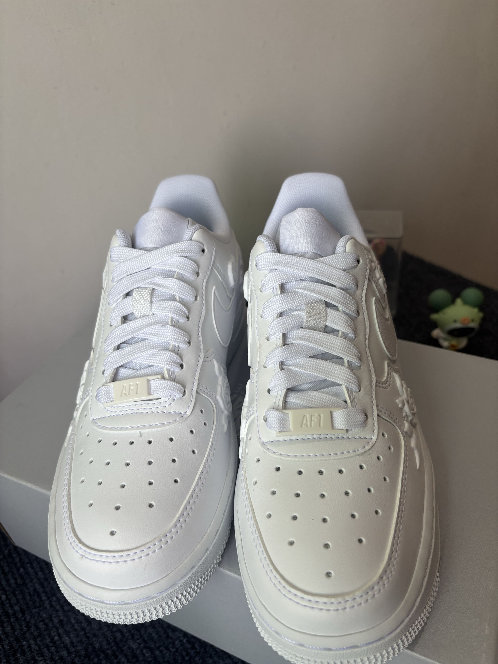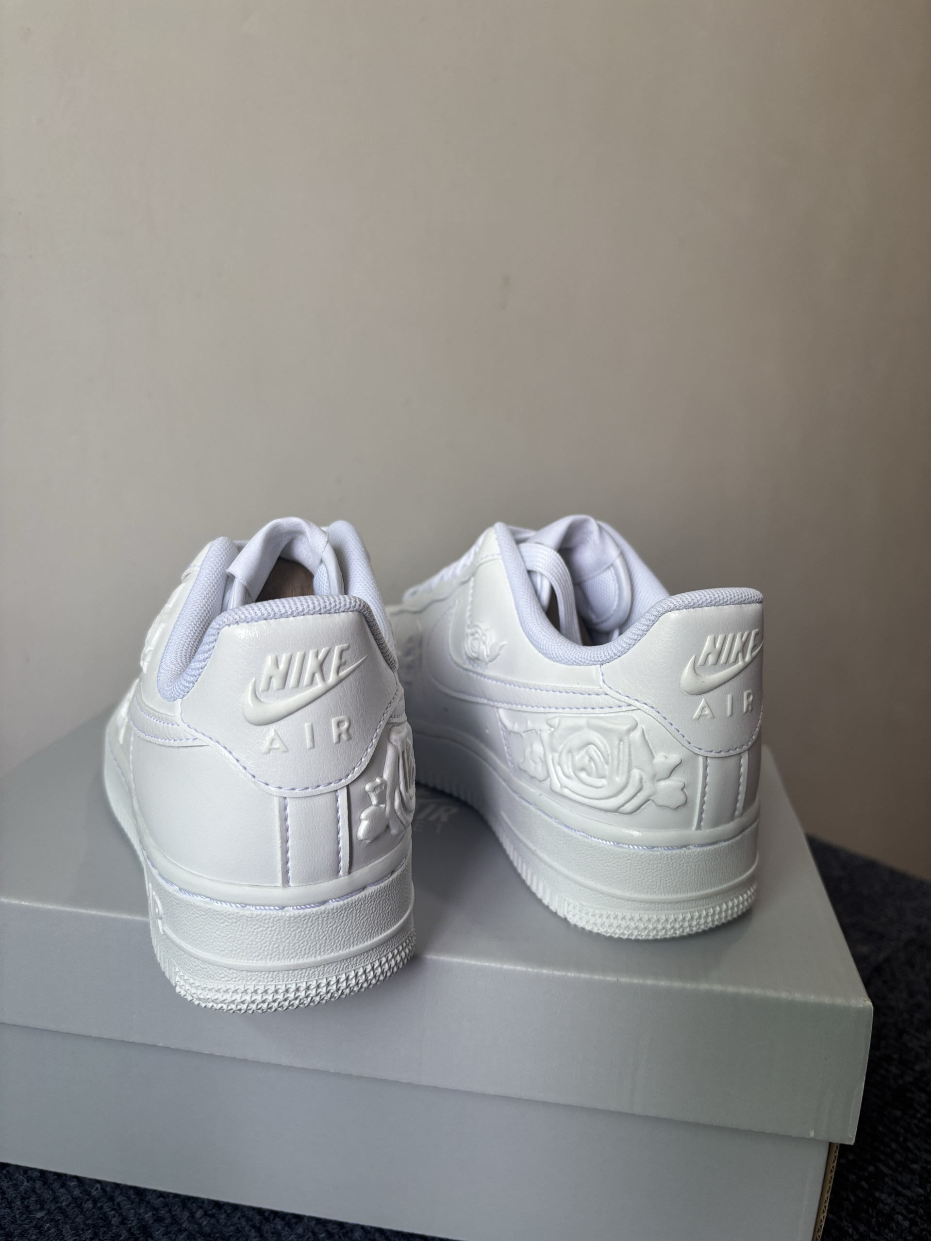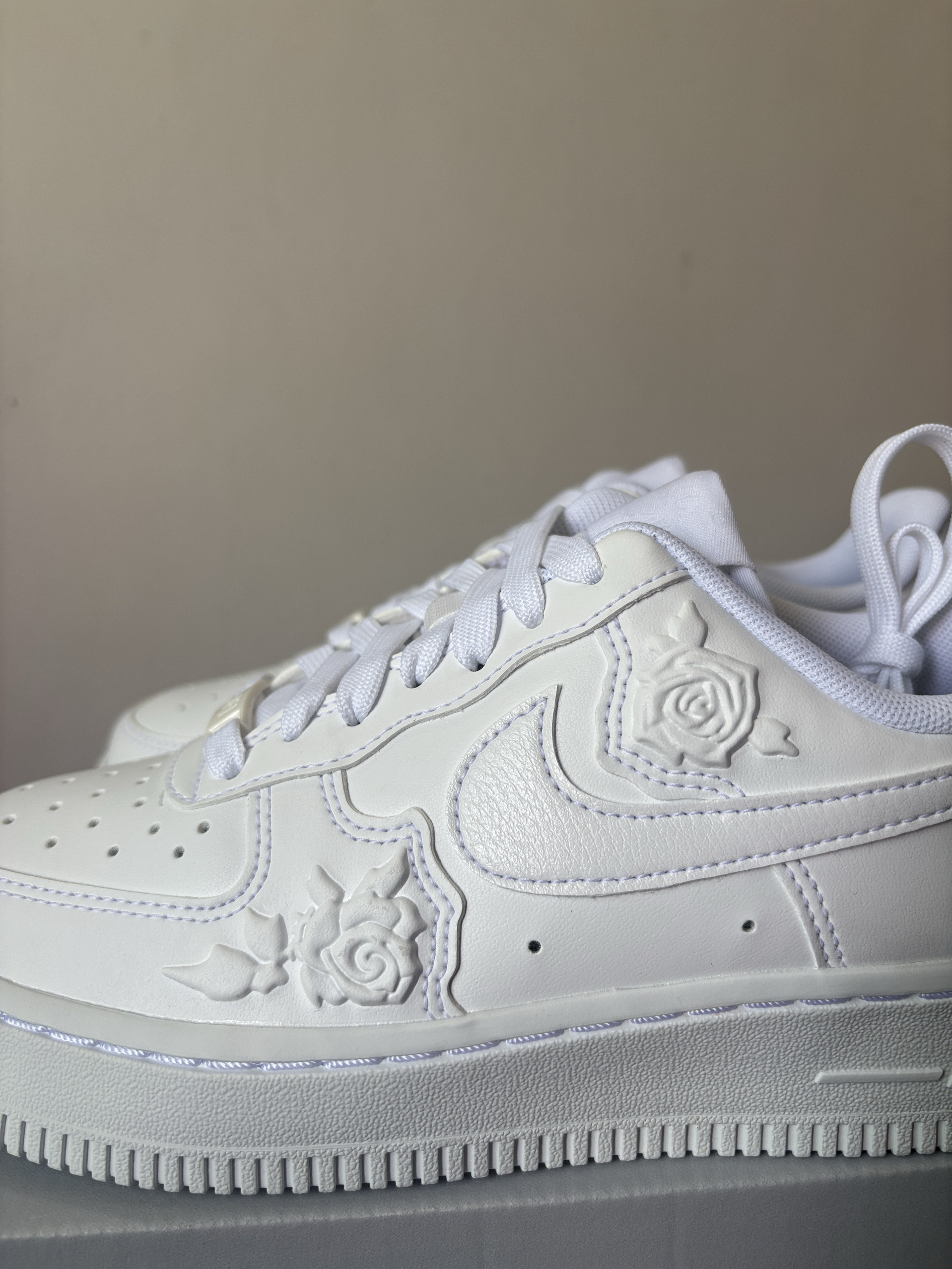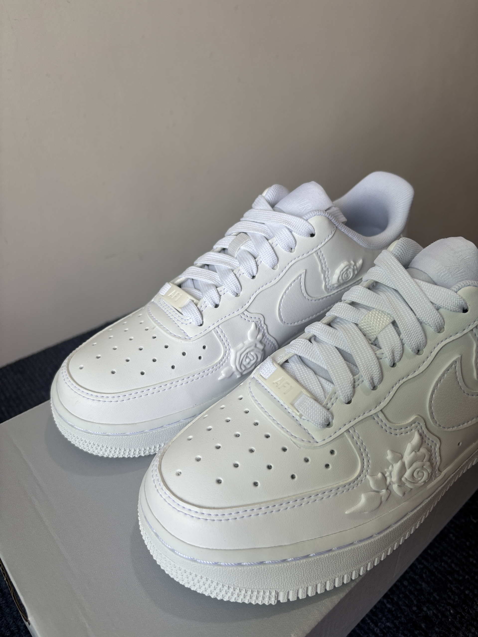 这双带玫瑰的空军,相较于传统纯白的空军,简直不要太香,我上脚的感受是还挺不错的,玫瑰的凹凸花纹让鞋有层次感!!!