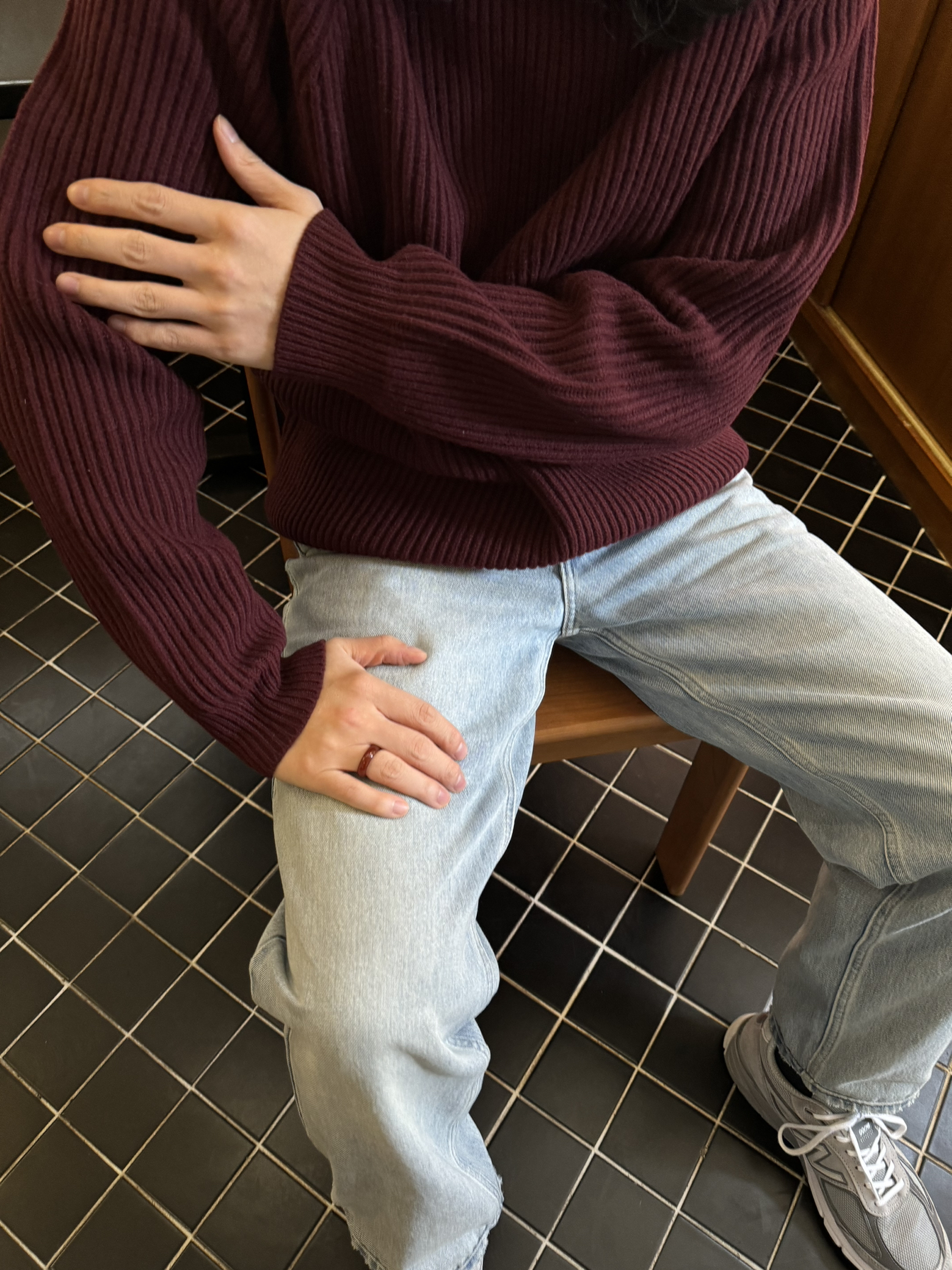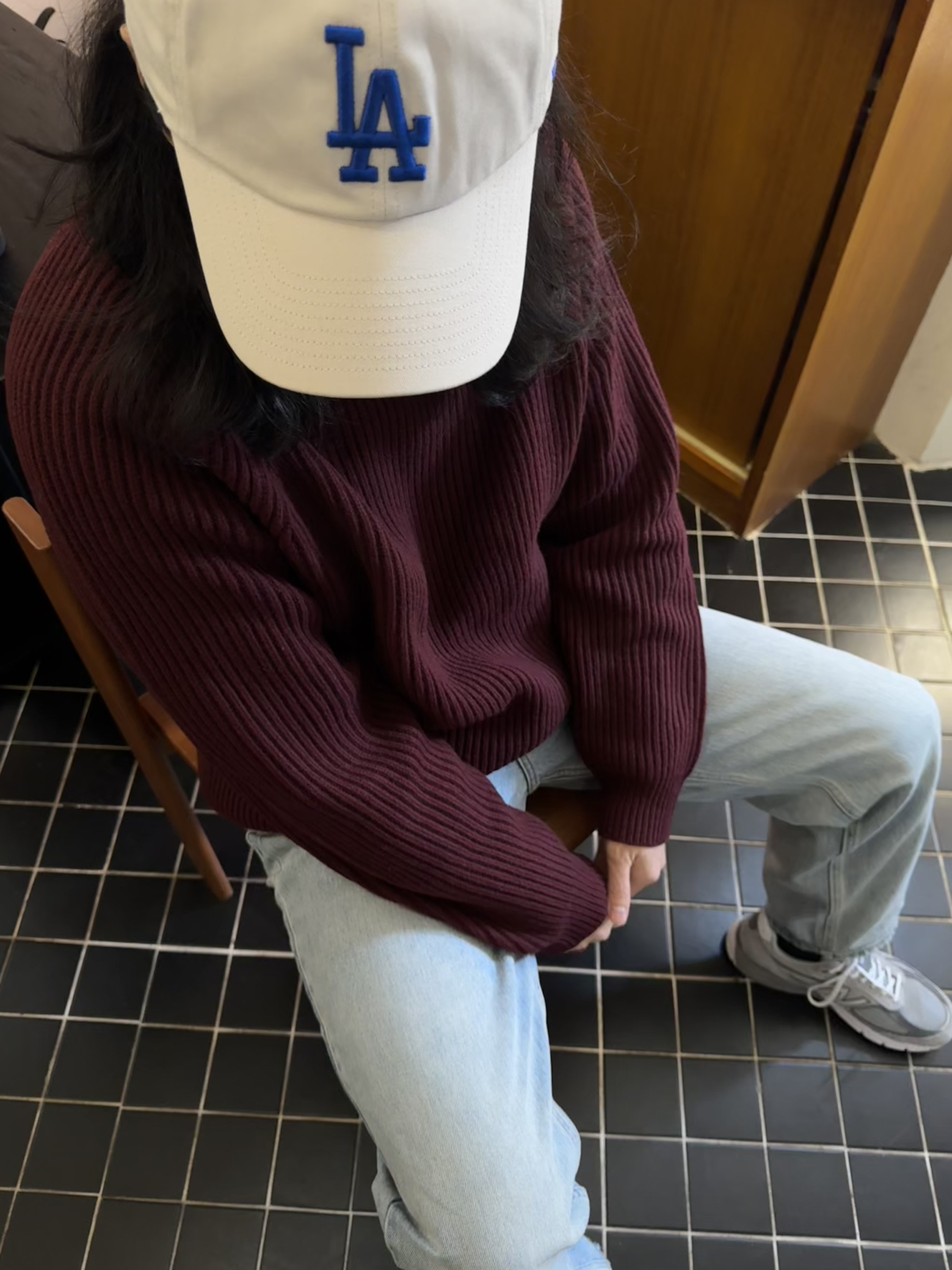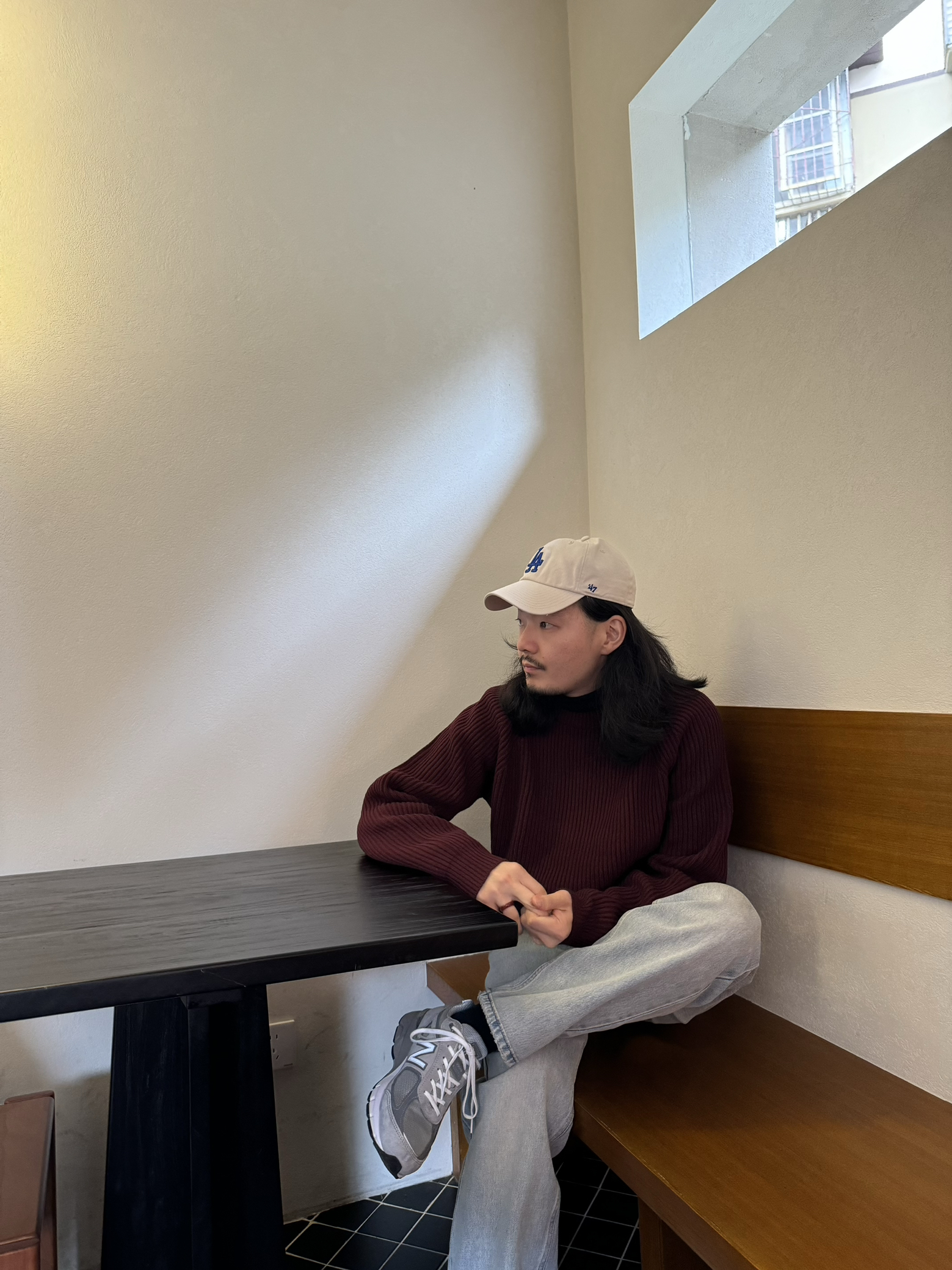 🧶🧶🧶 浅色系宽松牛仔裤搭配灰色990v4👟 上衣浆果红羊毛卫衣 米白色棒球帽 舒适 轻松 自在🆓