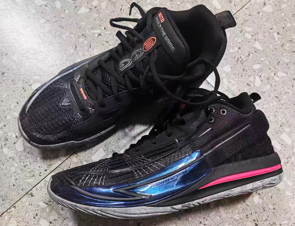 1.主体为黑色,搭配彩色侧边,颜值出众。 2.搭载全掌氮科技中底,配合EVA框架,展现优秀的缓震和回弹性能。启动时反馈灵敏,落地缓冲效果显著,适合频繁跳跃和变向动作。 3. 鞋底采用橡胶材质,结合人字纹与环形纹理,在水泥地和灰尘较多的场地仍能保持防滑性能。 4. 鞋面采用高强度绞综梭织网布,兼顾透气性与韧性,长时间穿着不易闷脚。 5. 鞋的重量保持在低的水平,适合后卫球员。 性能打分(每项满分均为...