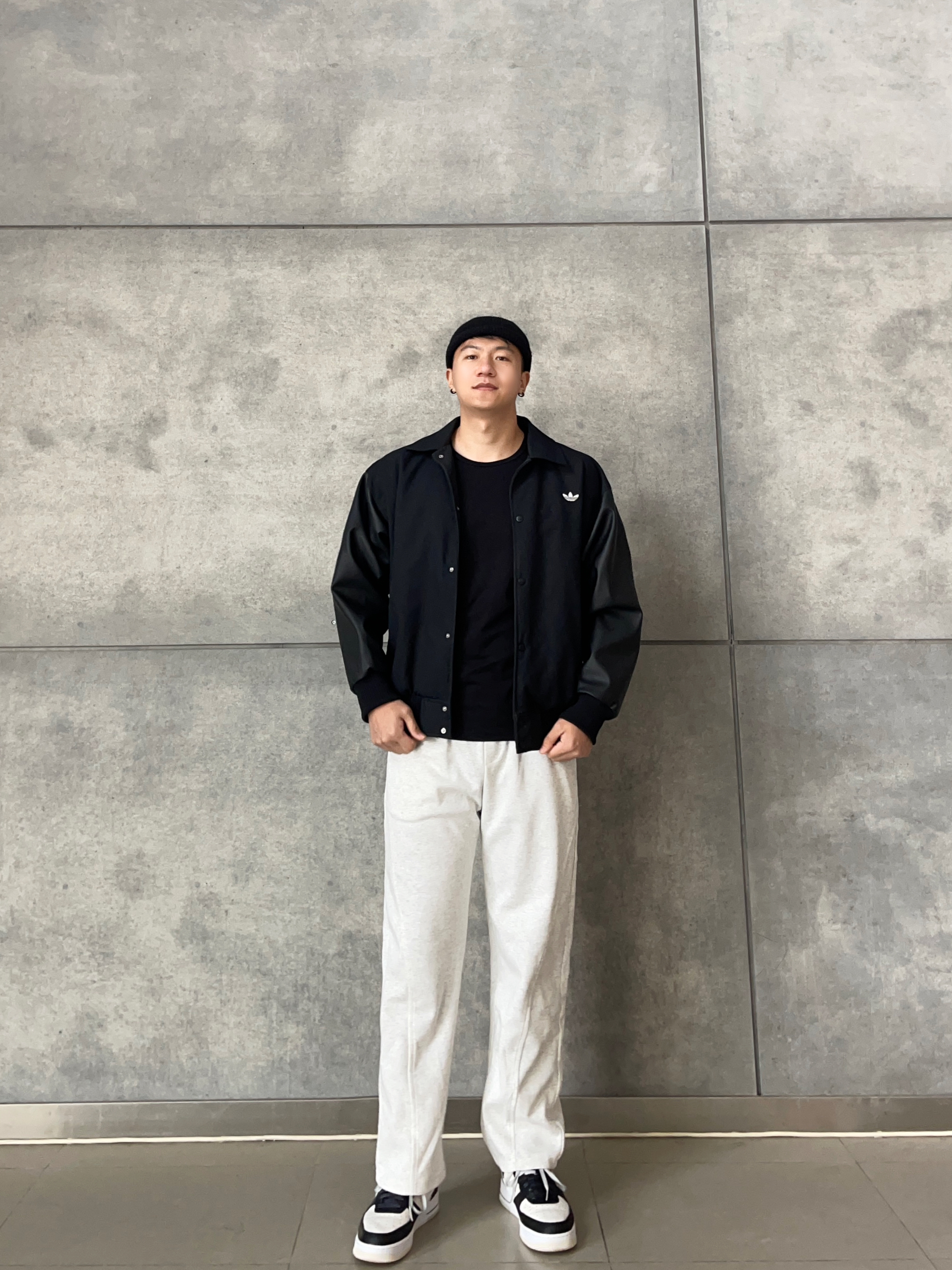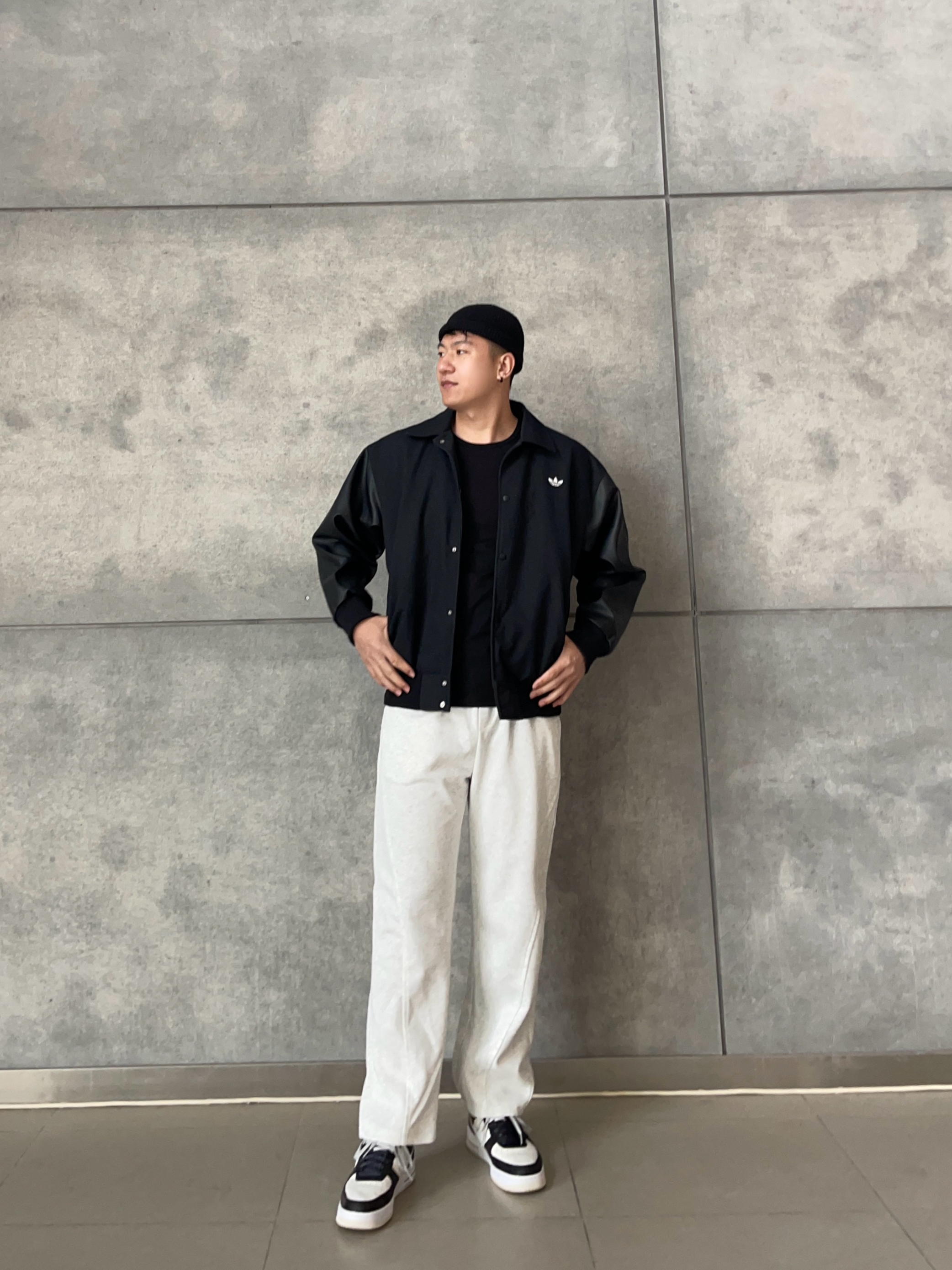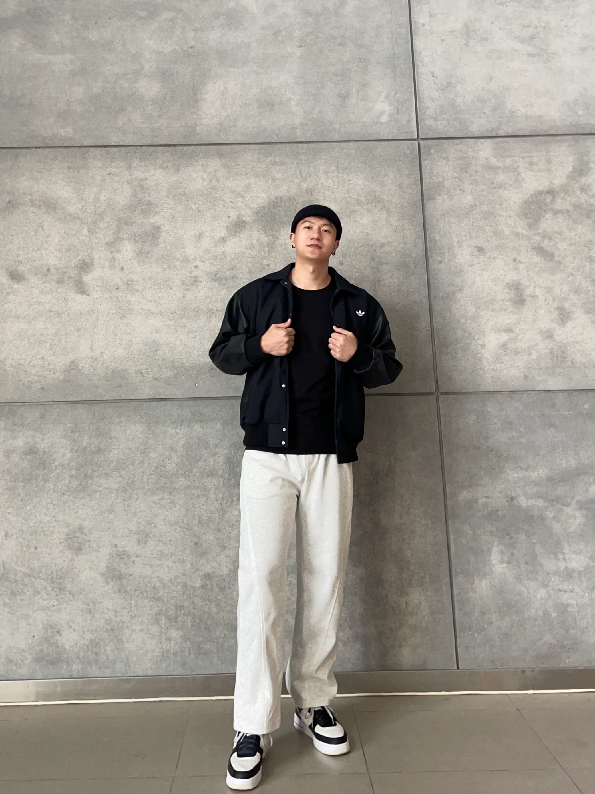 【🧥外套】三叶草黑夹克|皮袖拼接⚡️廓形自带美式气场 挡风抗皱实穿率爆表💥 【👕内搭】直筒黑长袖|⚫️极简叠穿不显臃肿!微弹面料活动无束缚 单穿内搭无压力👍🏻 【👖裤装】灰白阔腿卫裤|🍃春日氧气感配色!慵懒感直接拿捏🤏🏻 【👟鞋履】空军一号|万能搭配神器,细节质感拉满 【🌟整体】美式硬核x温柔男友风の完美平衡!皮质元素碰撞灰白基调,出街既有棱角又不失亲和力💥约会/通勤/打球一键切换无压力~...