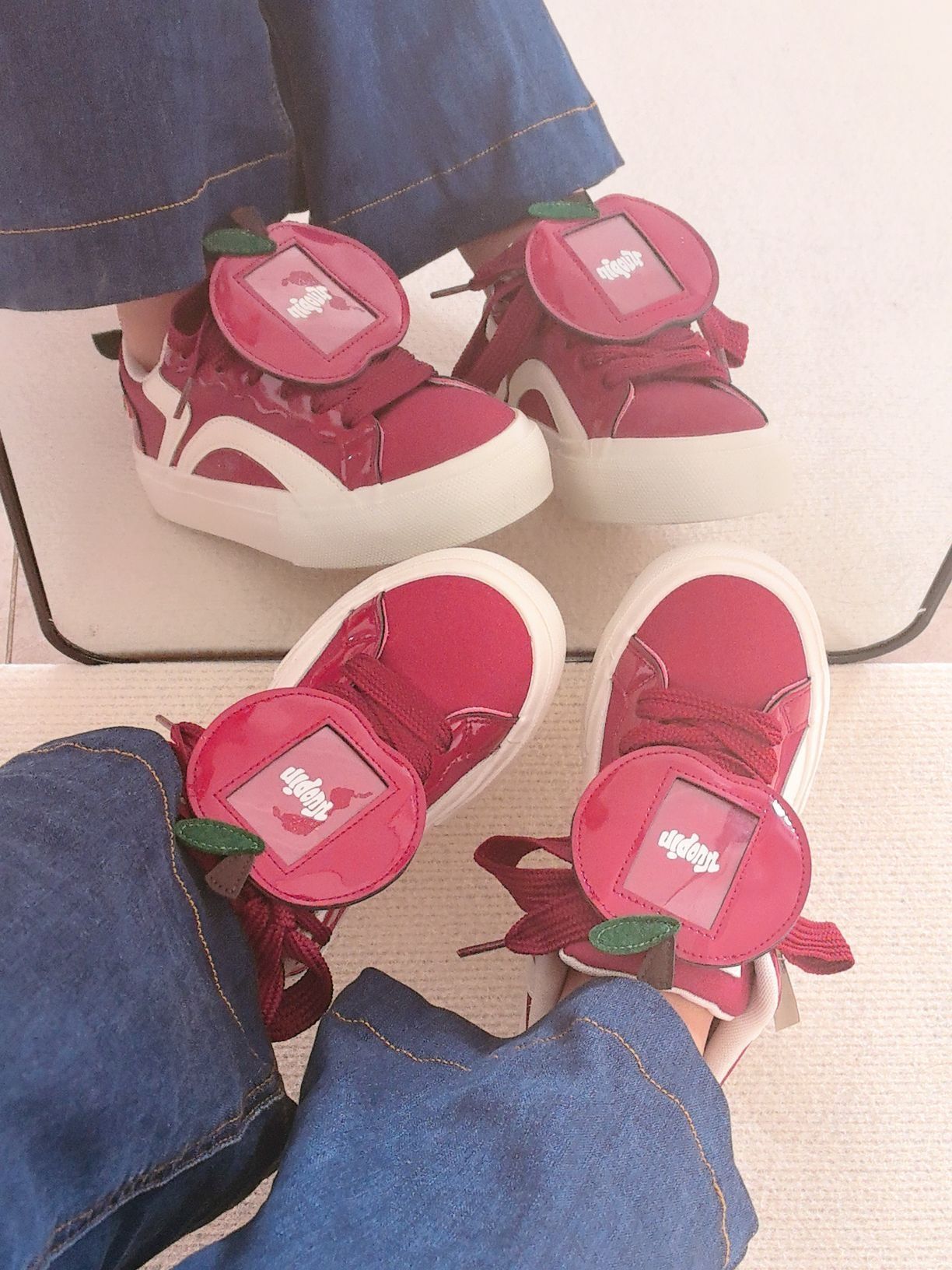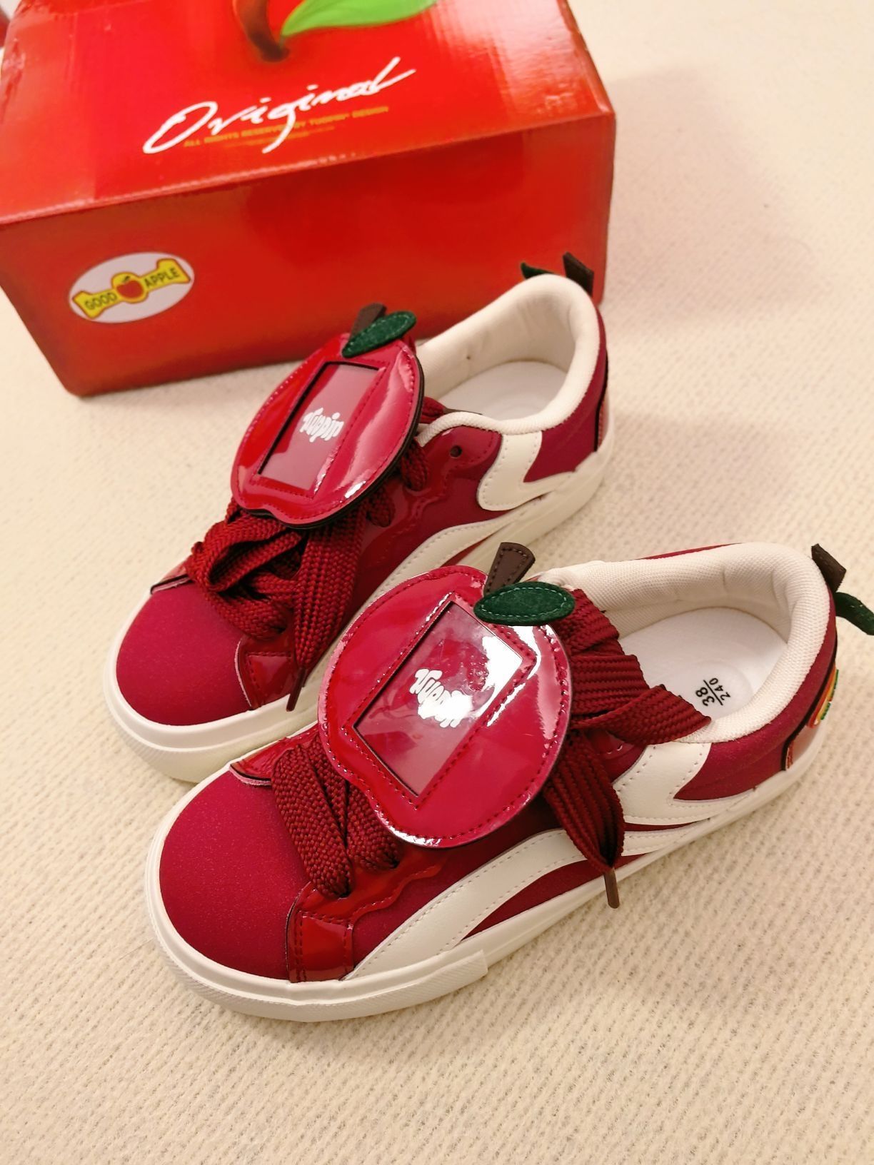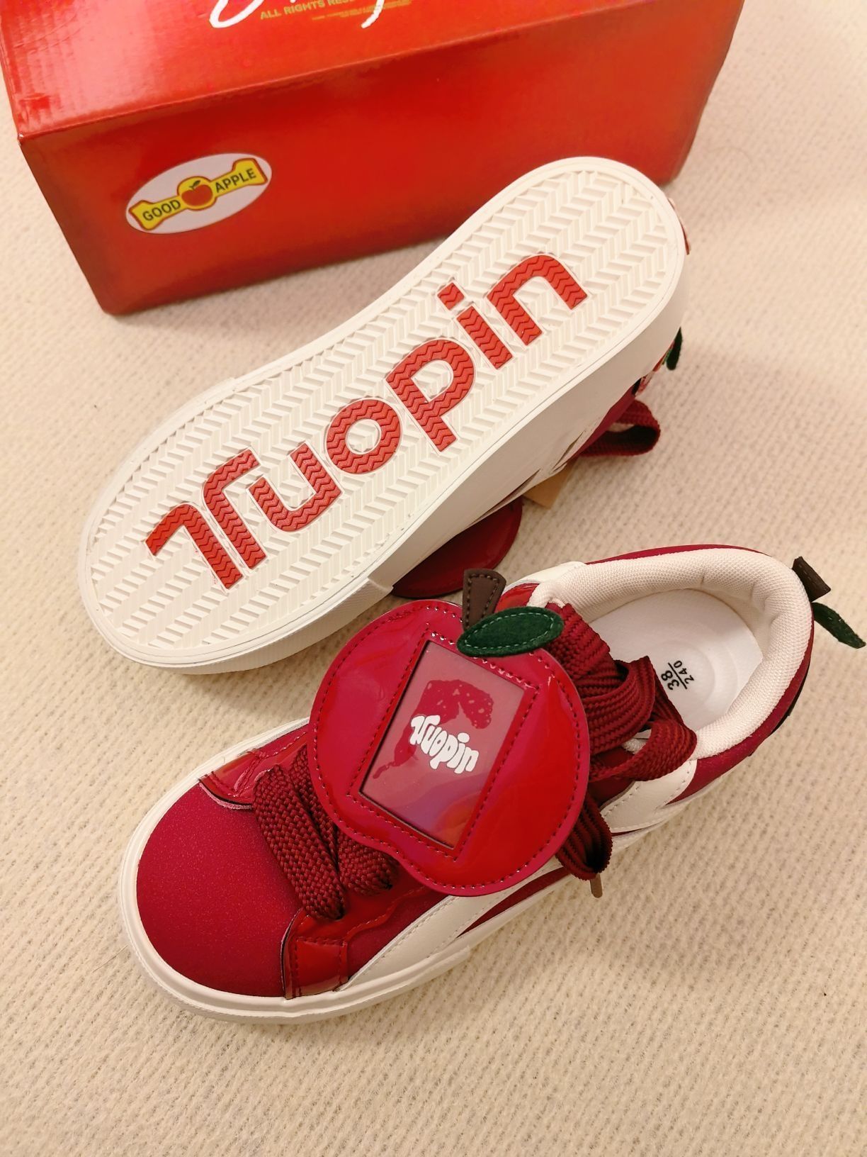 这双童趣满满的板鞋谁不爱啊! 红白色调时尚又好看, 鞋上的苹果装饰可可爱爱。 鞋底印有品牌字样,细节感拉满有木有, 穿上去活力十足 , 喜欢苹果🍎的友友们不要错过这双鞋。 上脚可爱度拉满, 和牛仔裤适配度100%, 日常出街随便搭都好看~