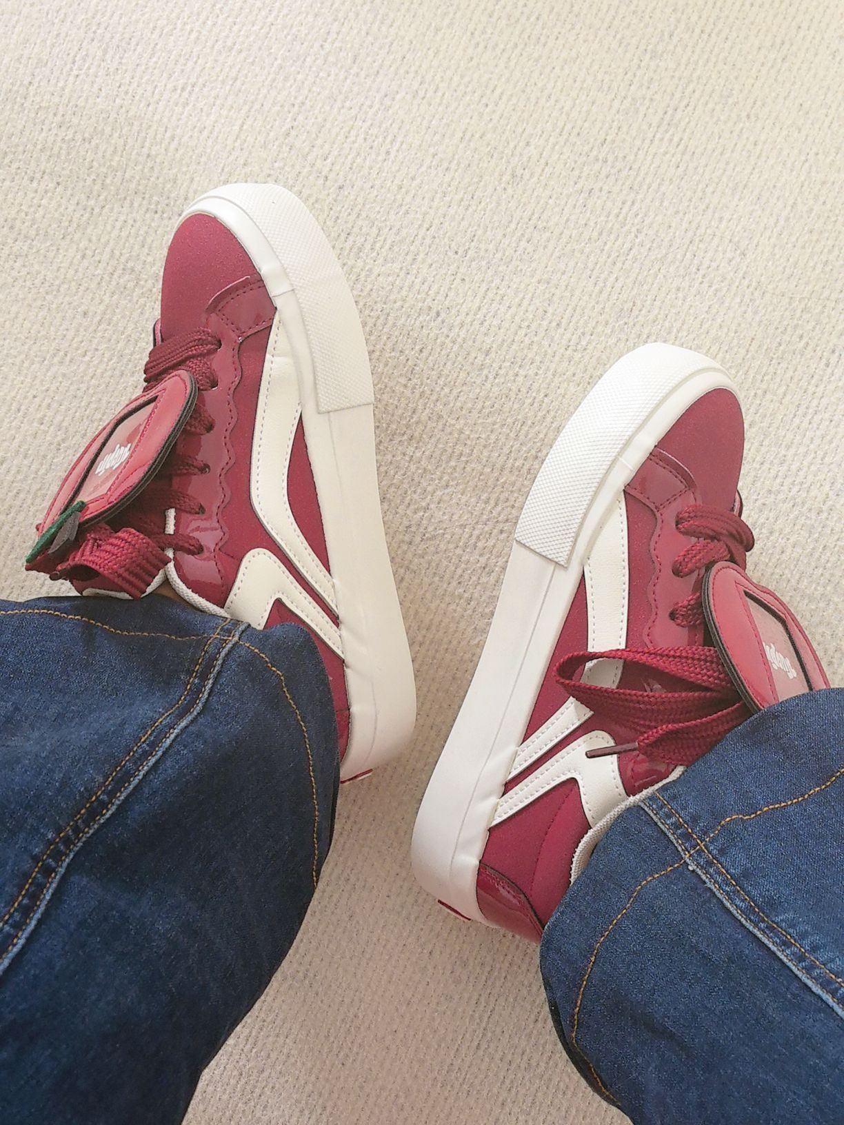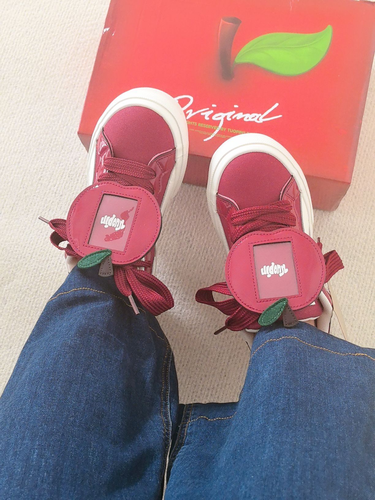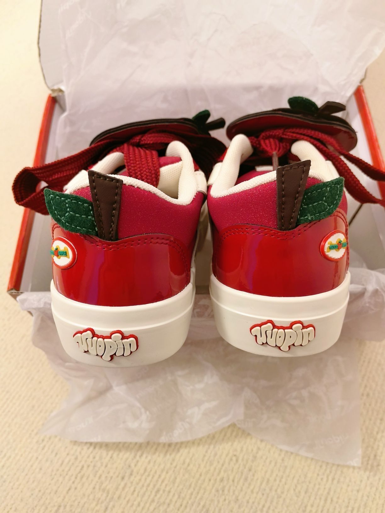 这双童趣满满的板鞋谁不爱啊! 红白色调时尚又好看, 鞋上的苹果装饰可可爱爱。 鞋底印有品牌字样,细节感拉满有木有, 穿上去活力十足 , 喜欢苹果🍎的友友们不要错过这双鞋。 上脚可爱度拉满, 和牛仔裤适配度100%, 日常出街随便搭都好看~