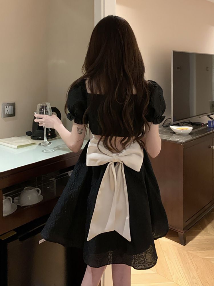 泡泡袖连衣裙女夏季方领小黑裙子设计感小个子后背蝴蝶结蓬蓬短裙
