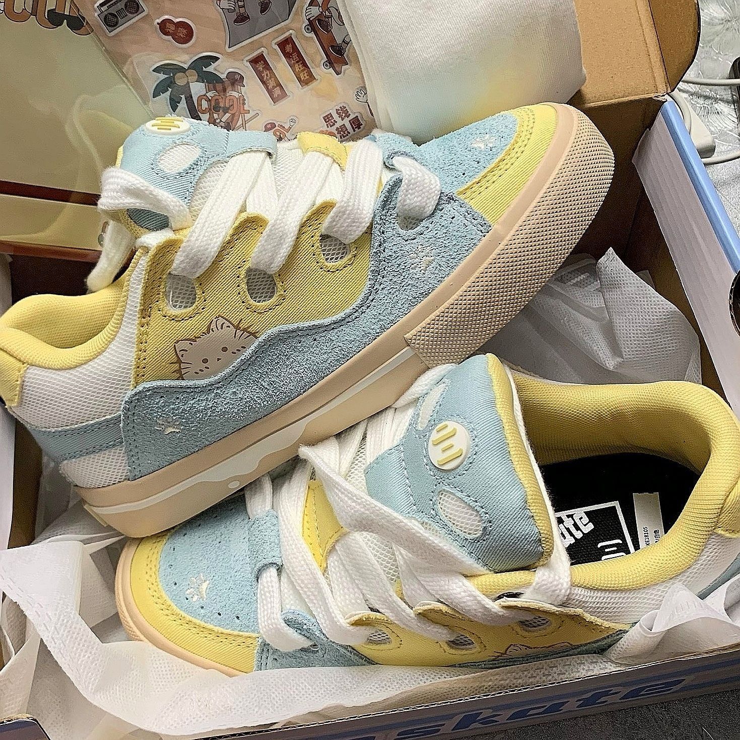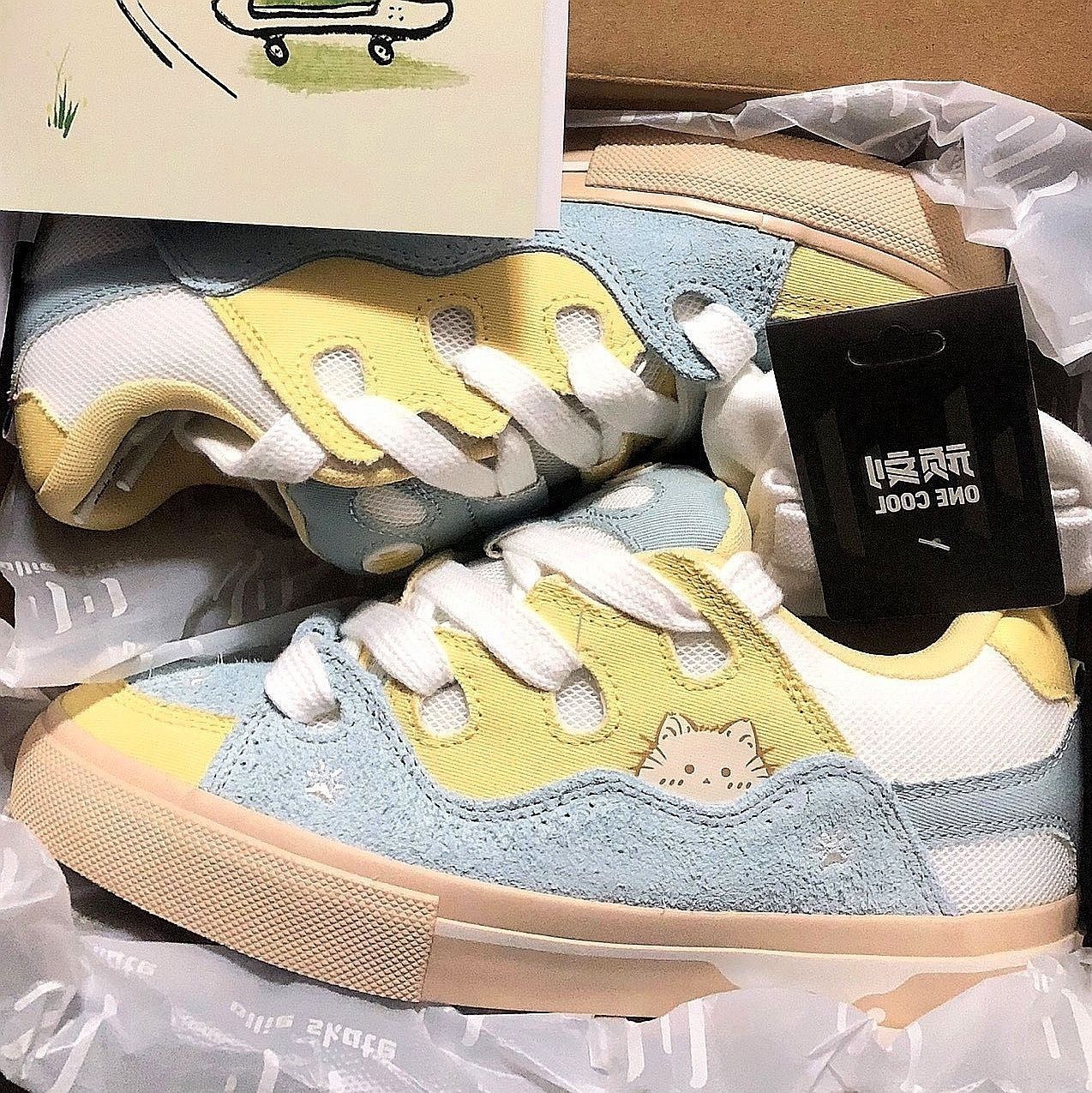👉【开箱直击】这双鞋的颜值真的鲨我!😍蓝白橙三色拼接超元气,鞋头的小猫咪印花萌到犯规~日常出街回头率💯,闺蜜追着要链接系列! ✅【真实优点】 1️⃣ 轻到飞起:上脚像踩棉花!官方标注单只鞋仅280g(实测女码38约285g),暴走2小时jio完全不累✨ 2️⃣ 耐磨扛造:橡胶大底+加厚鞋边,穿去滑板🛹也没刮花(但专业动作建议选专业滑板鞋哦) 3️⃣ 四季百搭:低帮设计配牛仔裤/...
