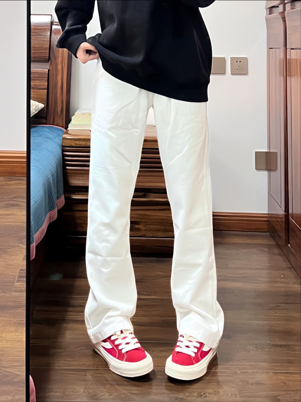 简约黑色上衣搭配干净白色长裤,脚踩亮眼的红色板鞋,利落又个性,轻松打造吸睛日常穿搭。