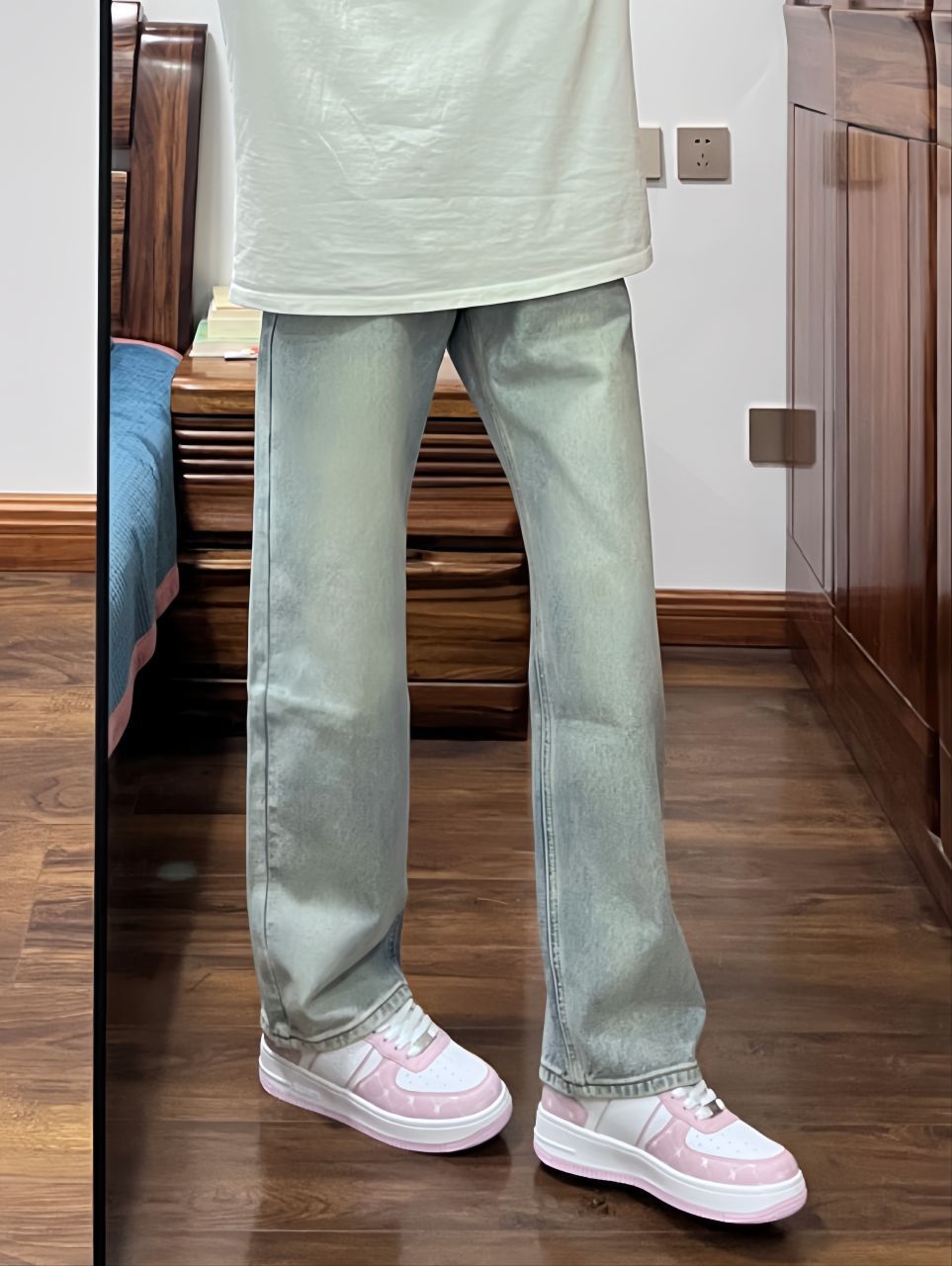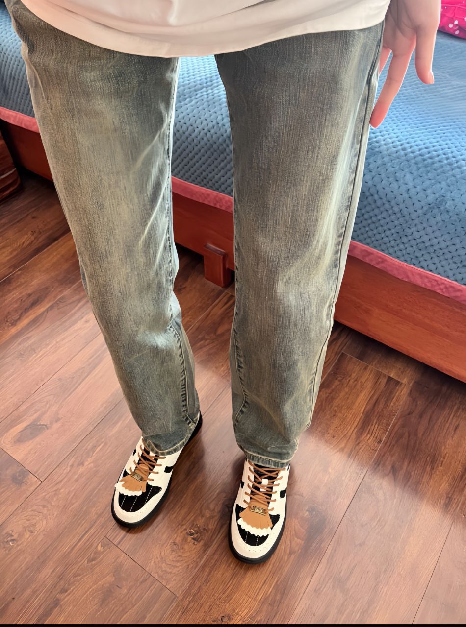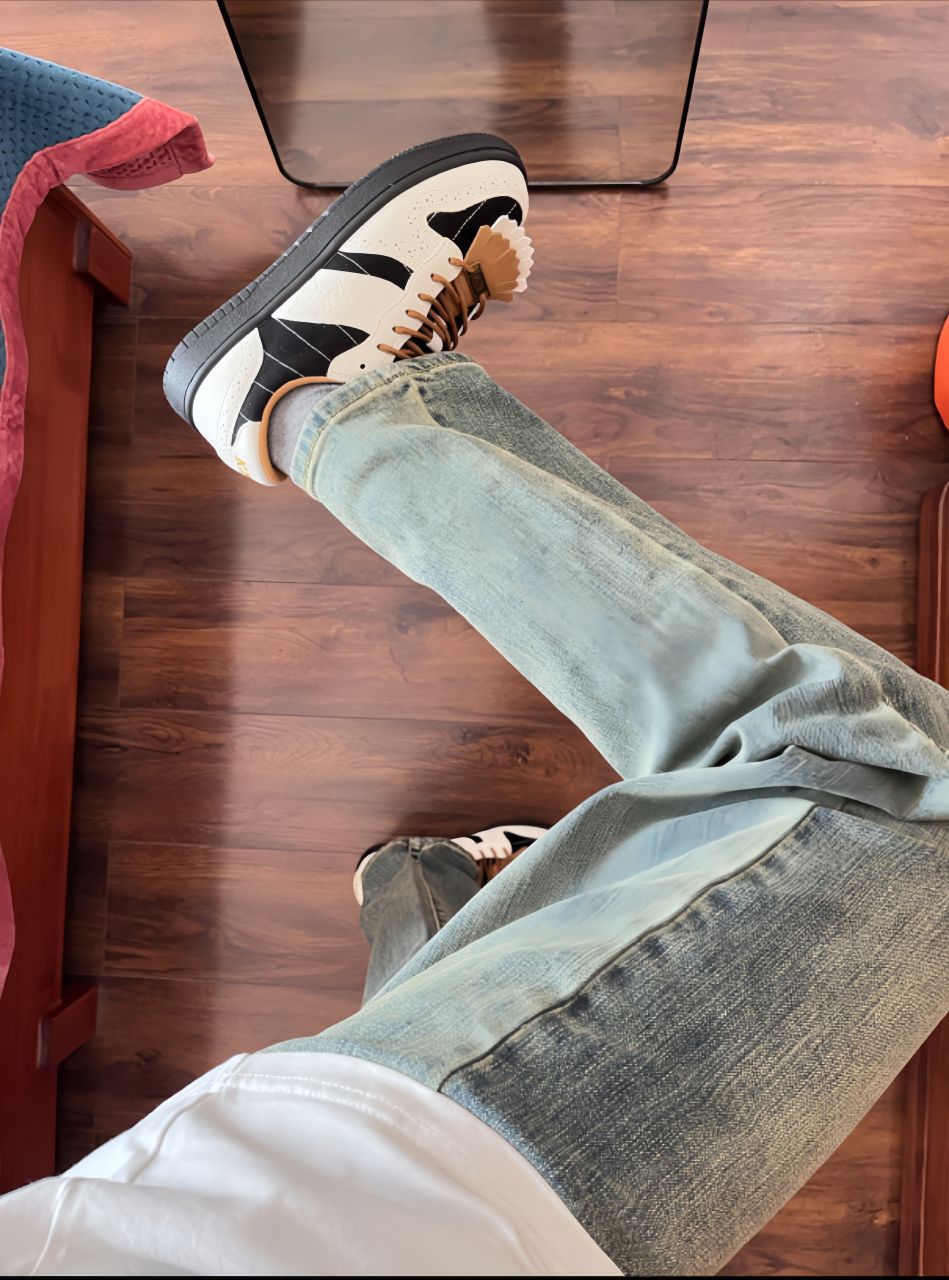 简约白T,邂逅复古浅蓝牛仔裤,经典碰撞。 脚下黑白配色板鞋,细节处的别致设计,为整体造型增添巧思。 这套穿搭,既有休闲随性的自在感,又不失时尚态度,轻松适配日常出行的多种场景 。