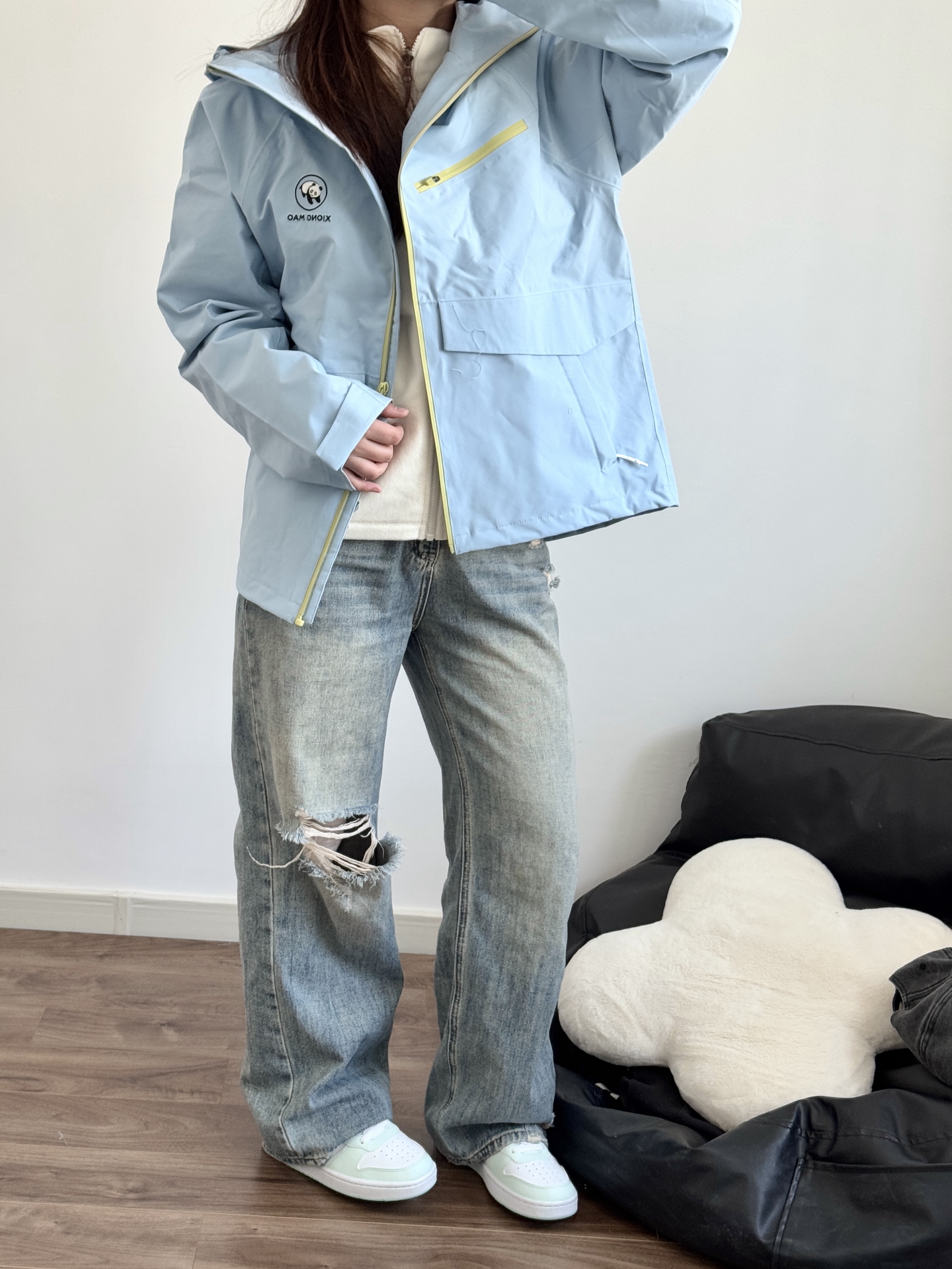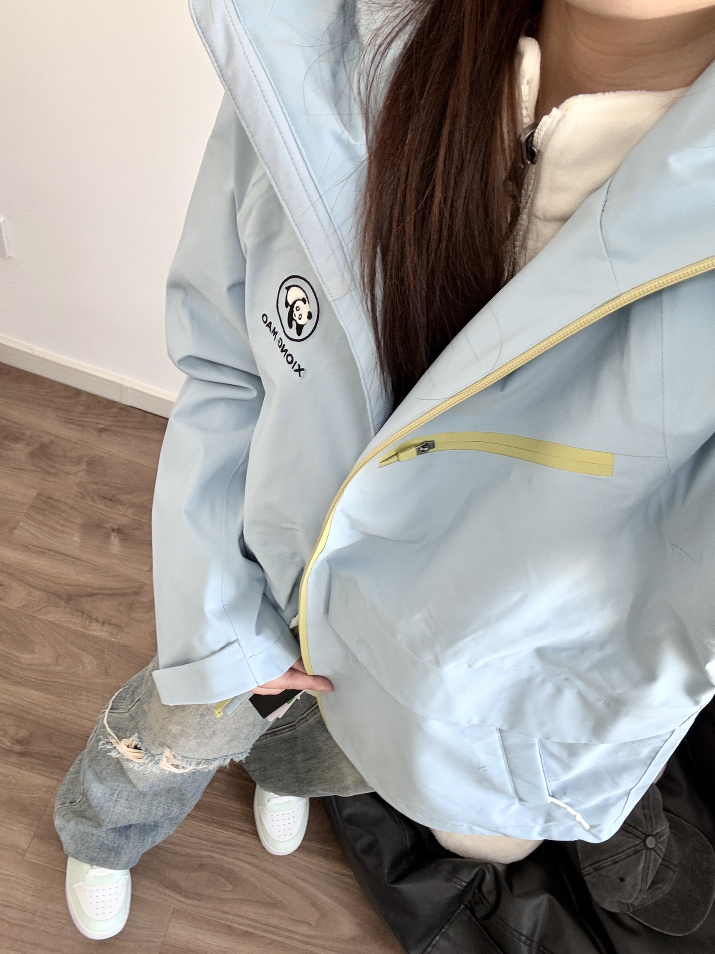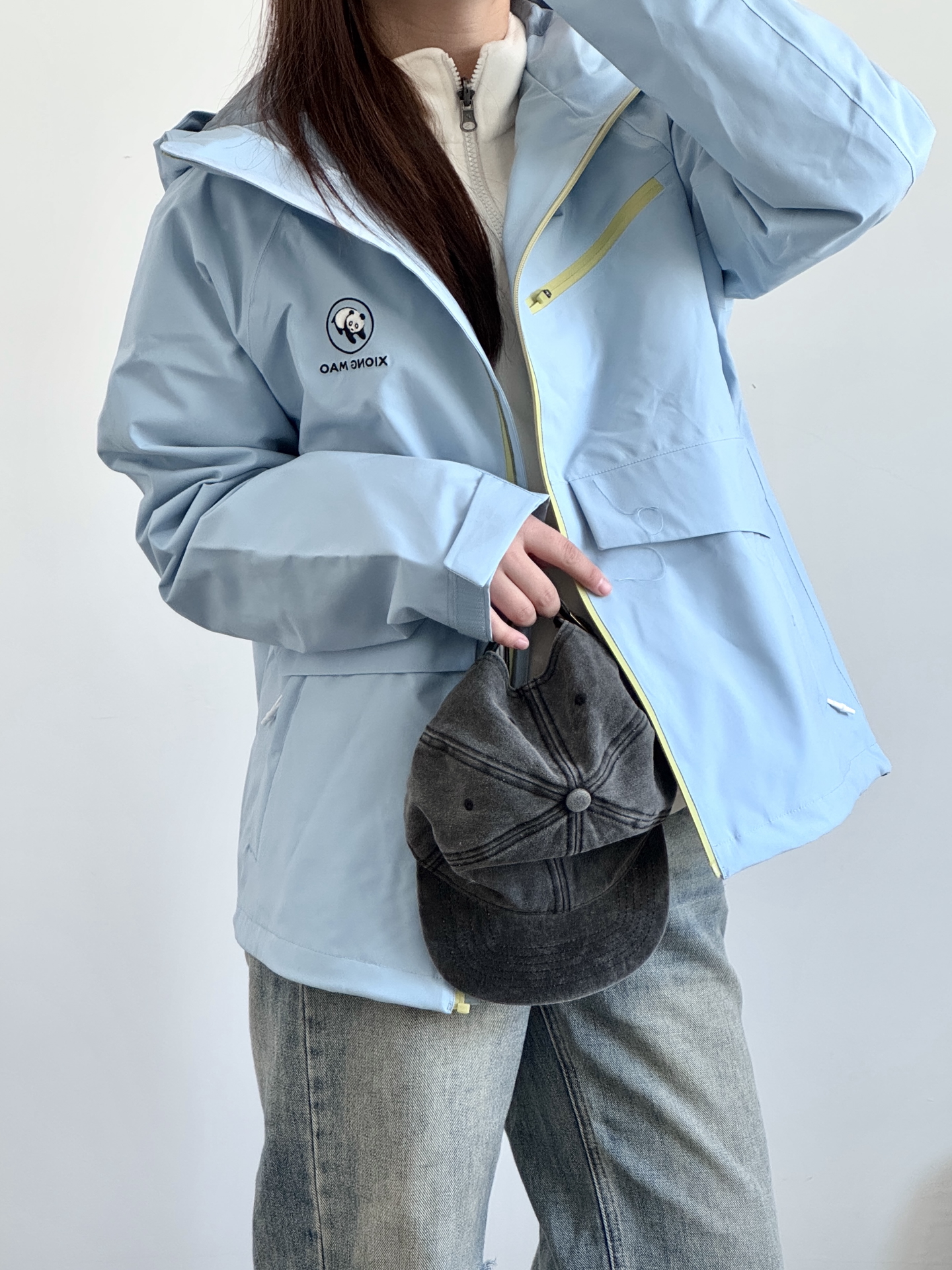 今天的蓝色系搭配很好看呀 熊猫硬糖系列冲锋夹克 立挺有型上身好帅气 去户外玩穿这个很合适 日常搭配牛仔裤就很好看! 我穿的M码比较宽松 去踏春我就穿这身啦~