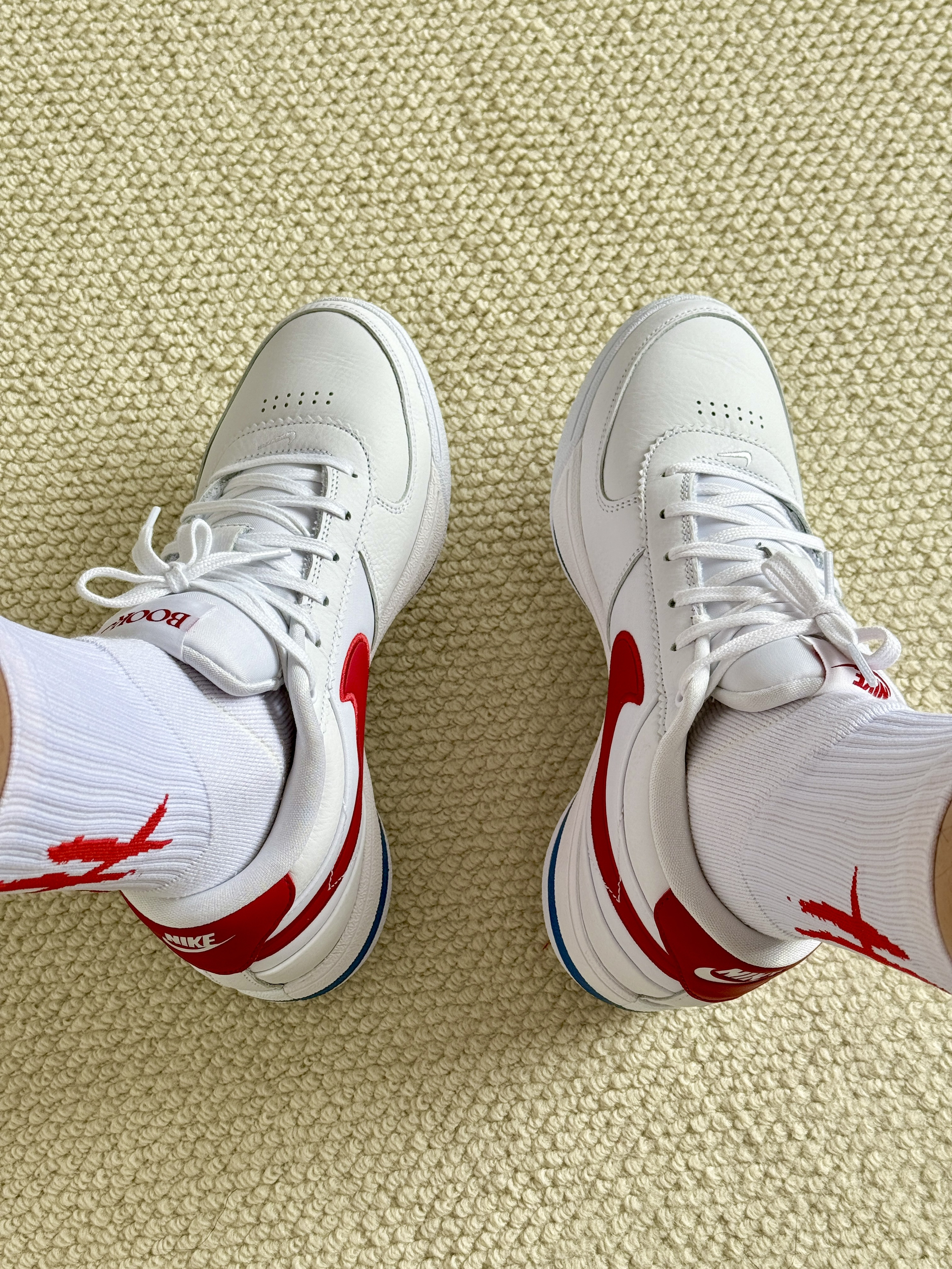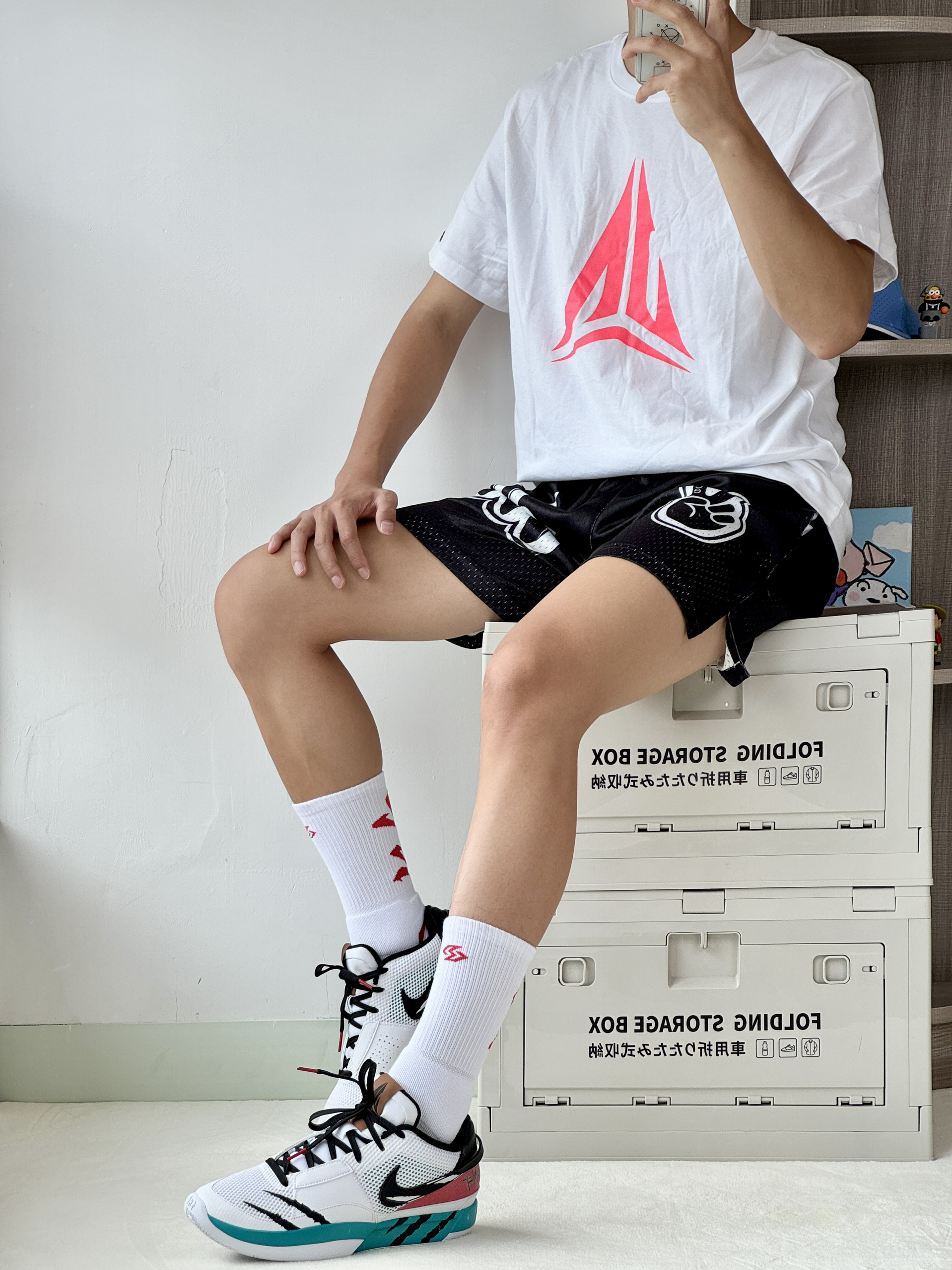 oi哈喽大家好这里是爱球鞋穿搭的小学生的故事 发现一双日常好搭配打球又好看的球鞋🤩 👔🩳选择一件红白色美式投篮服很有设计感搭配 一条白色短裤运动打球很OK 👟布克1阿甘白红蓝配色拥有板鞋的鞋型但它是一 双球鞋上脚尊嘟好帅打球休闲穿都很行!