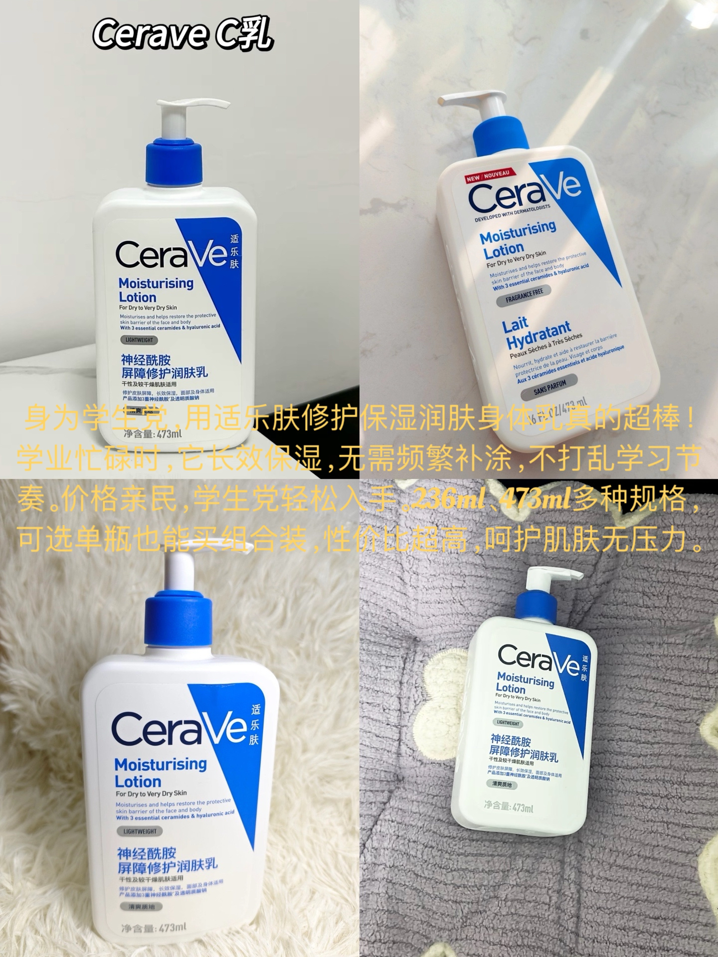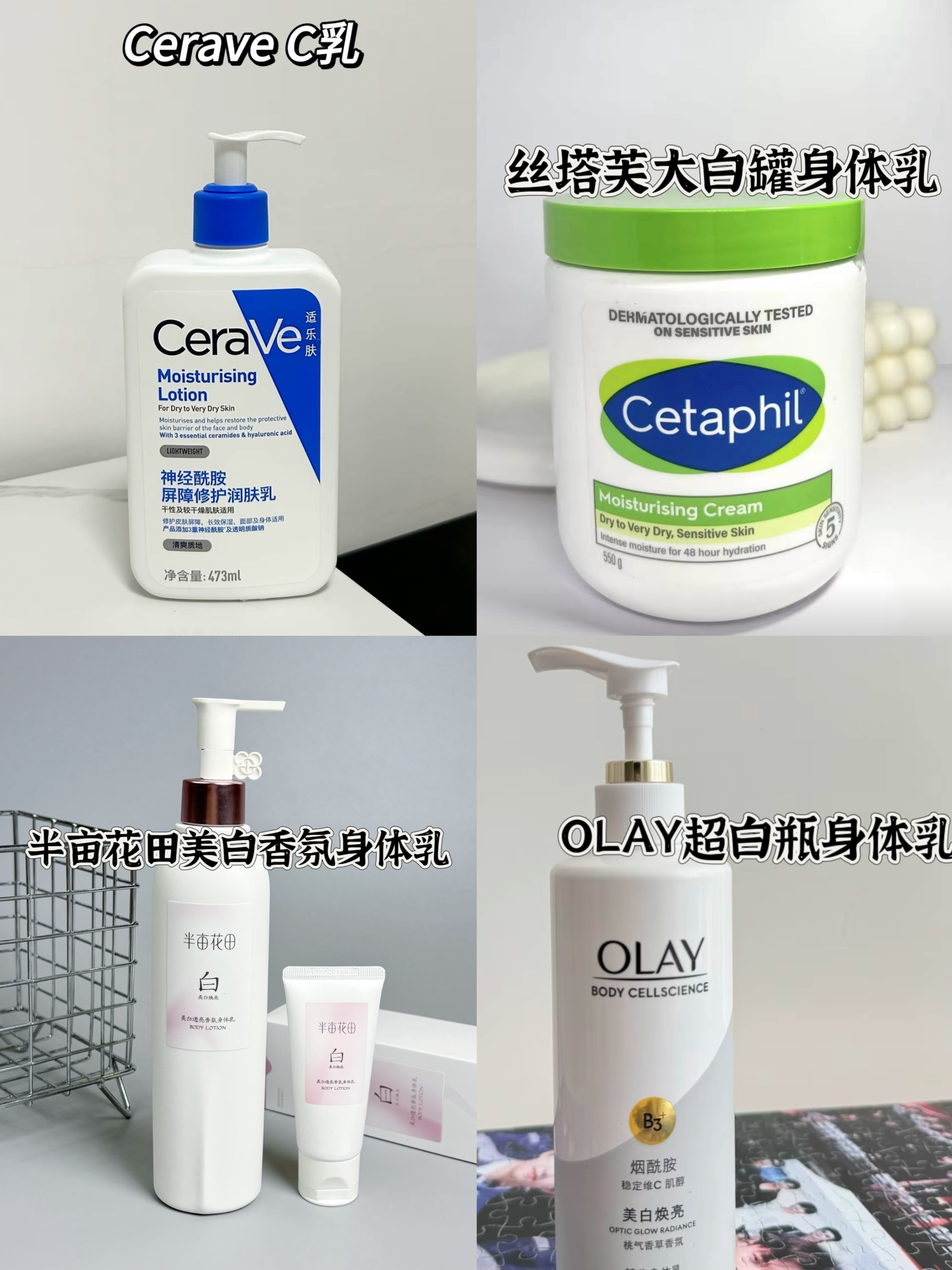 这四款身体乳,都是质地湿润细腻不油腻好吸收的,但是个人感觉适乐肤和丝塔芙性价比比较高,克数比较多,但是这两款身体乳没有太大的香味哦,特别是丝塔芙是一个纯正的无香味型身体乳,半亩花田和OLAY都是有不浓烈但是也不清淡的香味的,个人感觉OLAY在美白上比半亩花田更胜一筹,大家看个人需求,自行购买哦~对于送女朋友的男生,个人建议选择有香味的,每次洗完澡涂身体乳的时候都会想起来你哦,而且带着你选的淡淡香味...