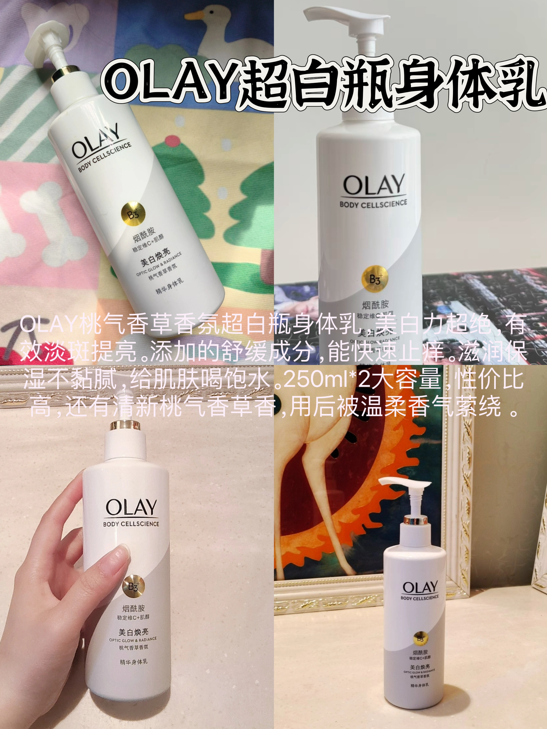 本篇笔记关联了【第一代】Olay/玉兰油 经典超白瓶身体乳 含烟酰胺美白抗氧留香 秋冬滋润保湿防干燥 桃气香草香氛、丝塔芙 保湿滋润身体乳套装 大白罐不含烟酰胺宝宝树获奖 453g+550g等商品,为用户提供真实的使用体验和购买参考。