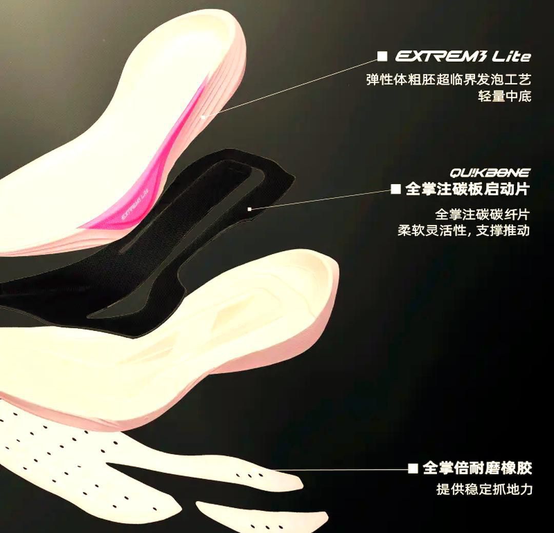 中底设计:飞飚ET采用双密中底设计,结合了EXTREME LITE科技和QUICKBONE科技。中底厚度前掌为27.5mm,后掌为34.5mm,整体鞋重约为277克(42)。这种设计提供了良好的缓震效果和能量反馈 碳板技术:飞飚ET配备了全掌碳板,这有助于提升推进力和稳定性。尽管碳板的存在感不强,但在长距离跑步中仍能感受到其支撑作用。 缓震性能:飞飚ET采用了粗胚发泡技术,这种技...