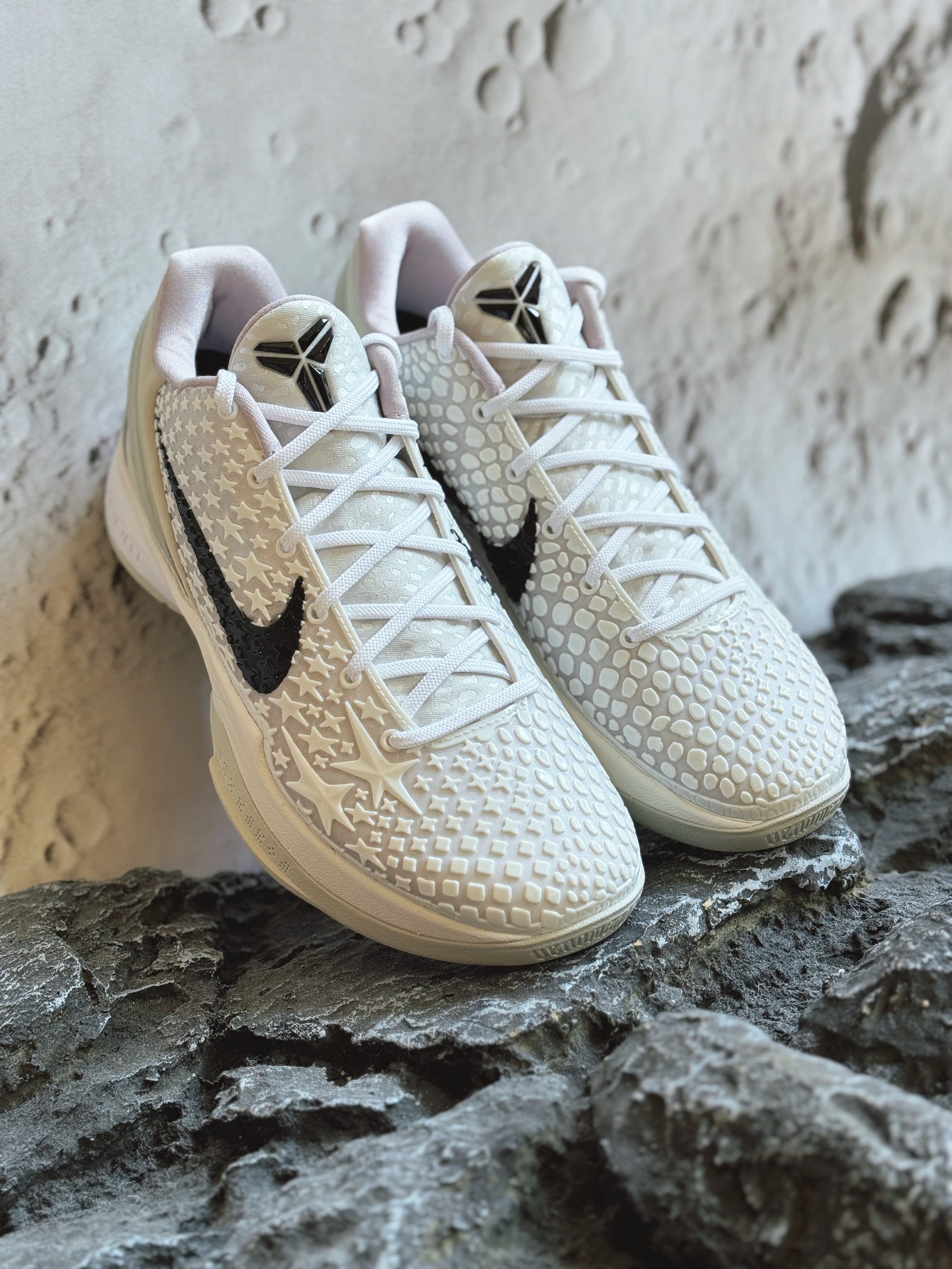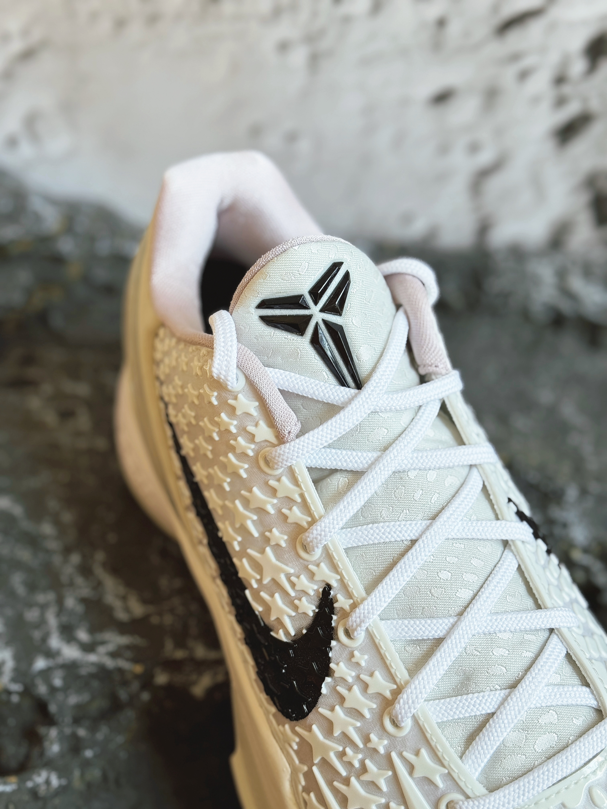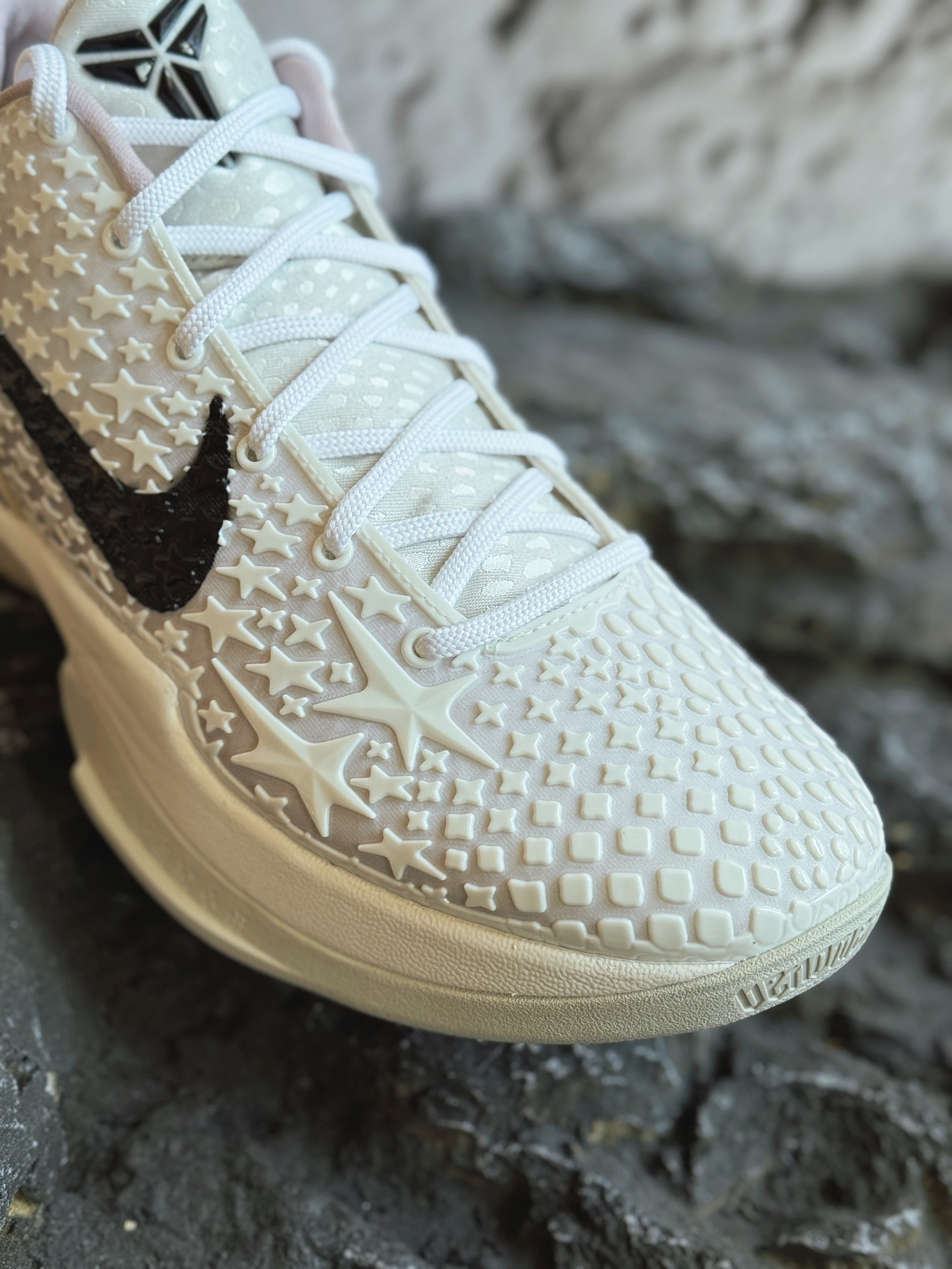 起初从曝光的图片来看 其实对这双科比6并无感!但拿到实物颜值还是不错的 很好搭配! 鞋子盐白色感觉有种做旧的感觉!最特别的就是鞋面的蛇鳞纹路换成了星星图案 很符合全明星的气氛!搭配的黑色swoosh也恰到好处! 不过作为实战鞋来说性价比不高 相对而言我会更加期待那双“道奇”配色!