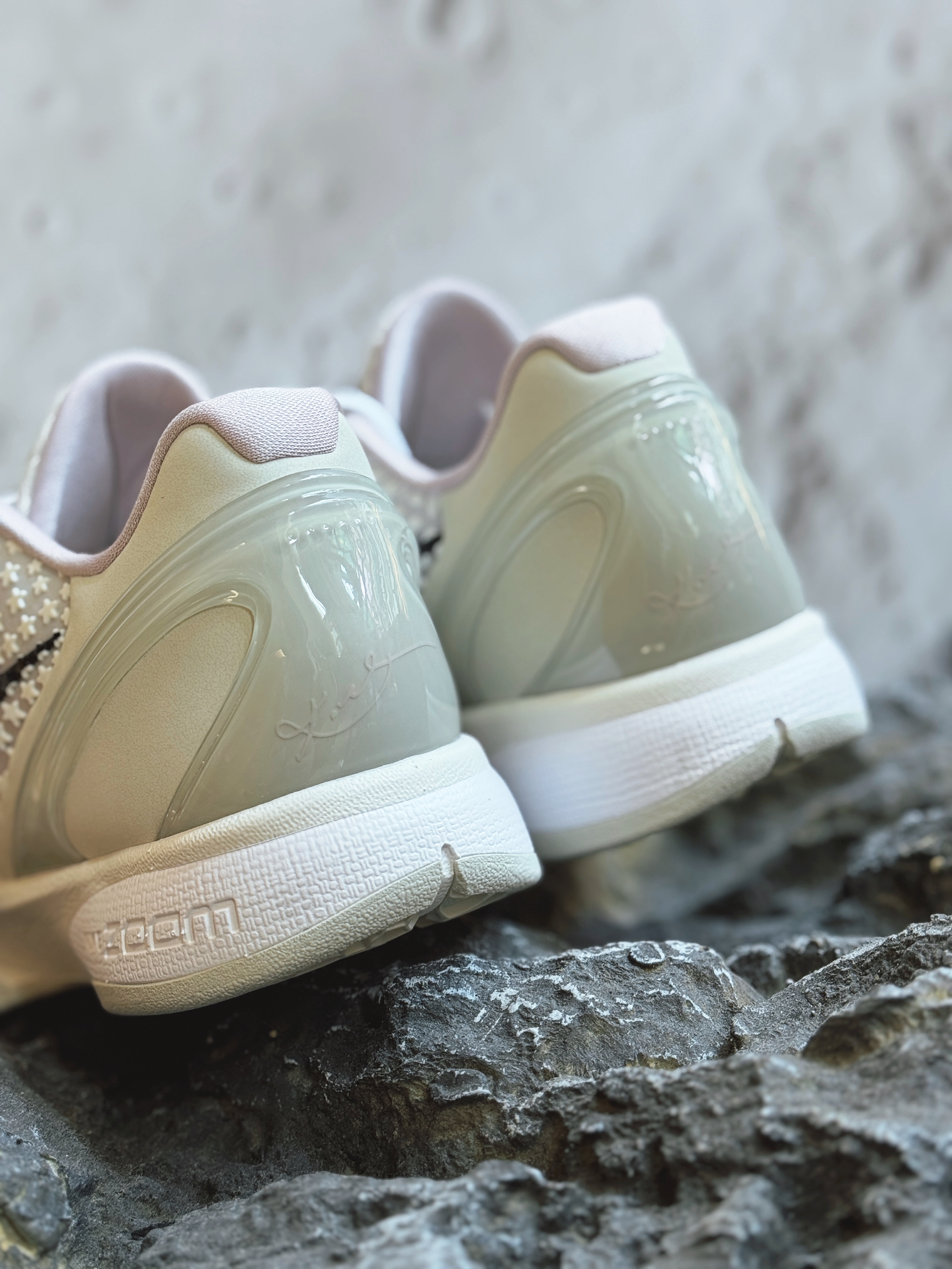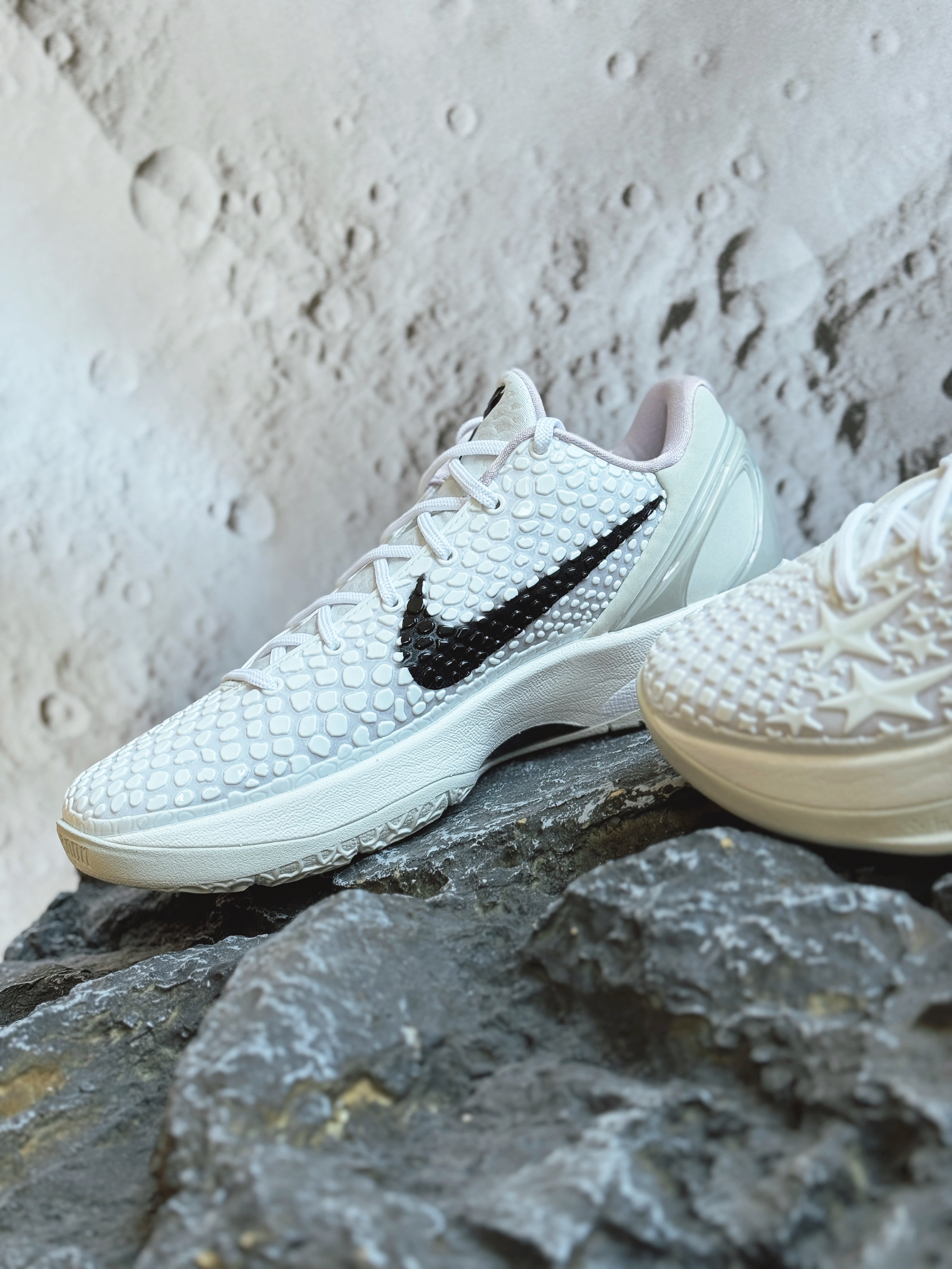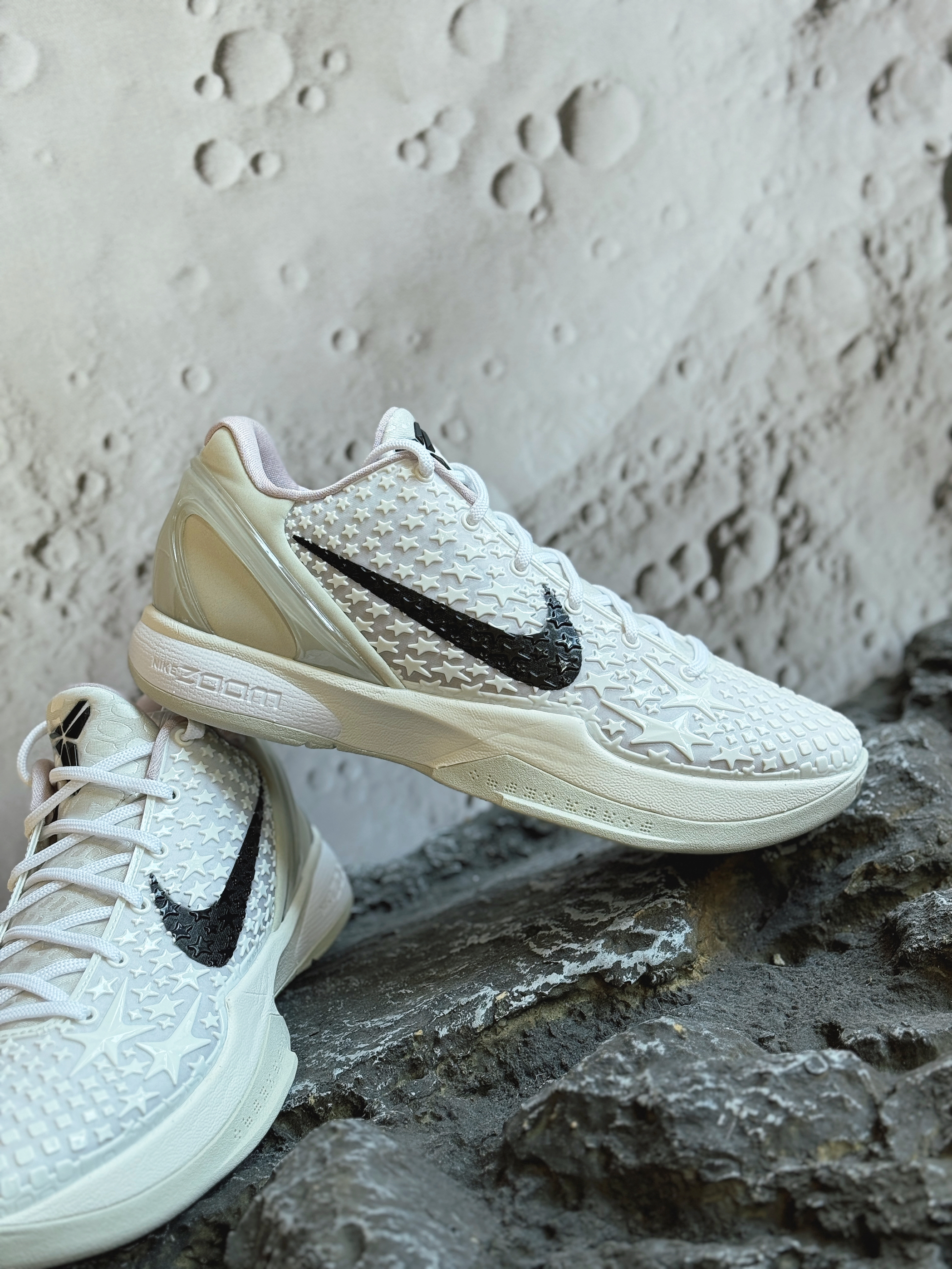 起初从曝光的图片来看 其实对这双科比6并无感!但拿到实物颜值还是不错的 很好搭配! 鞋子盐白色感觉有种做旧的感觉!最特别的就是鞋面的蛇鳞纹路换成了星星图案 很符合全明星的气氛!搭配的黑色swoosh也恰到好处! 不过作为实战鞋来说性价比不高 相对而言我会更加期待那双“道奇”配色!