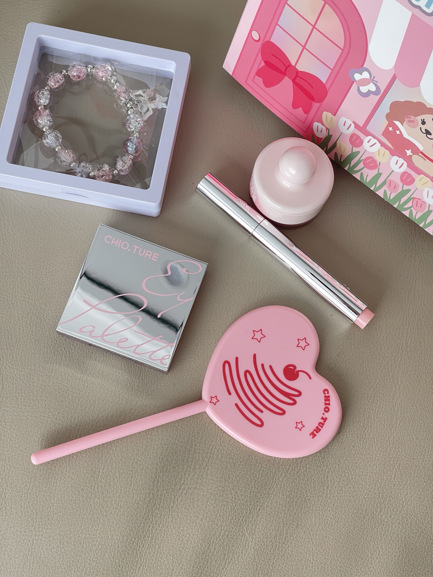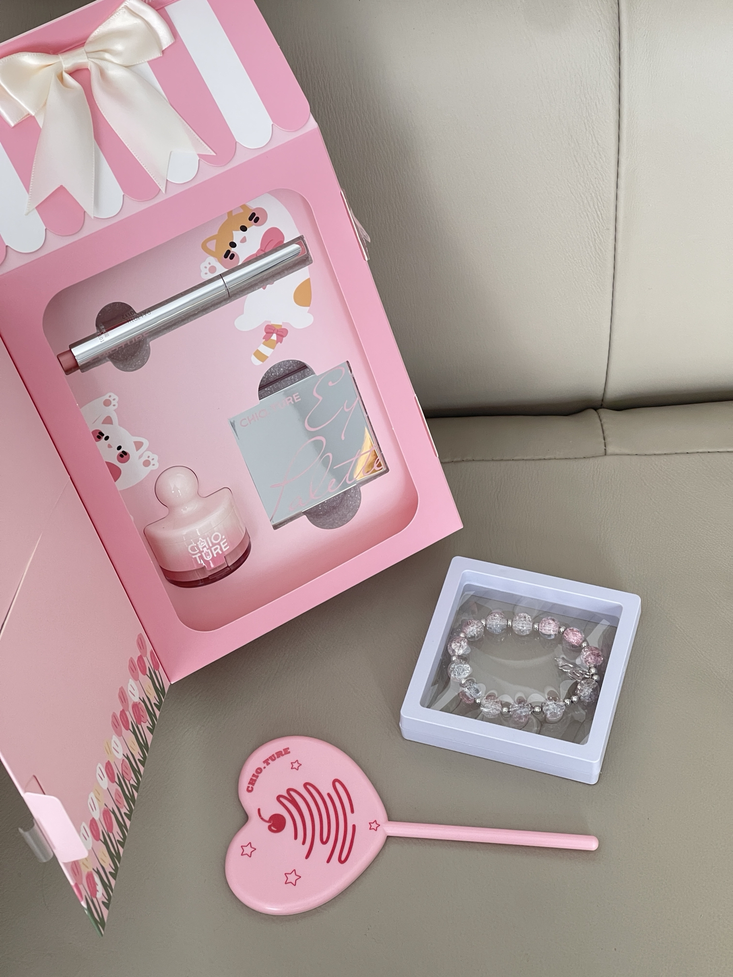 小稚尊滴有被美到捏 介个玫瑰甜酪尊嘟吼吼看 里面有固体唇蜜 卧蚕盘 罐罐腮红 还送了小手串和可爱的手持镜捏 包装尊嘟吼可爱呀 情人节快到了 感觉送npy蛮不错的捏