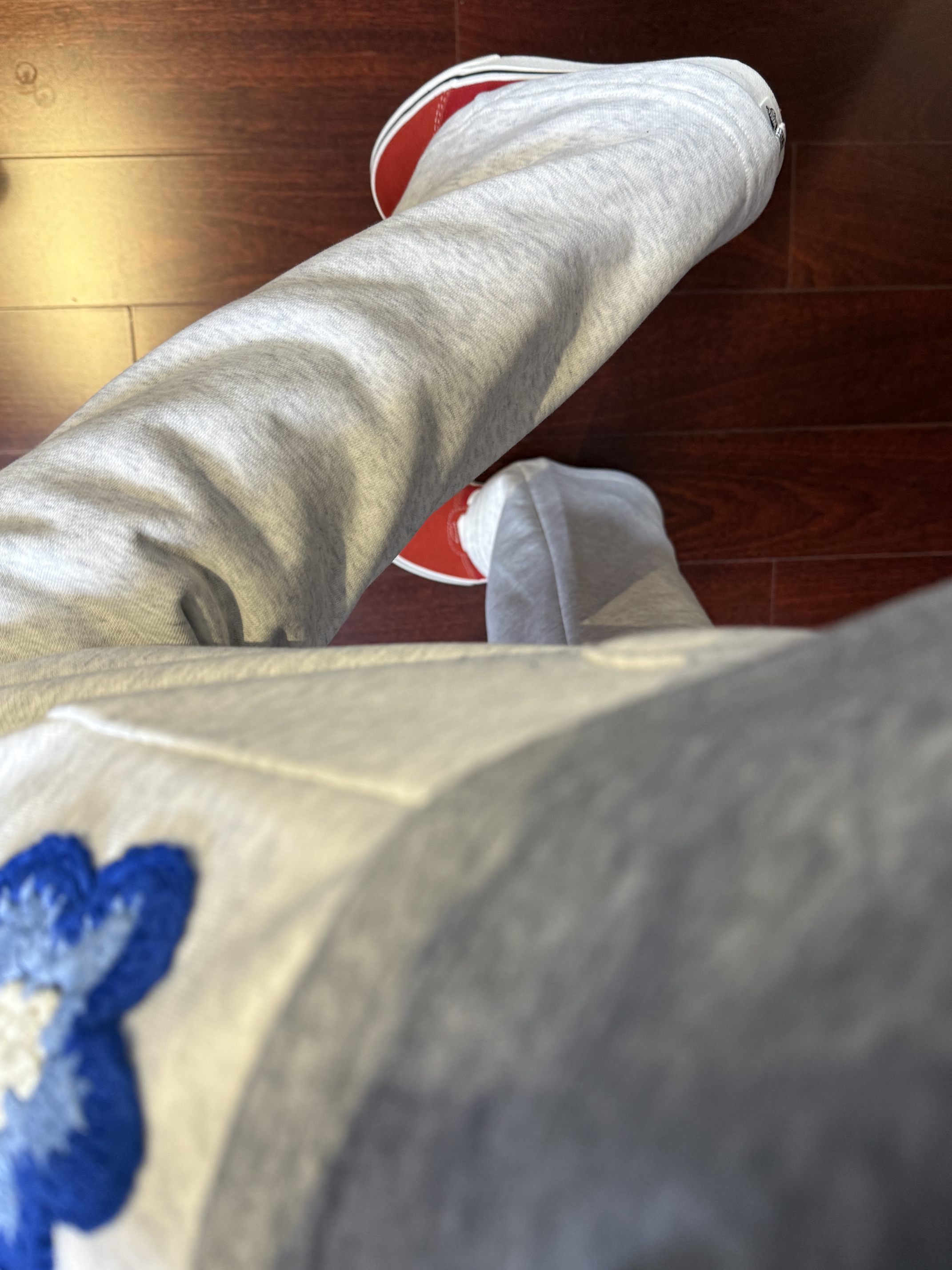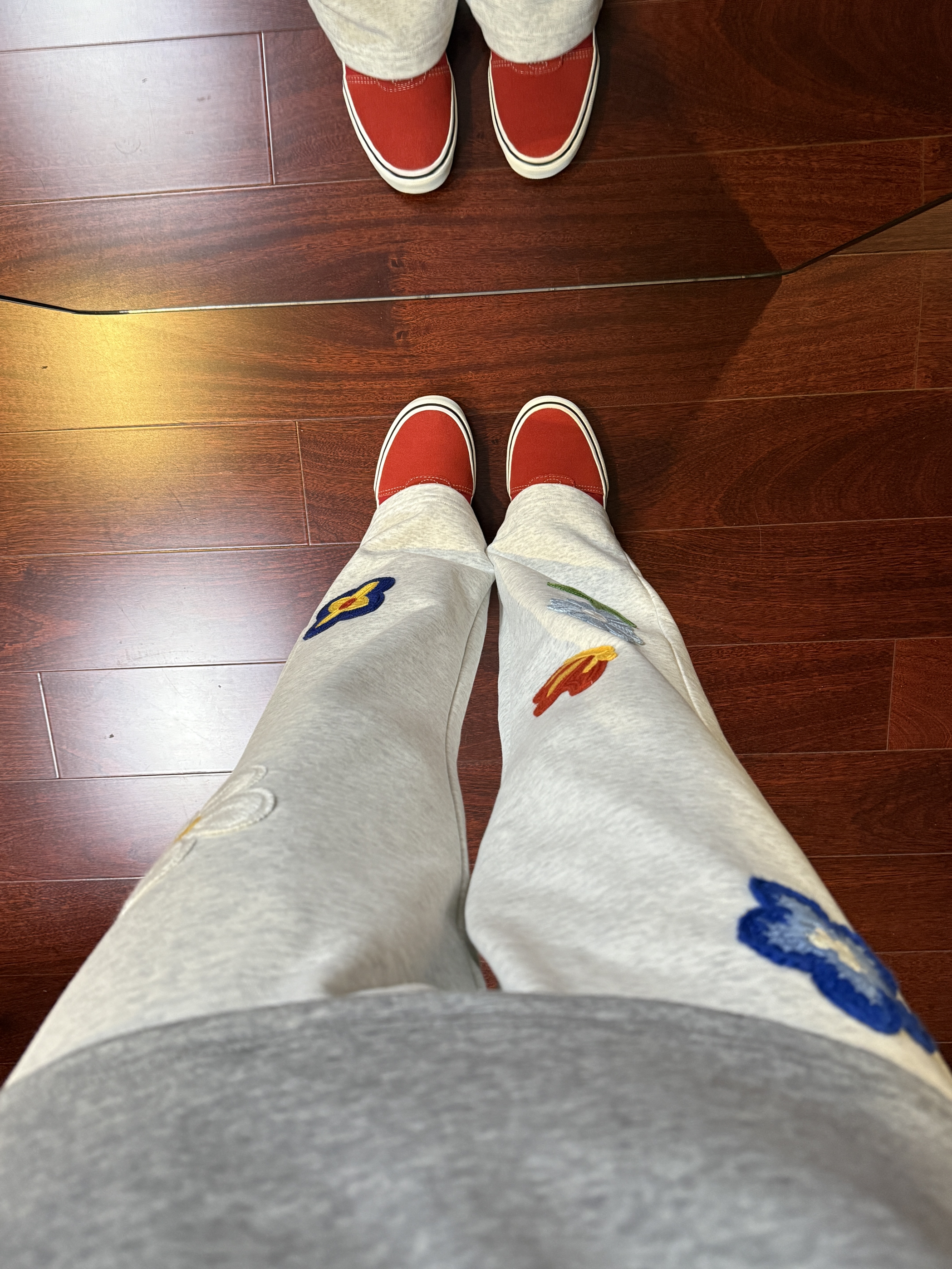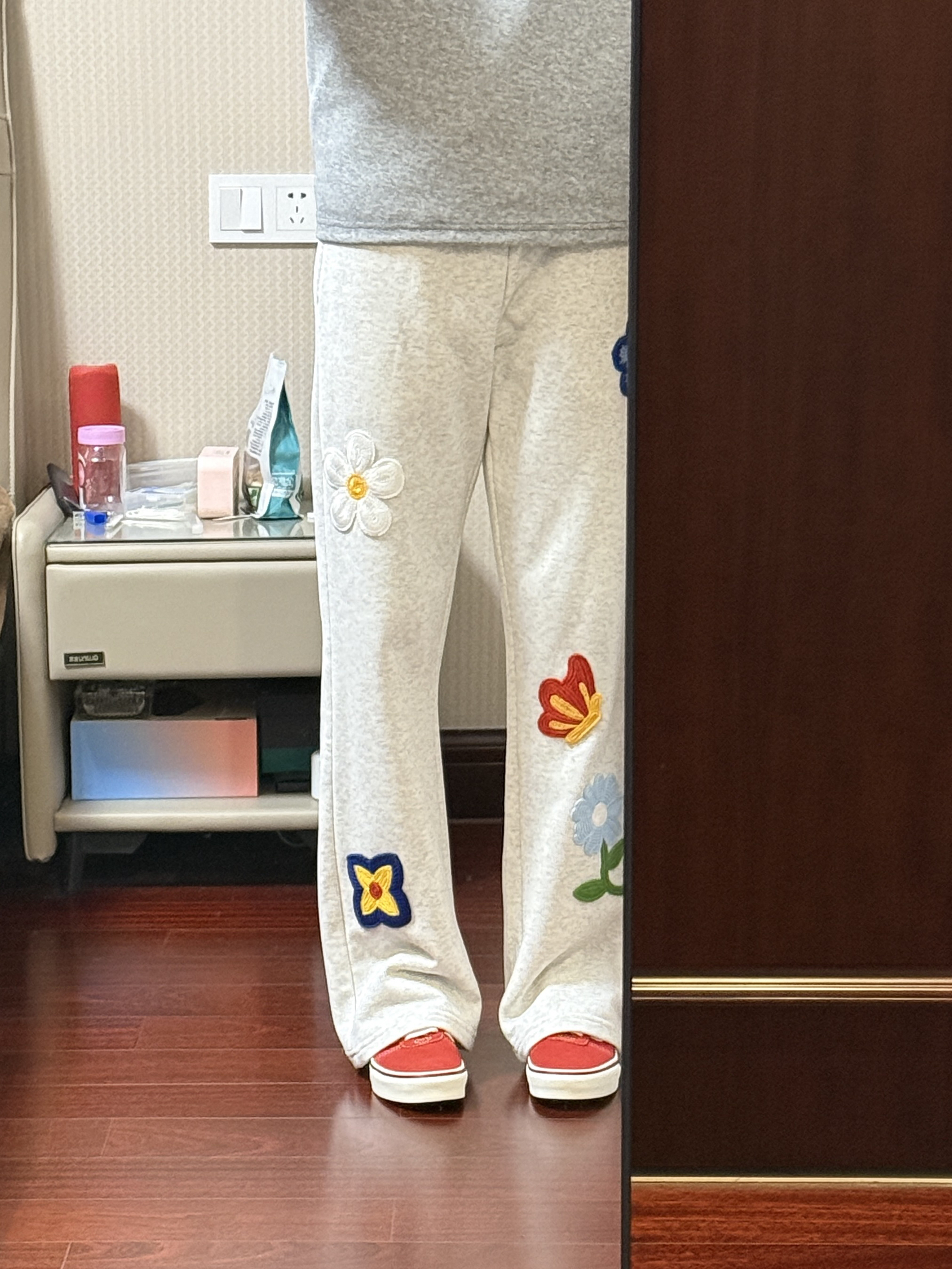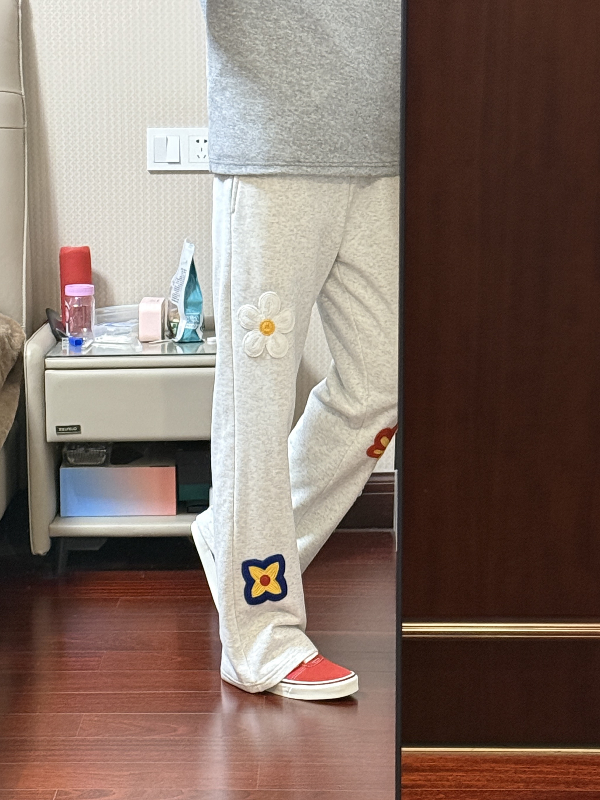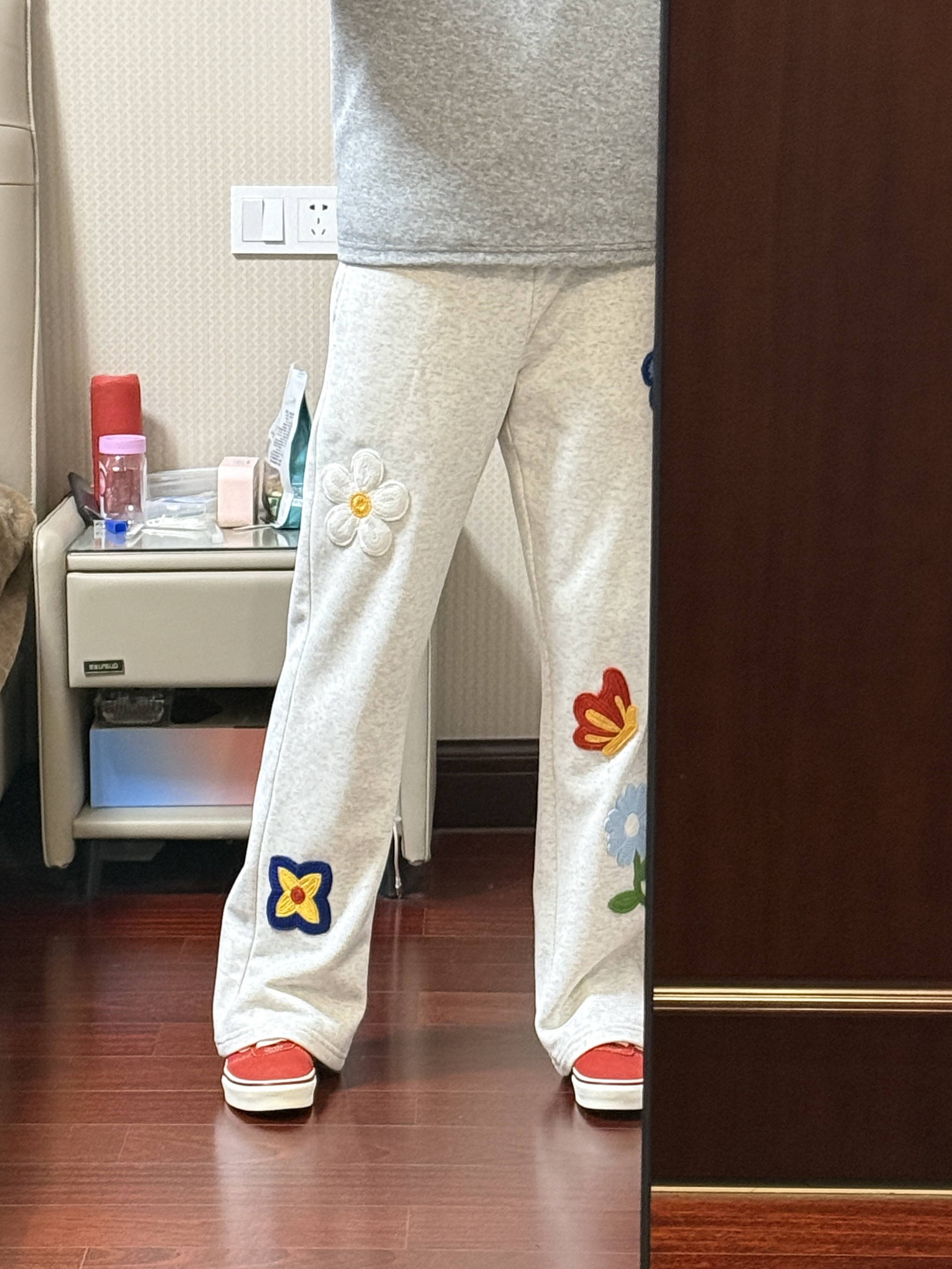 WOW!让我找到一条好裤!不愧是我熬夜选的!这款灰色花卉刺绣卫裤真的太帅了!我搭配了一双红色帆布鞋真的好看!直筒版型显高显腿长,男女穿都好看,谁能不喜欢这种灰色花朵刺绣卫裤啊!