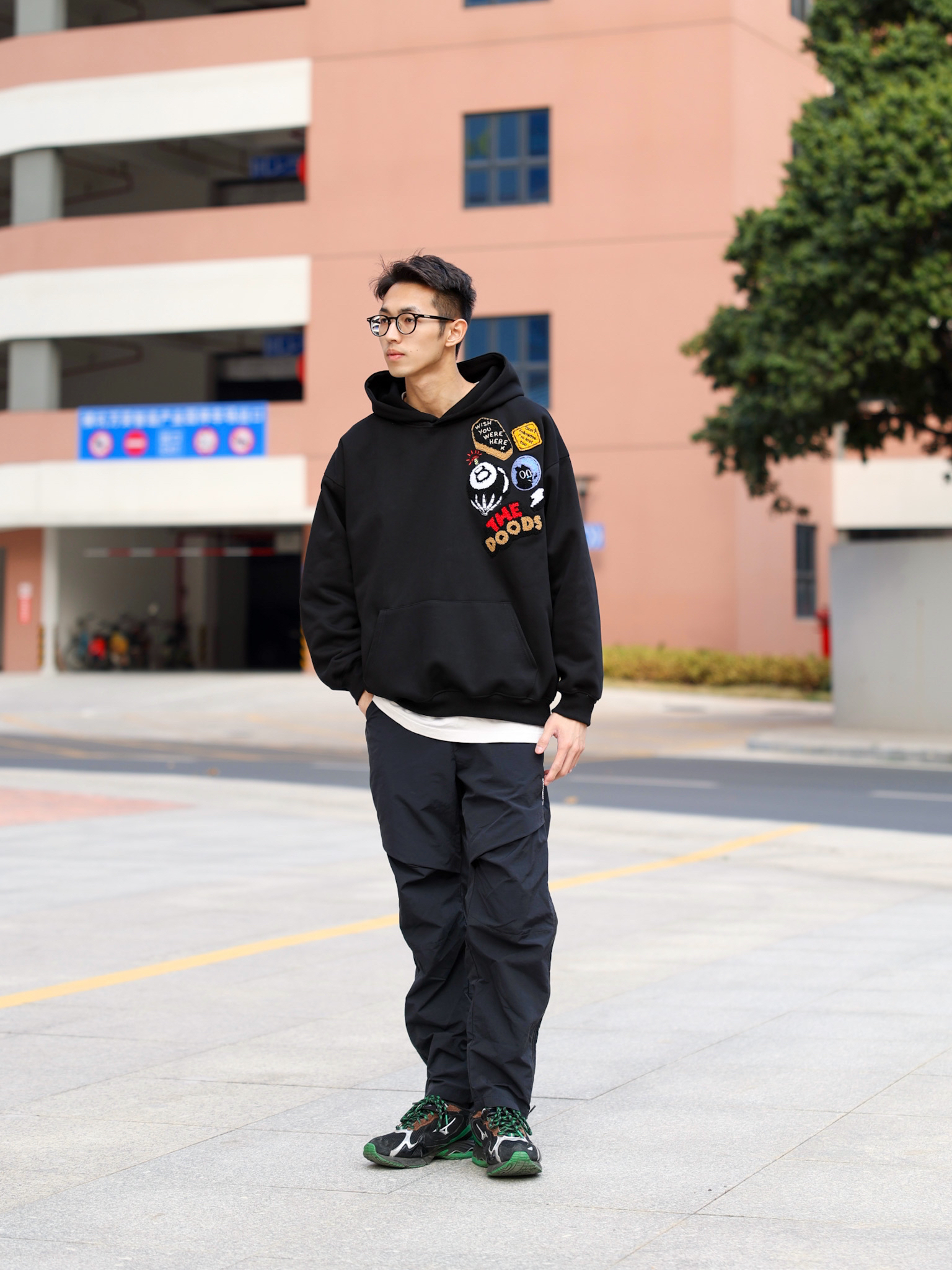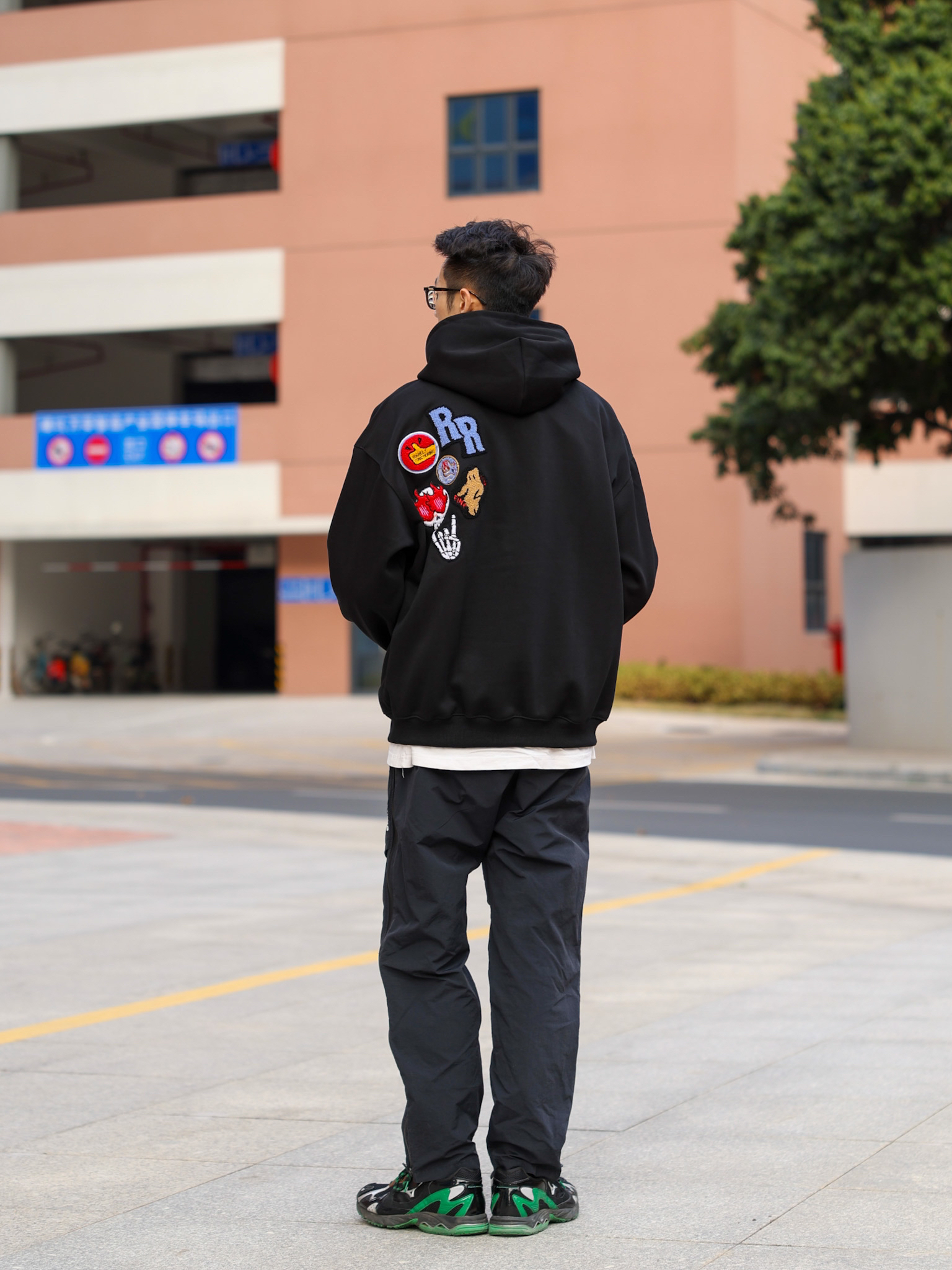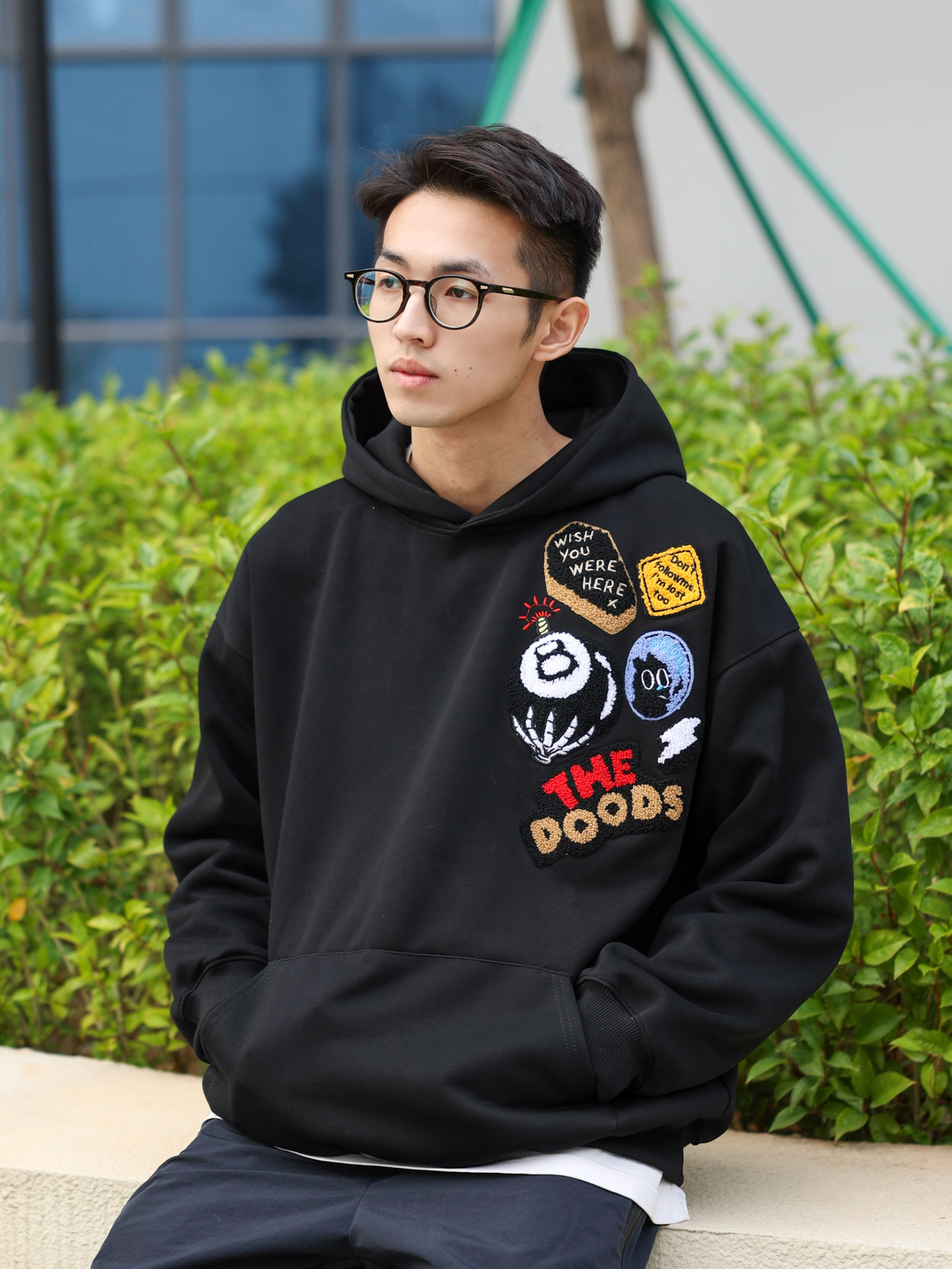 今天来给大家分享一套春季休闲风穿搭,这种气温穿卫衣再适合不过了,上身一件黑色卫衣,胸前刺绣植绒徽章设计也是满满的休闲复古风,搭配一条黑色拉链裤和休闲运动鞋就可以啦!