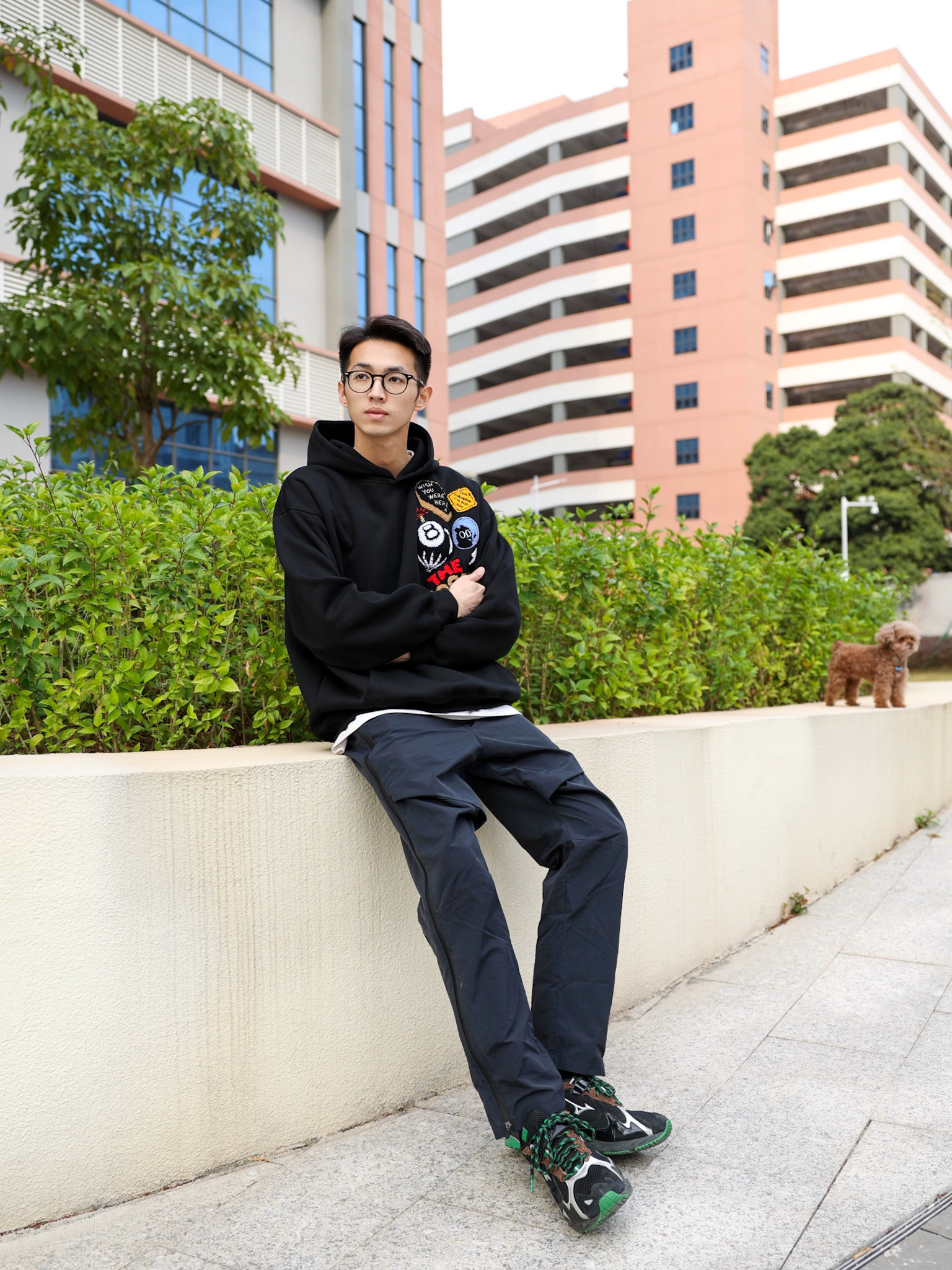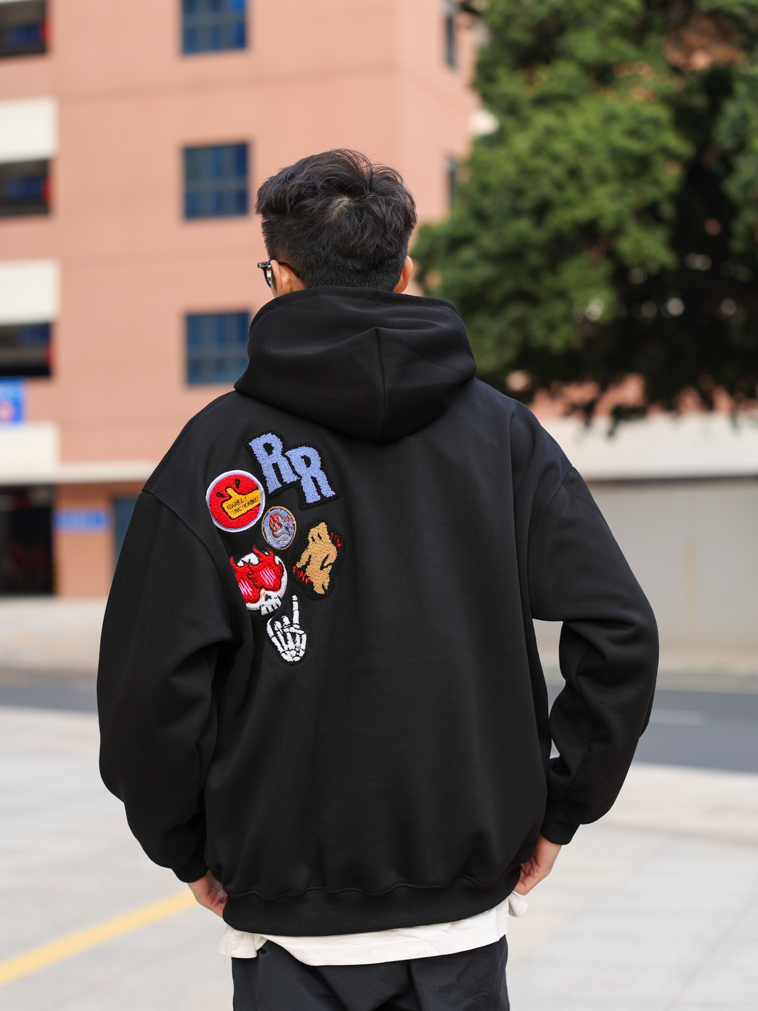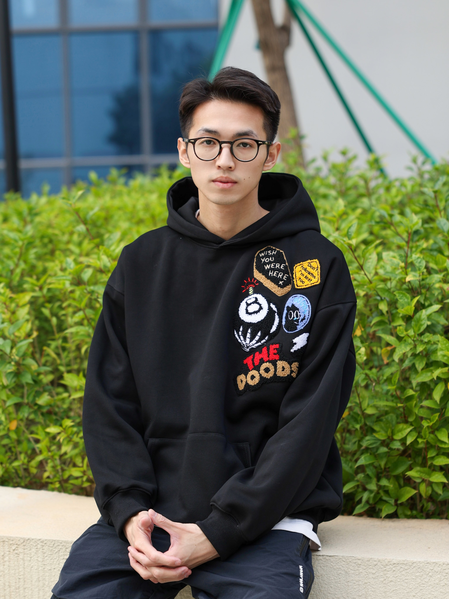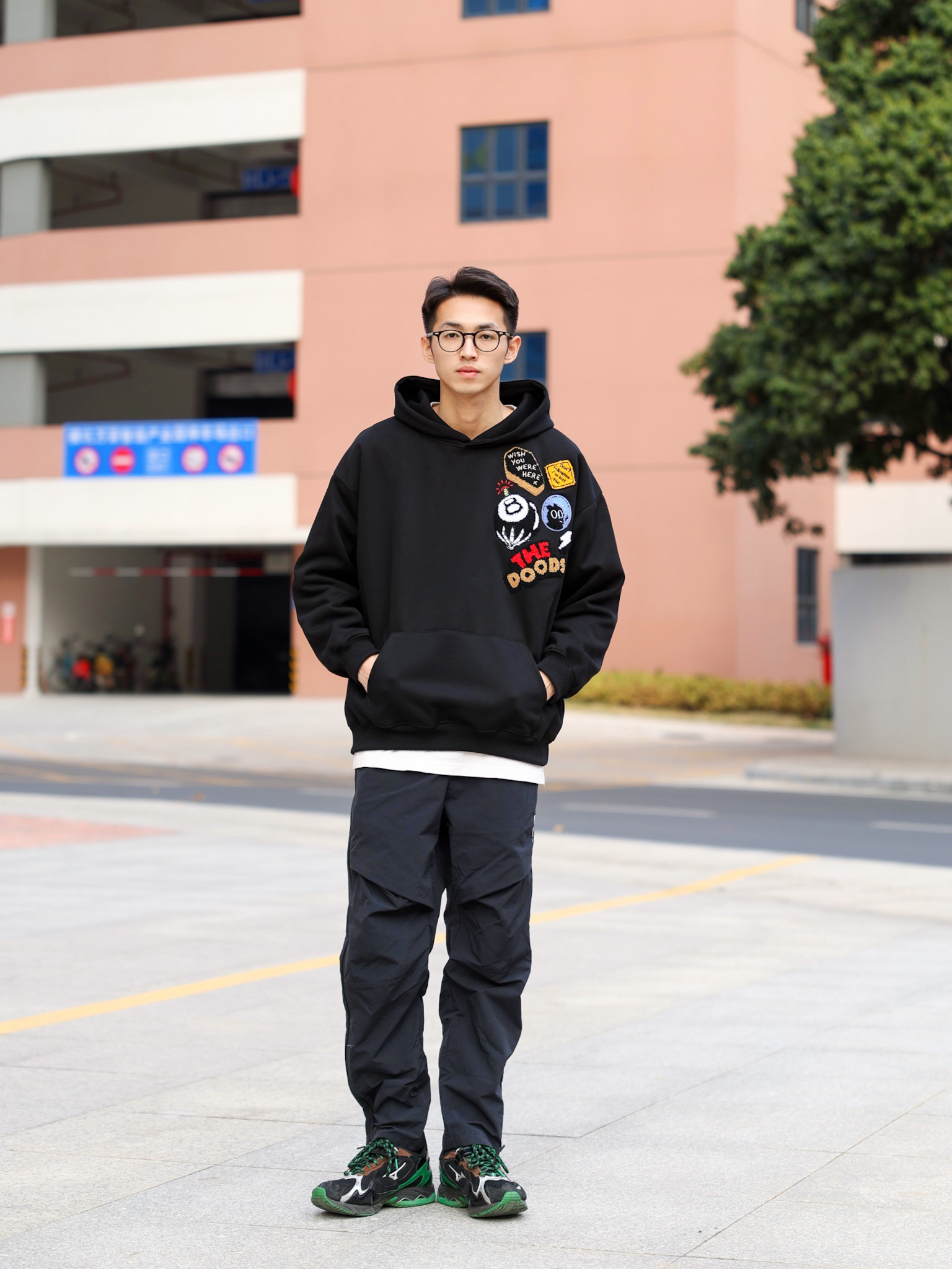 今天来给大家分享一套春季休闲风穿搭,这种气温穿卫衣再适合不过了,上身一件黑色卫衣,胸前刺绣植绒徽章设计也是满满的休闲复古风,搭配一条黑色拉链裤和休闲运动鞋就可以啦!