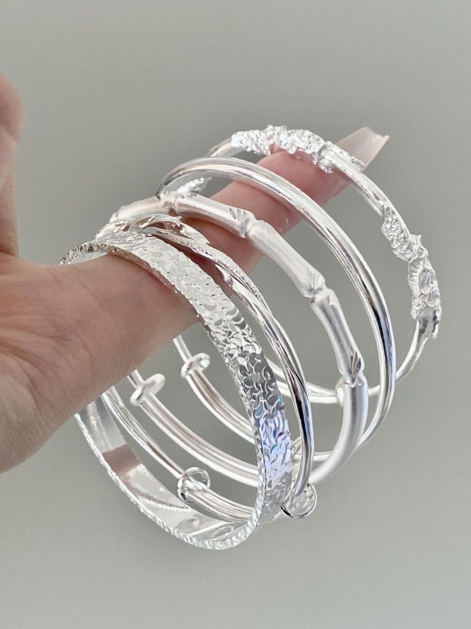 莫比乌斯环手镯 独特的扭曲造型,线条流畅,充满了设计感 节节高升手镯 一节一节的设计别致又新颖。 繁花似锦手镯 一朵朵精美的花朵紧密相连,很有氛围感 满天星手镯 星星点点的装饰, 在阳光下闪闪发光,很好看 光面素圈手镯 简约而不失大气,纯粹又百搭。