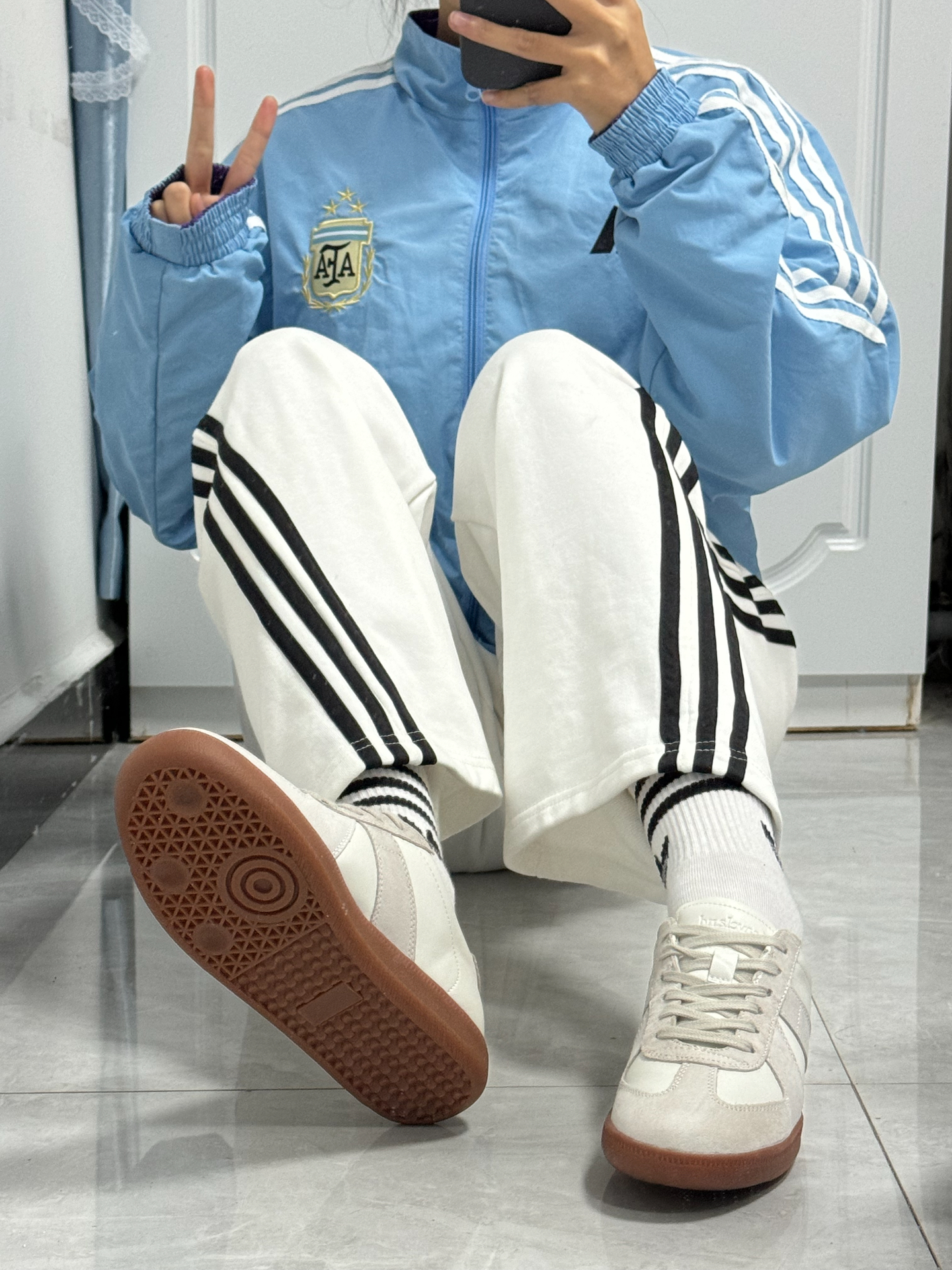 阿迪蓝色外套颜色好好看 布料很防风暖和❗️ 搭配白色直筒裤我很喜欢 鞋子是 #LEAVELAND 的德训鞋 灰白色配色简约大方✅ 里面还有一层薄薄的绒 冬天穿上舒服又暖和 图源网络,侵删!