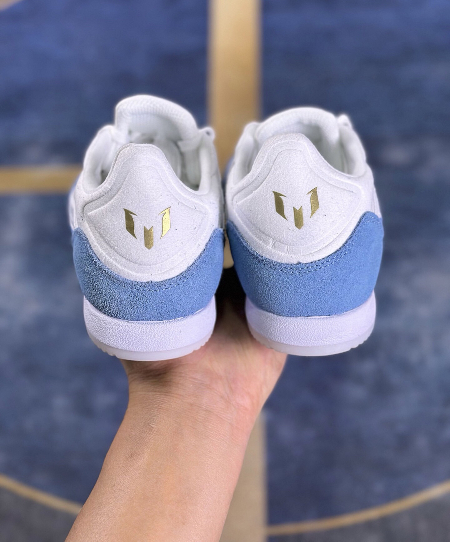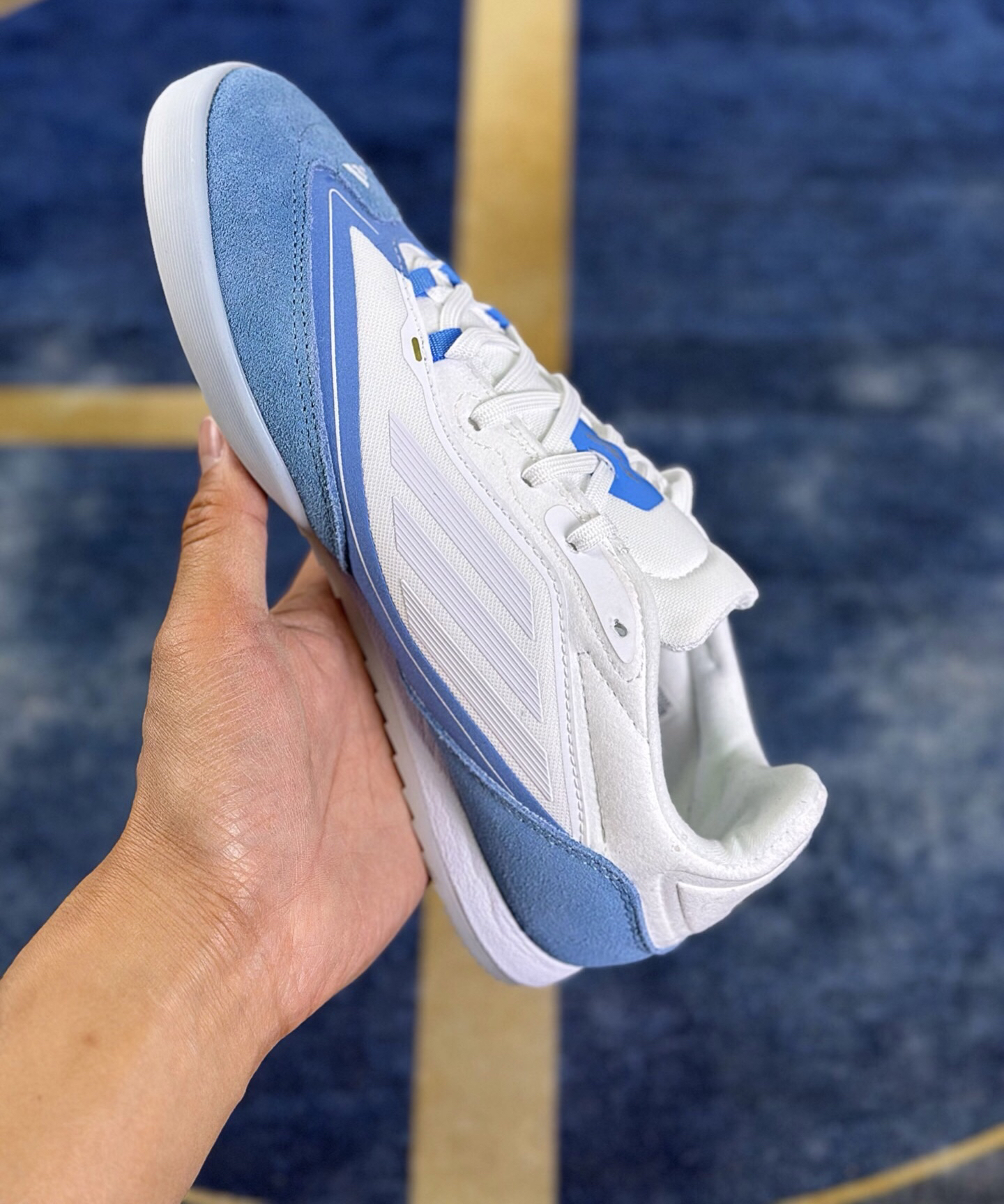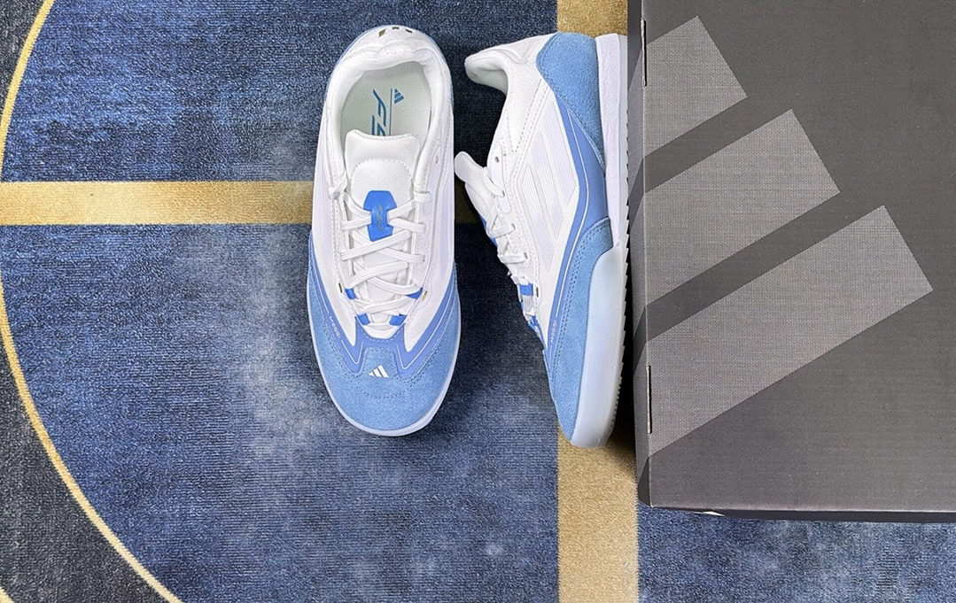 这款减震足球鞋鞋头和后套是蓝色麂皮和白色编织布,鞋底脚后掌有PU减震材质,堪称足球鞋中的跑鞋。