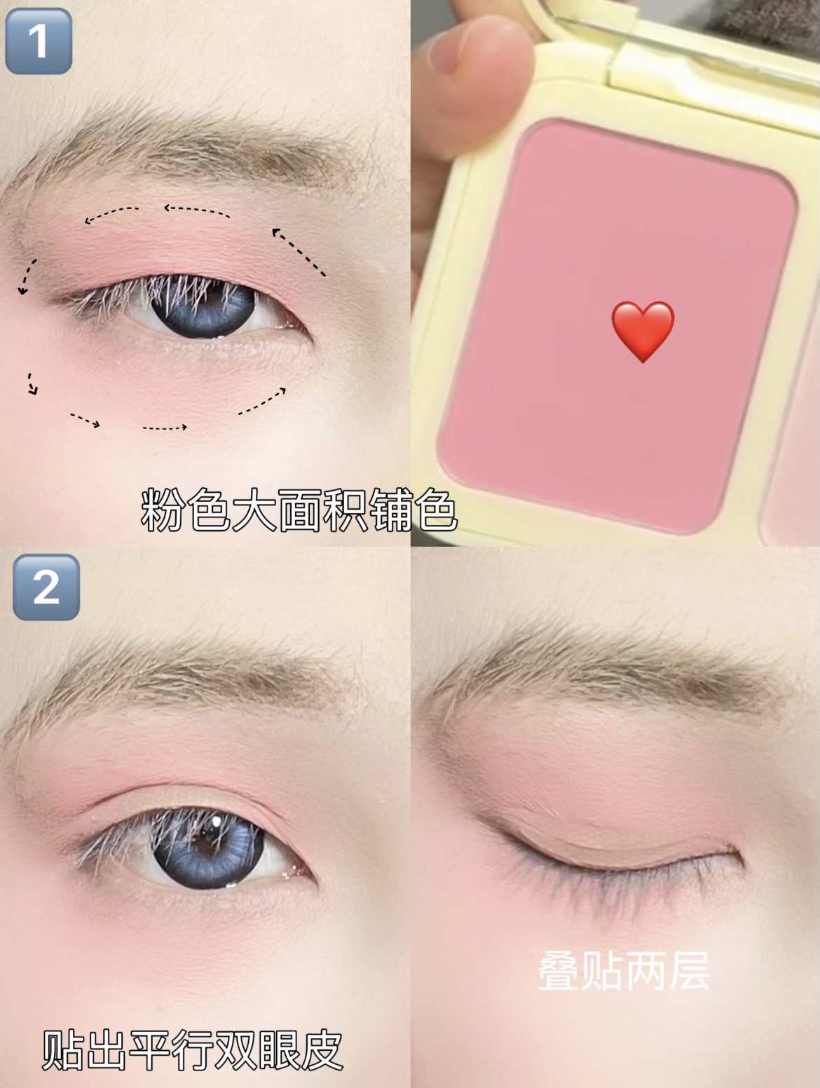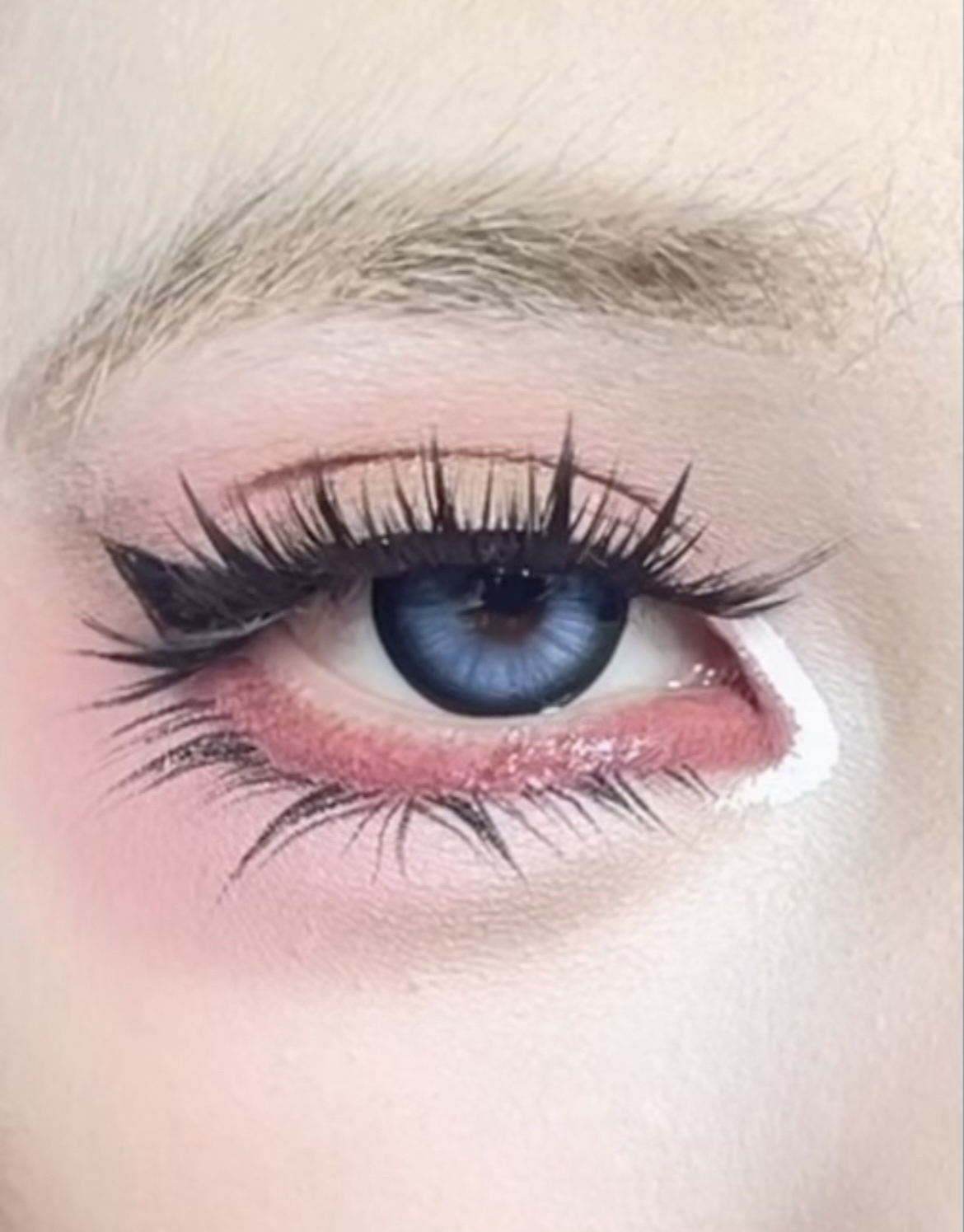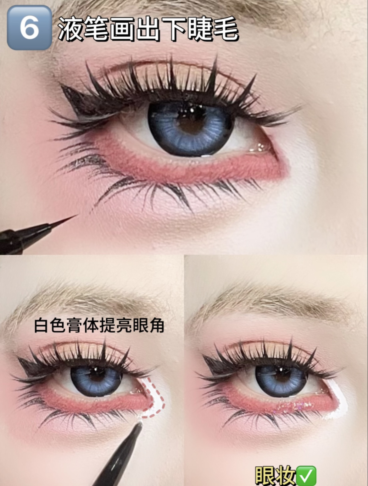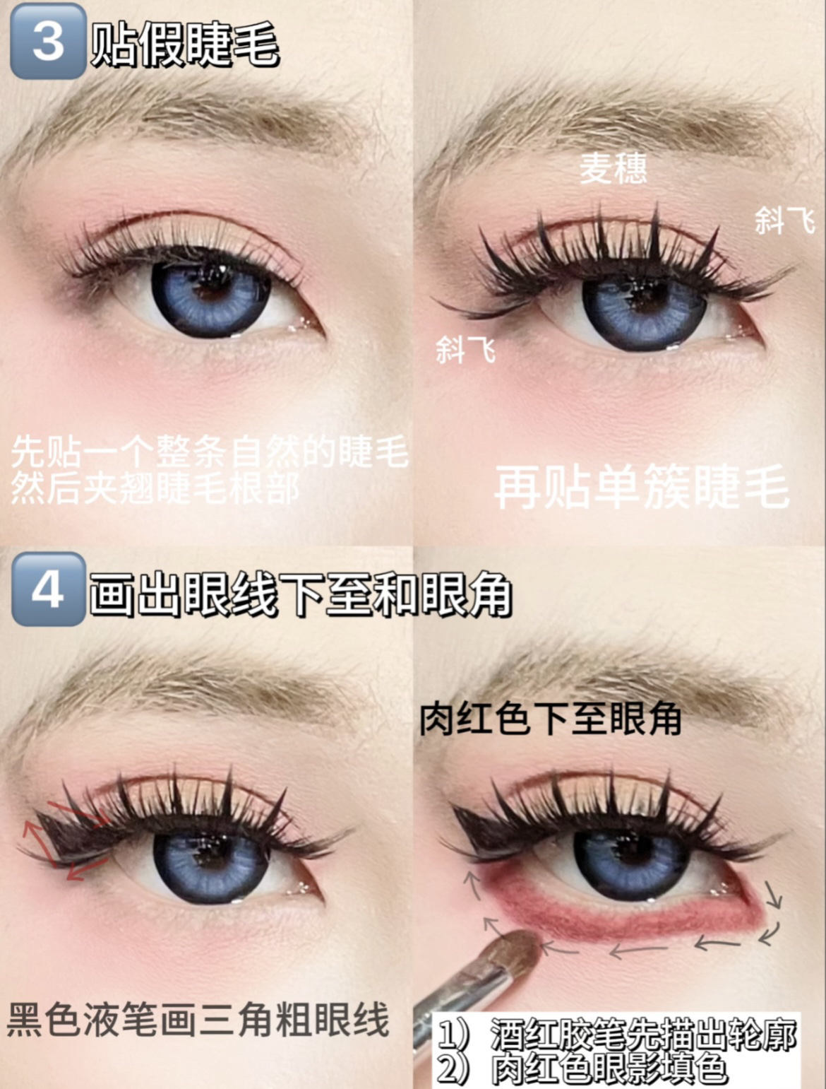 蔷薇色腮红给眼部大面积晕染铺色 然后贴出平行的双眼皮 再贴斜飞和麦穗睫毛 肉红色眼影画出下至 再画一个大卧蚕 拿出眼线液笔画下睫毛