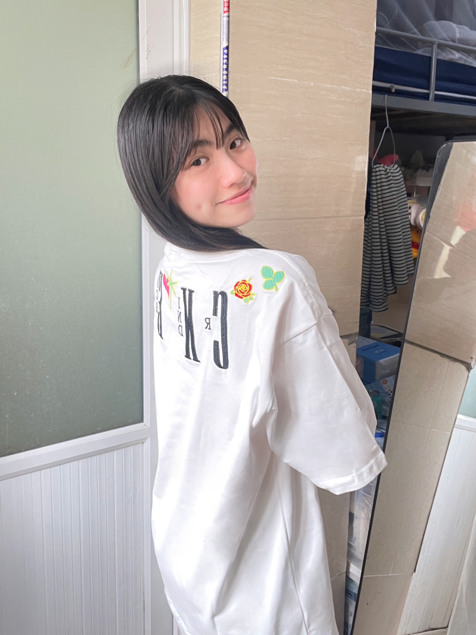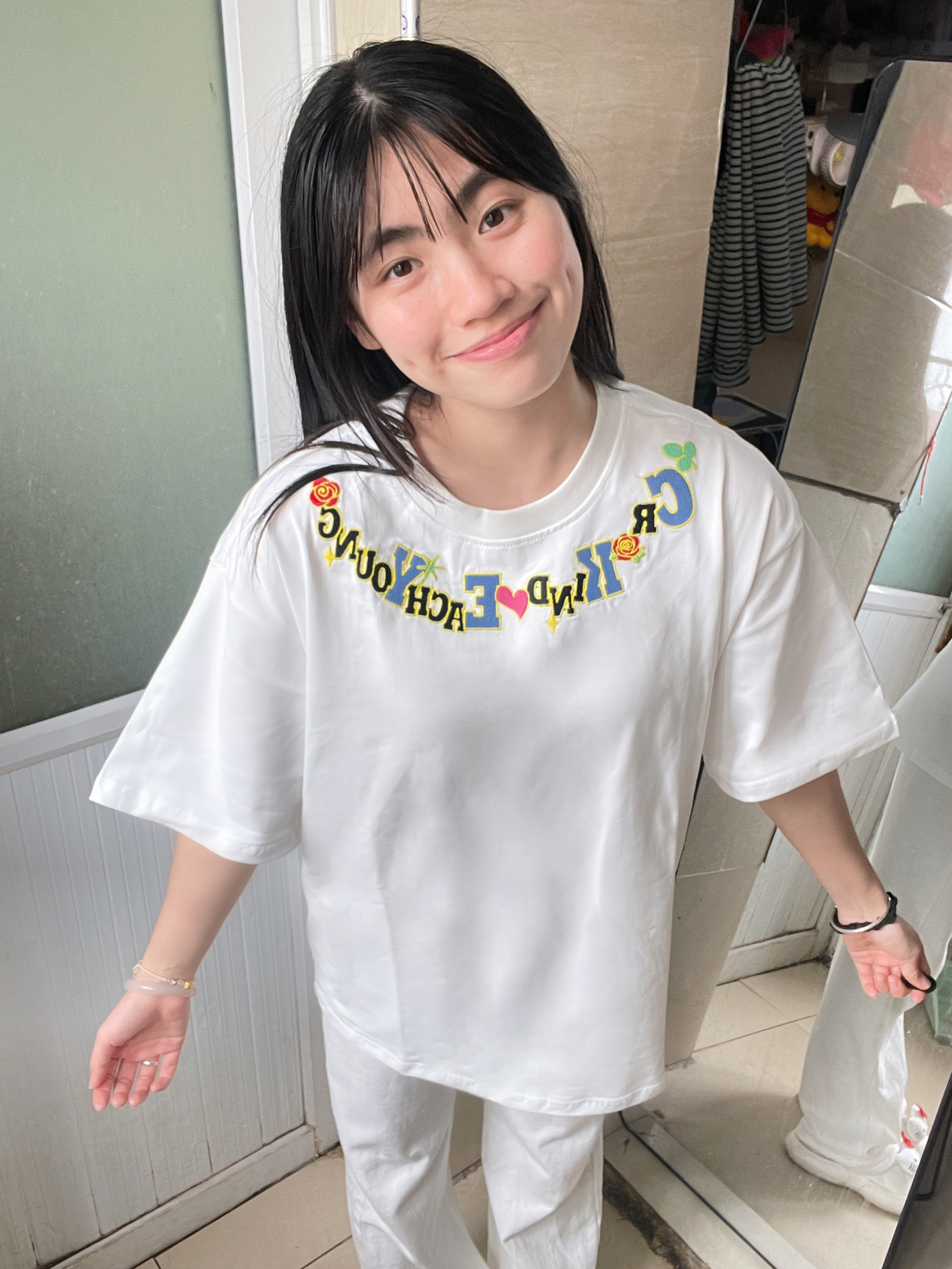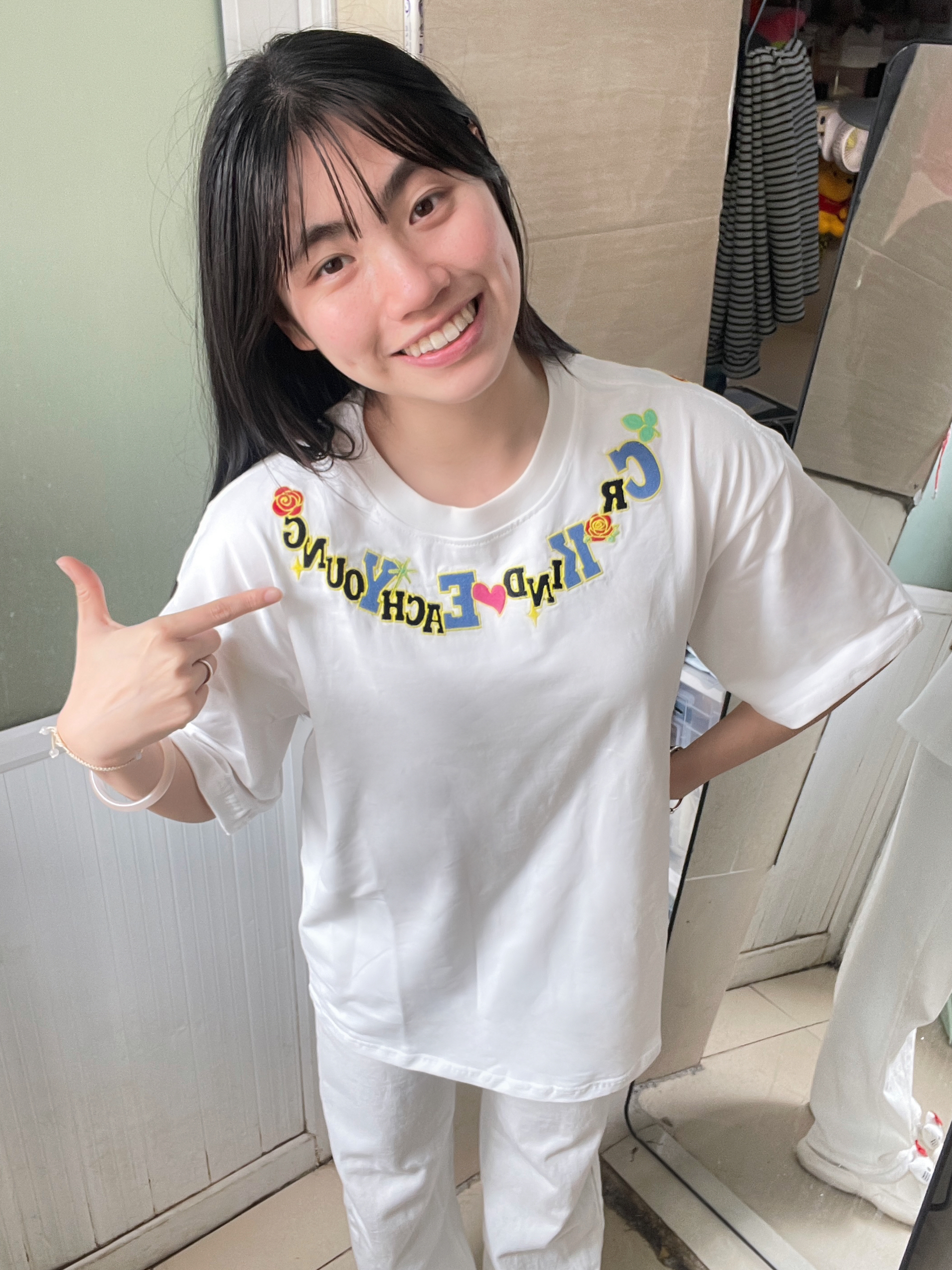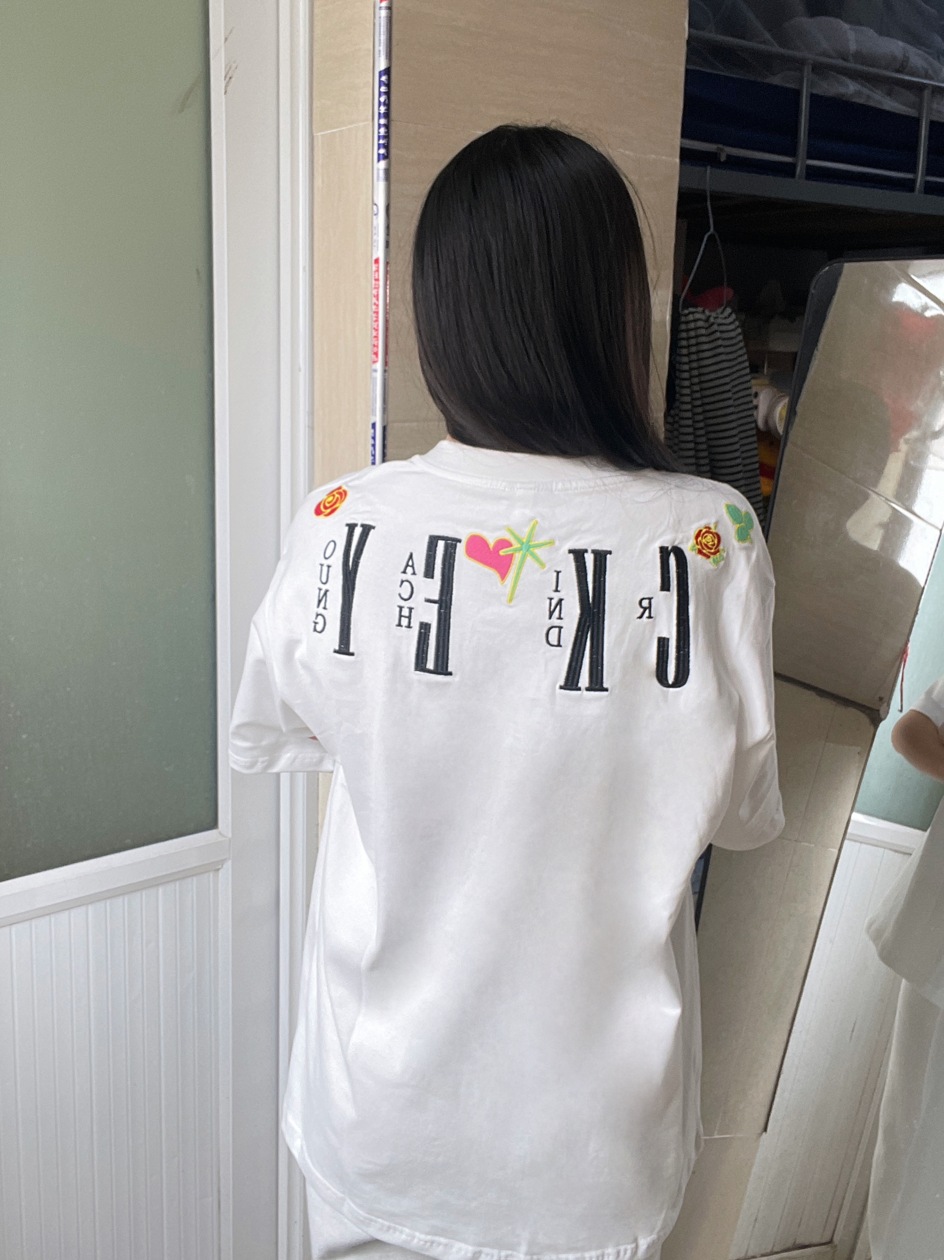 166 102穿的是M码 领口做了一圈花卉围绕的字母 设计感拉满了 还都是刺绣的呢 后背也有刺绣点缀 穿上就让人觉得活力满满 喜欢的宝宝可以参考一下哦