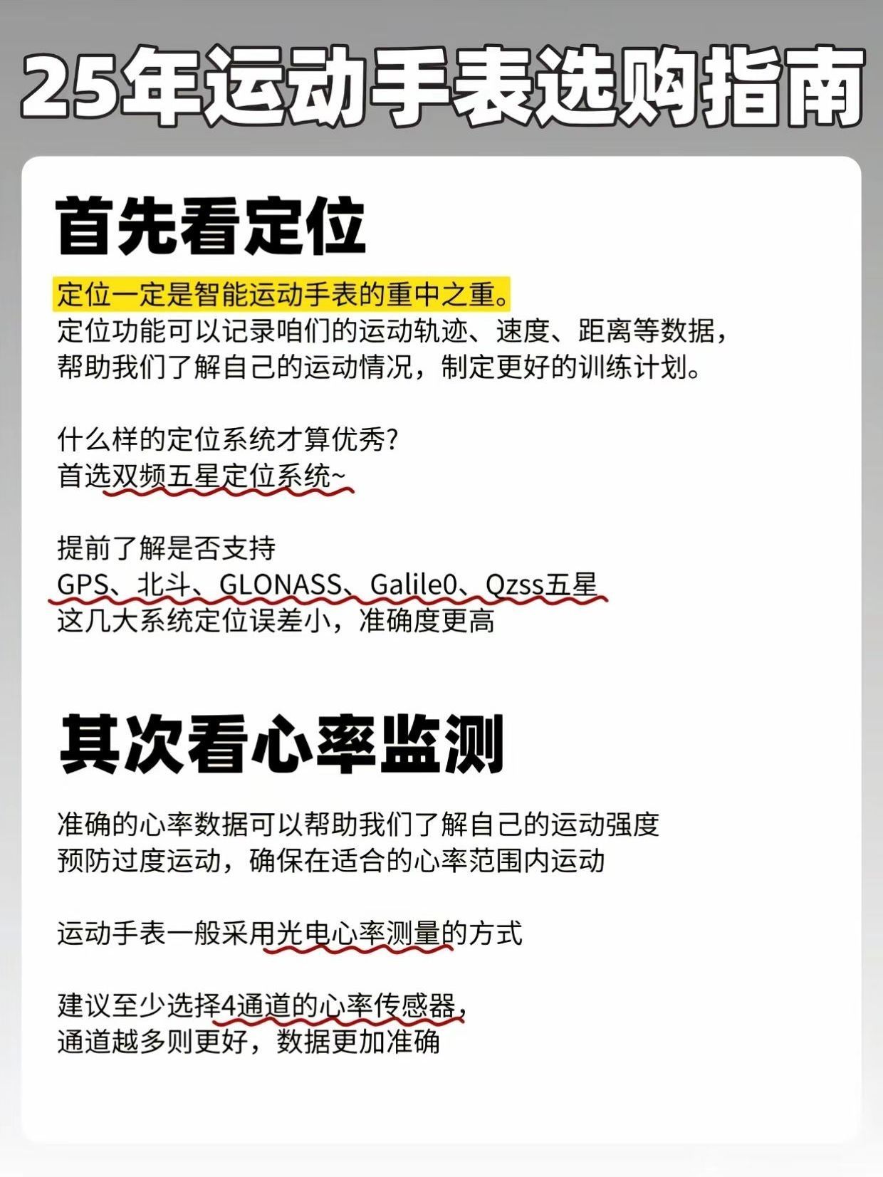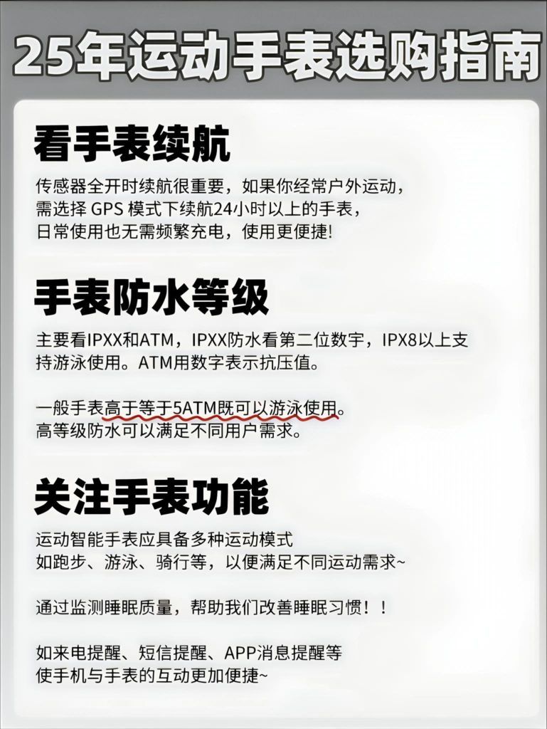 ✅明确需求:明确自己的需求是购买运动手 表的第一步。根据个人喜好和用途,可以 从功能 外观、材质等方面进行考虑! ✅数据监测:包括心率、血氧、心脏健 康、压力、睡眠监测等方面的数据。 ✅续航时间:续航时间越长,使用体验越 好。 ✅防水性:建议选择防水深度在30米以上 的运动手表,这样在洗澡、游泳、洗手时 都无需摘下。 ✅运动模式选择:根据自己的运动需求, 选择支持跑步、游泳、划船、...