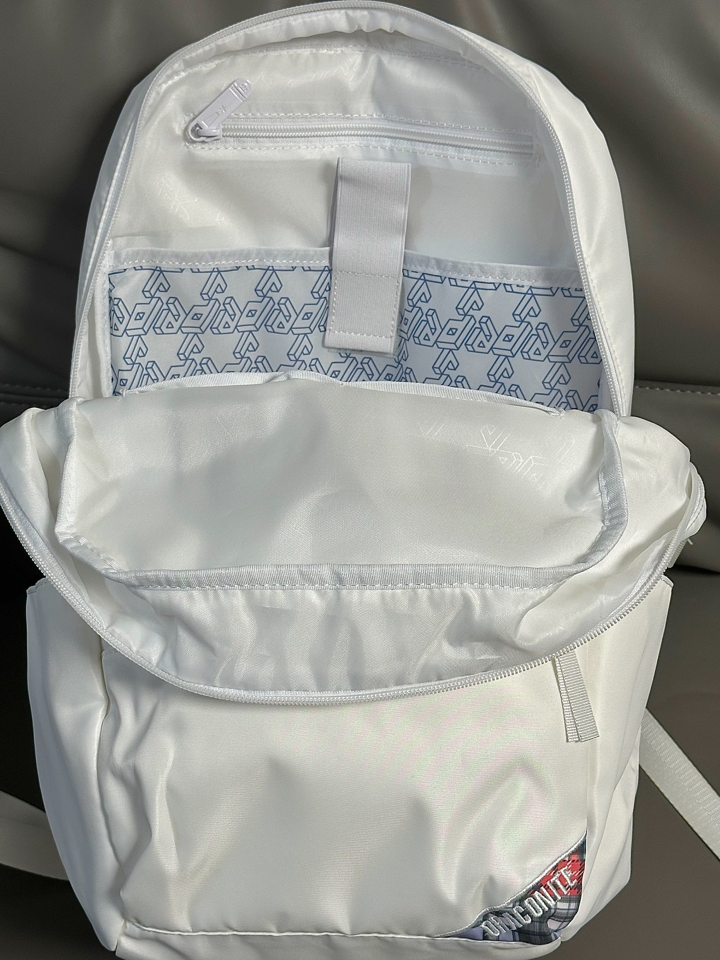 白色的书包真的很有少年感 口袋很多很能装 可以装下我的15.6寸电脑💻 放假或者出门旅游的时候超好搭! 秋冬韩国女高氛围感~拿捏🎒 背起来很好看,刺绣logo也很精致 真的很不错哇,送给高中生妹妹会被夸