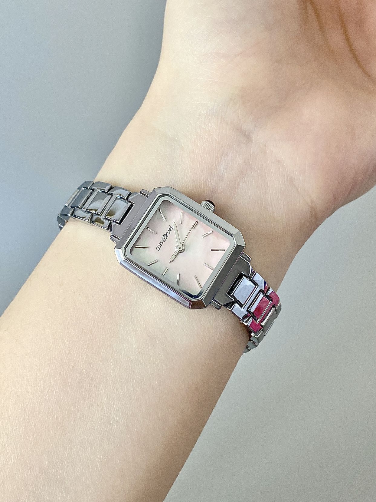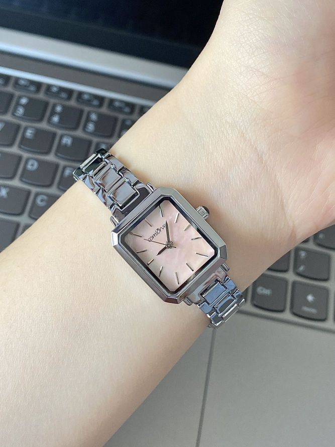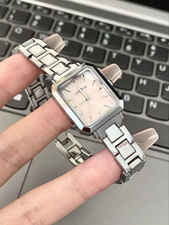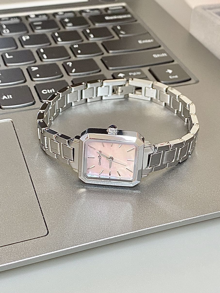 家人们谁懂啊!这块方形小手表真的美到我心巴上了 表盘是粉色的,搭配金属表带,精致又高级。 方形表盘设计简约又独特,满满的时尚感 无论是通勤还是日常出街,都能轻松拿捏气质。