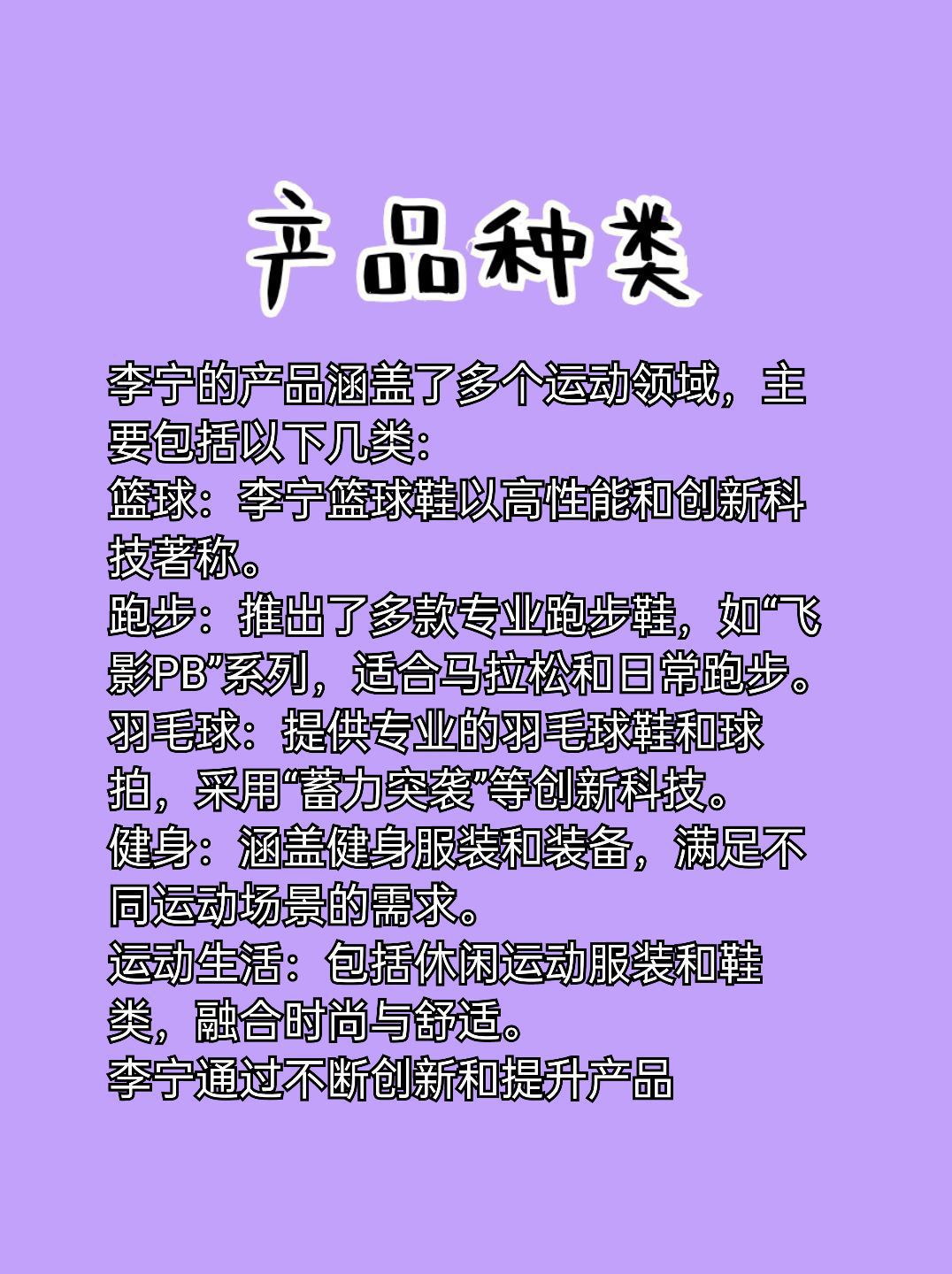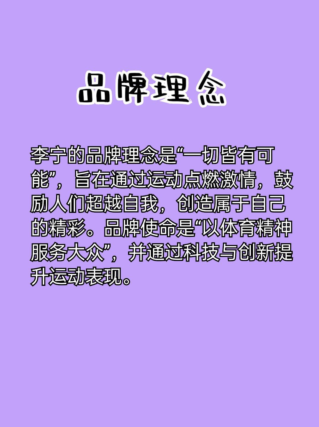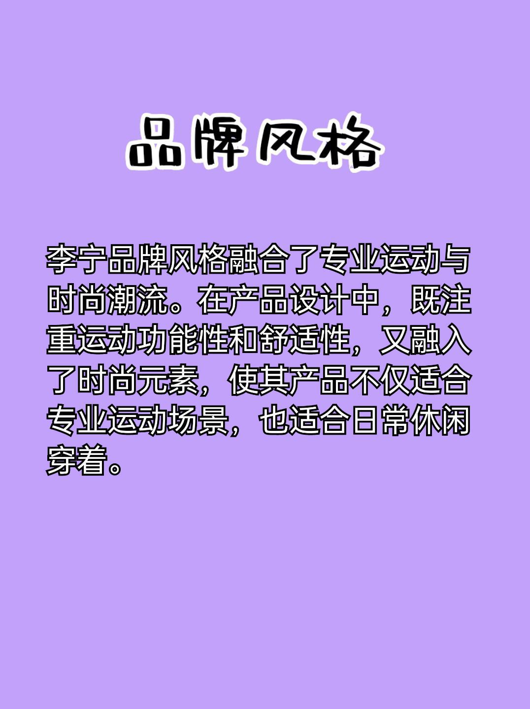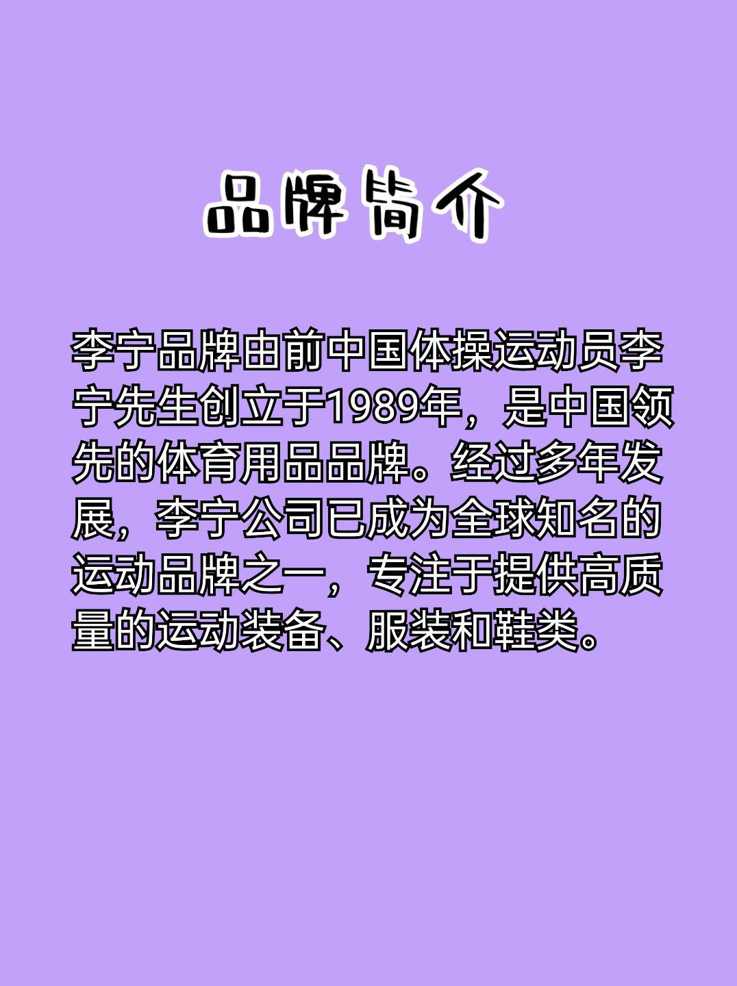 李宁是一个中国本土的体育品牌,由体操王子李宁先生创立于1989年。以下是详细介绍: 1.品牌简介:李宁品牌希望通过自身的设计和创新,“让运动更专业,让生活更健康”。为了满足大众群体的体育需求,李宁品牌主张不局限于在特定的运动项目、文化、群体和场景里做设计。同时鼓励大众勇于参与和挑战,不被年龄和身份所限,不为他人眼光而活。品牌宣扬运动无界限,穿搭不因被某种运动项目所局限,坚定运动多样性的理念。 2....