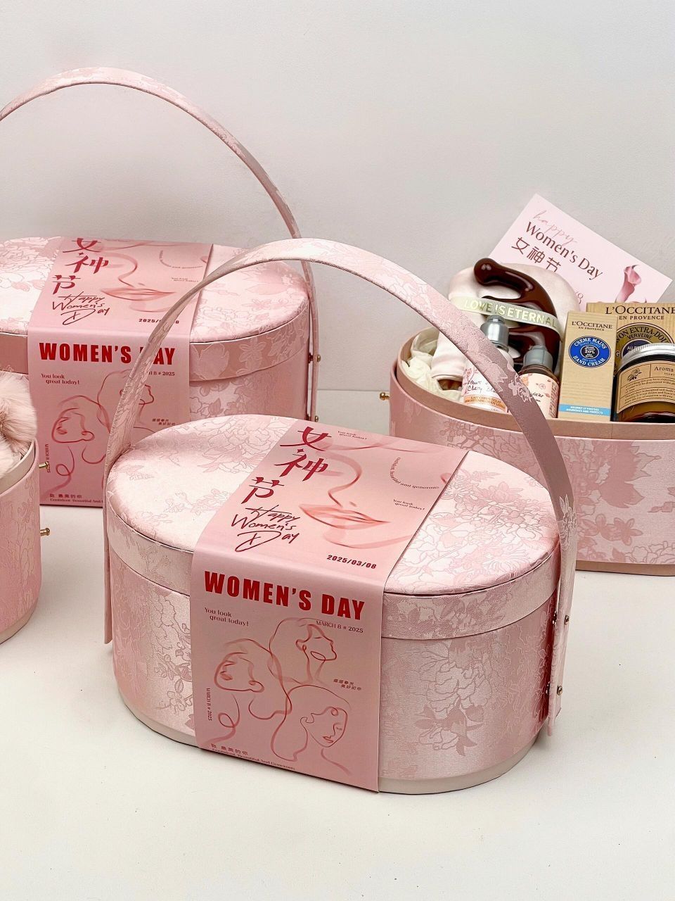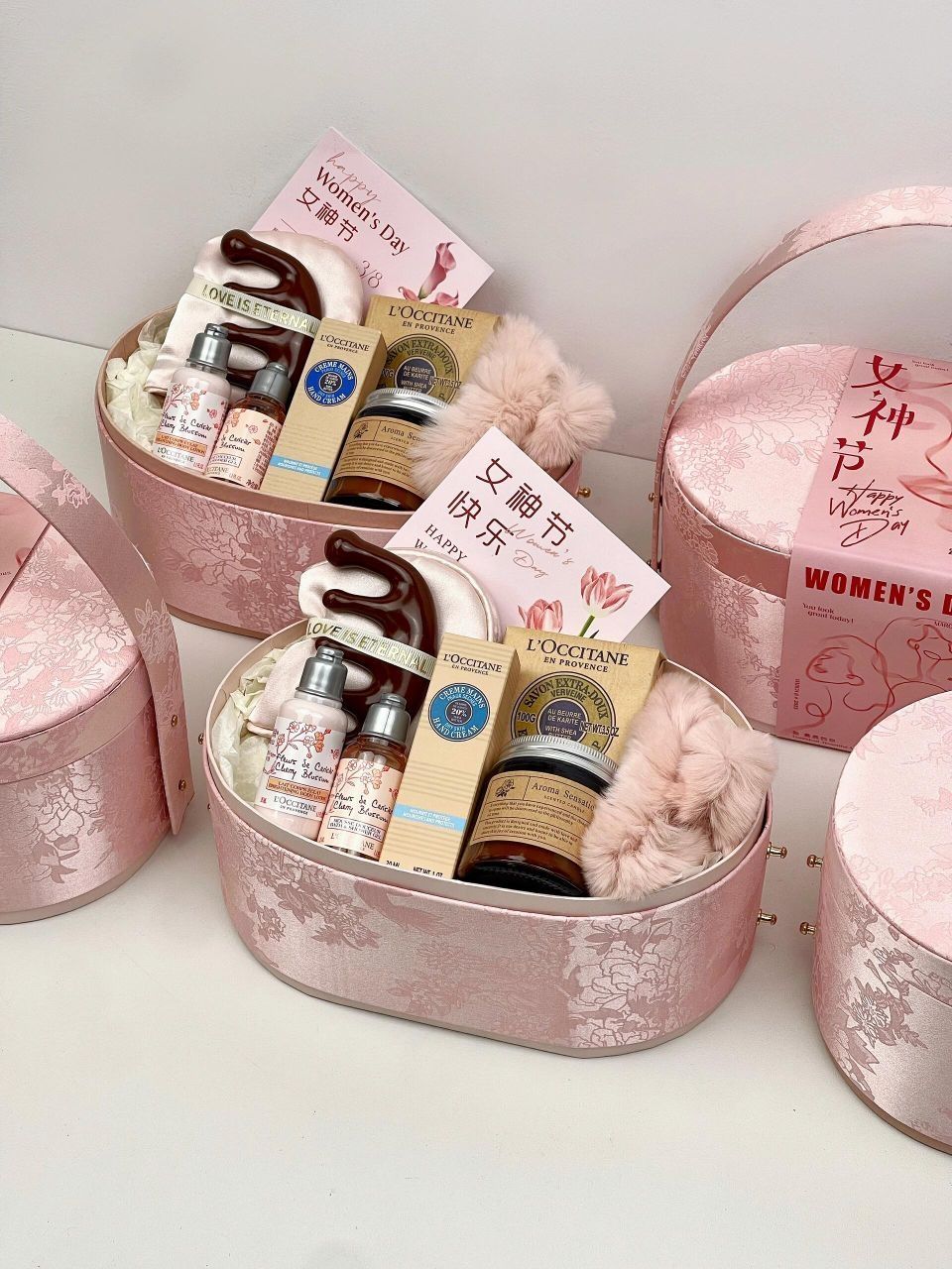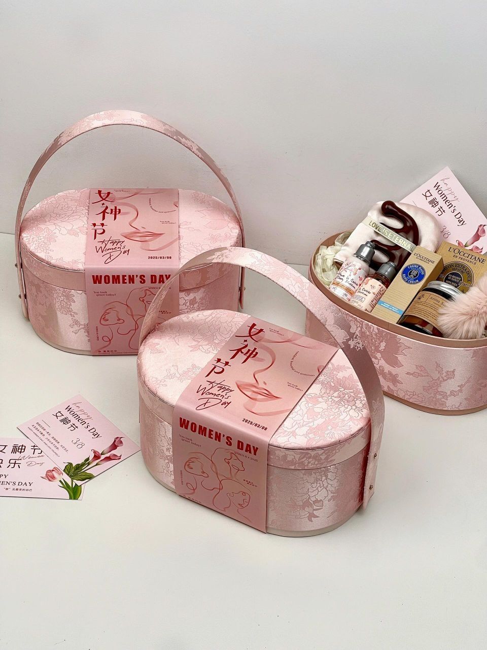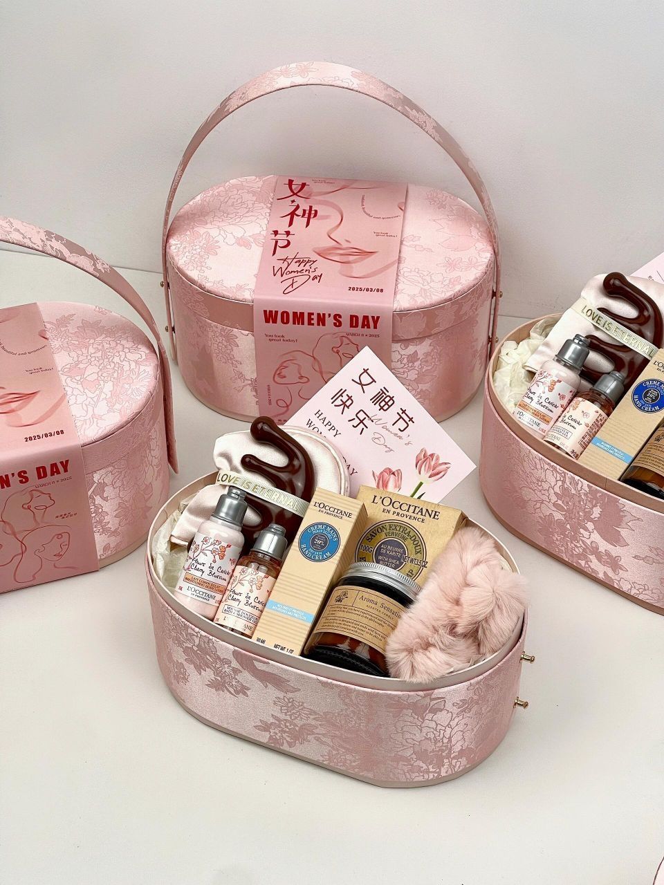 东方美学织就春日诗篇~ 这款淡山茱萸粉椭圆礼盒惊艳登场! 气氛组节日封条“女神节快乐”把节日氛围拉满 中式古典美感礼盒被赋予新的节日意义 送人有面又有心意~ - 搭配清单list: 欧舒丹乳木果香皂 欧舒丹护手霜 欧舒丹樱花洗护 小苍兰香薰蜡烛 毛绒抓夹 丝质睡眠眼罩 养生按摩梳