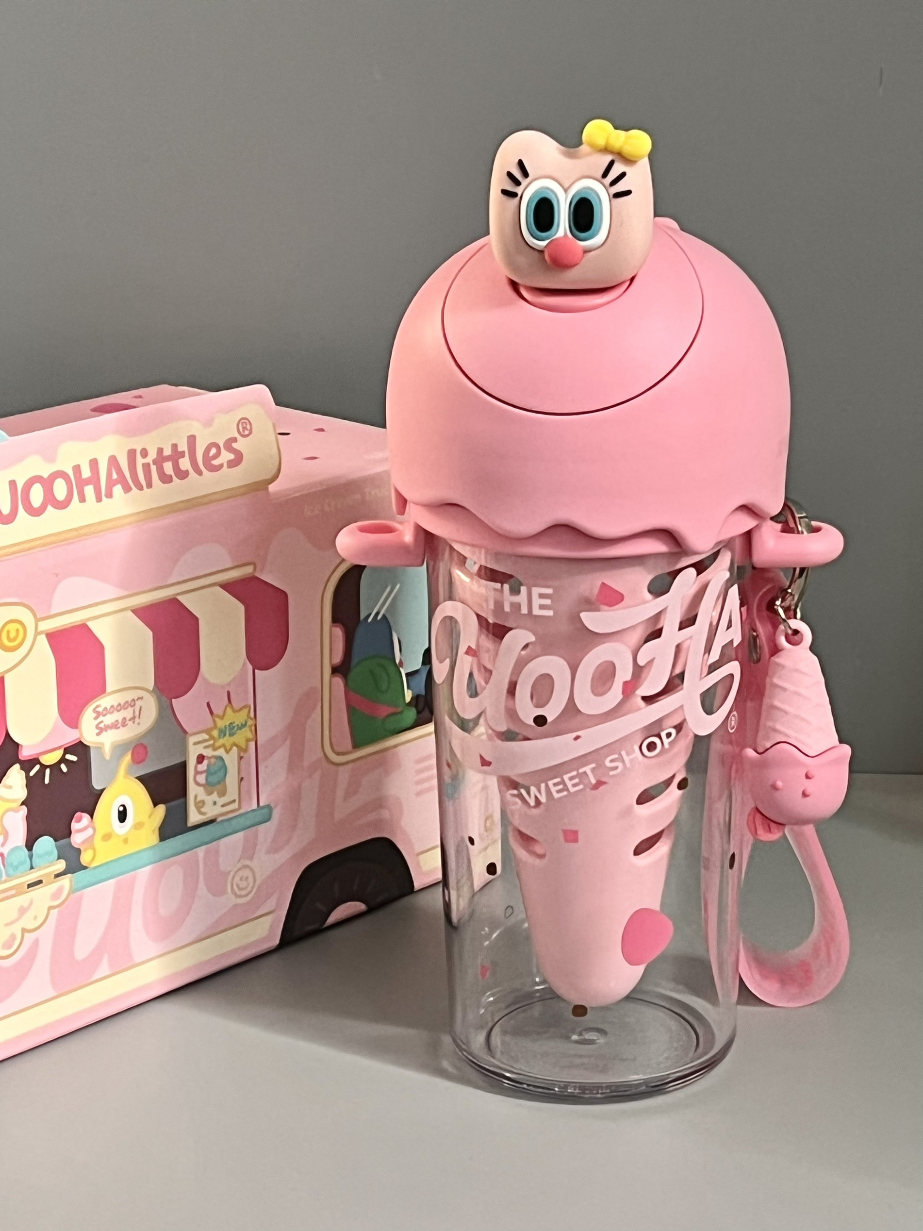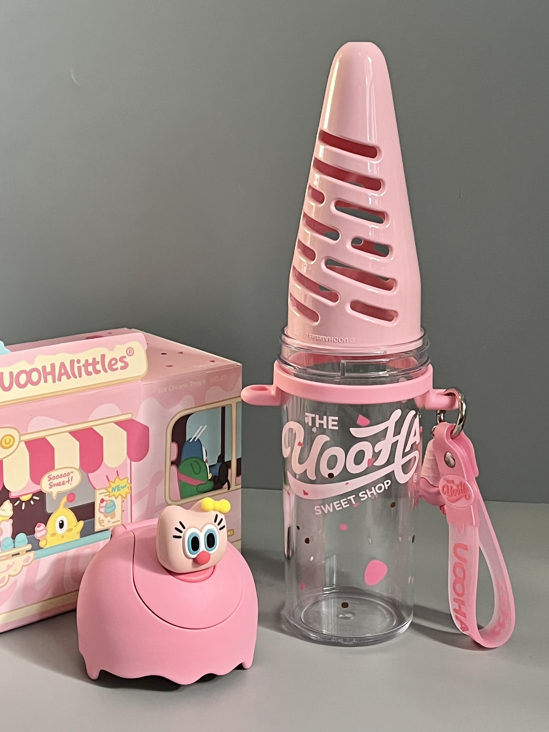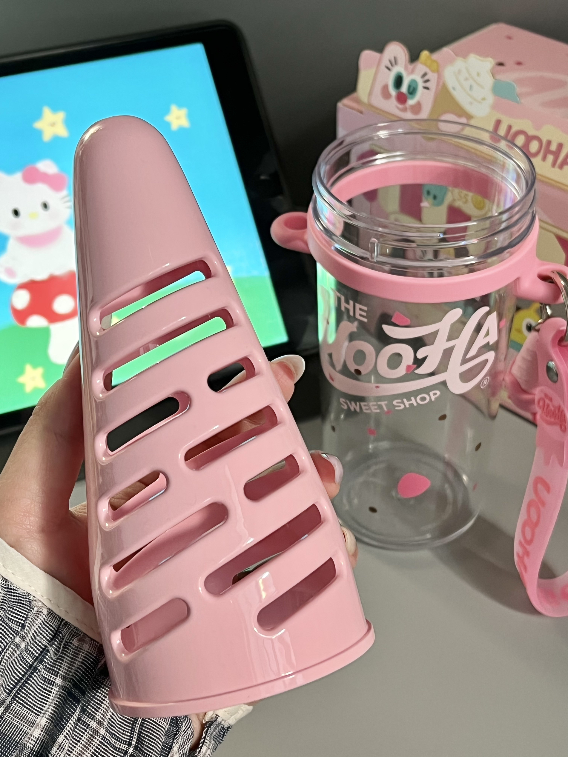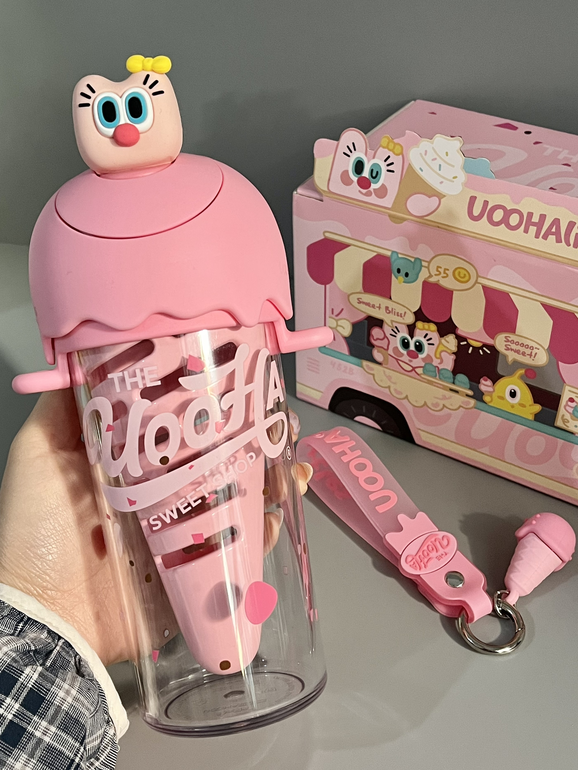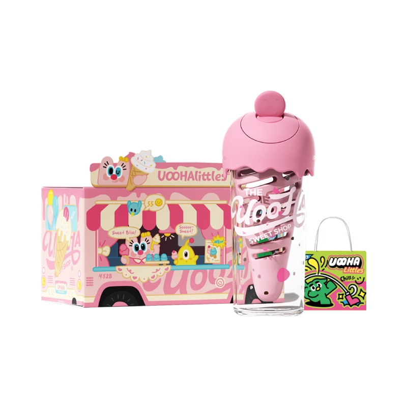 是UOOHA的甜筒杯耶! 粉嘟嘟的好有少女心 满满一盒有贴纸、手提绳、挂件、背带、礼袋… 里面自带一个甜筒果仓,泡果茶也太方便咯 480ml大容量,还是食品级材质,倒热水也不怕有味道,喝水什么的太有幸福感啦 女孩汁收到这样的礼物别提多开心咯