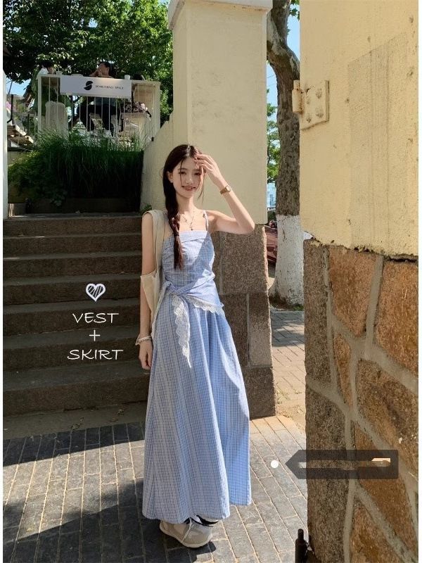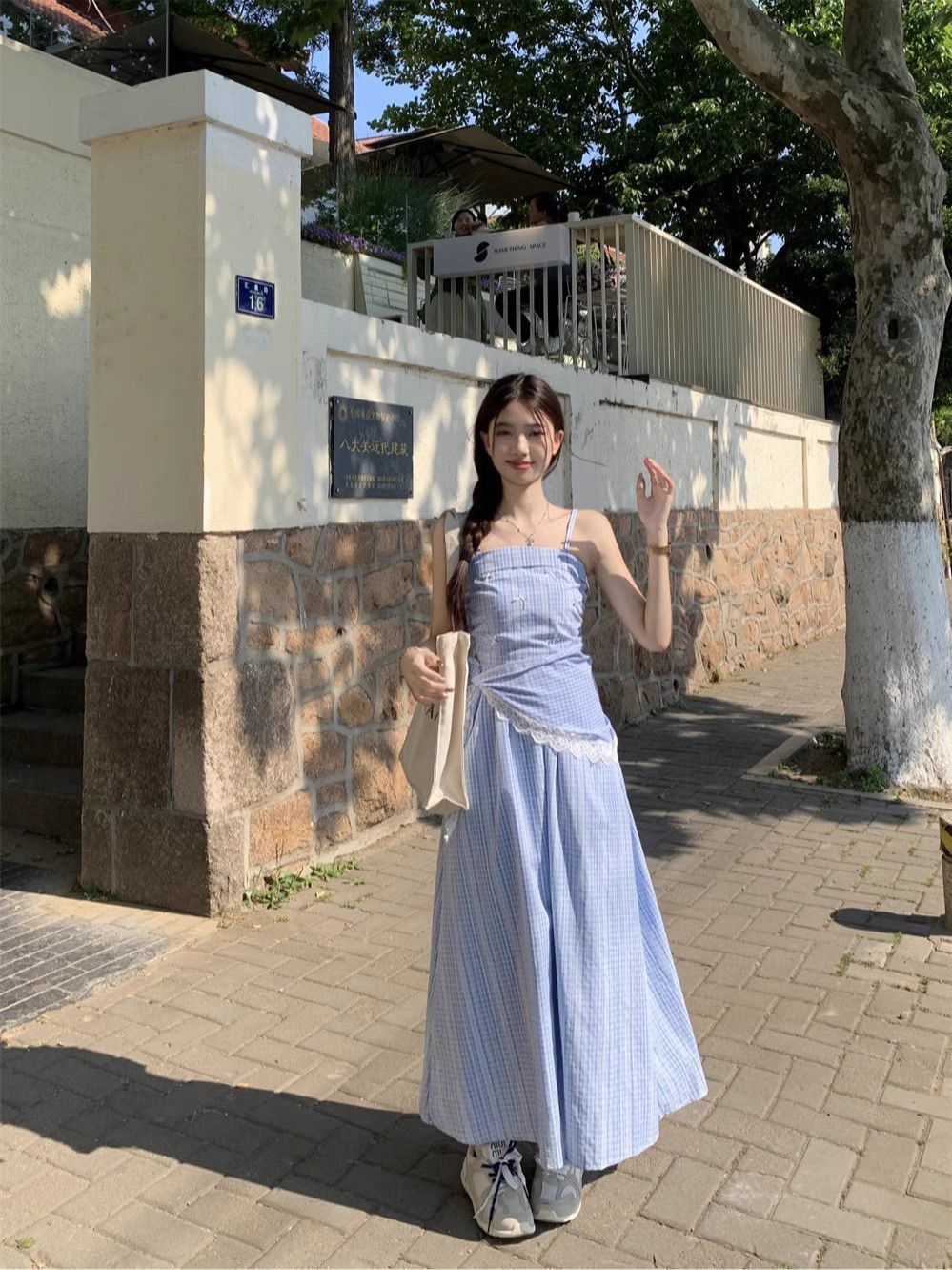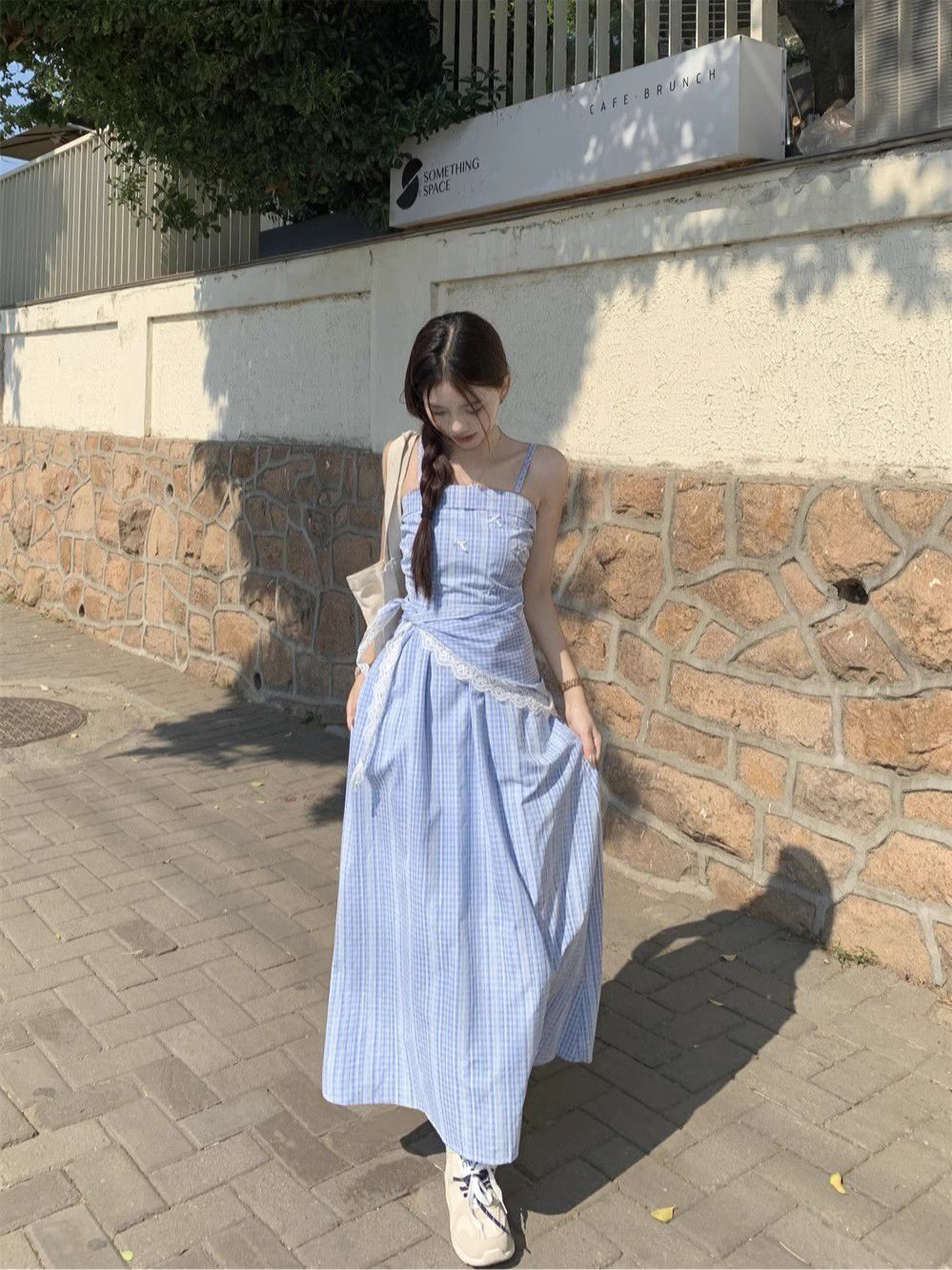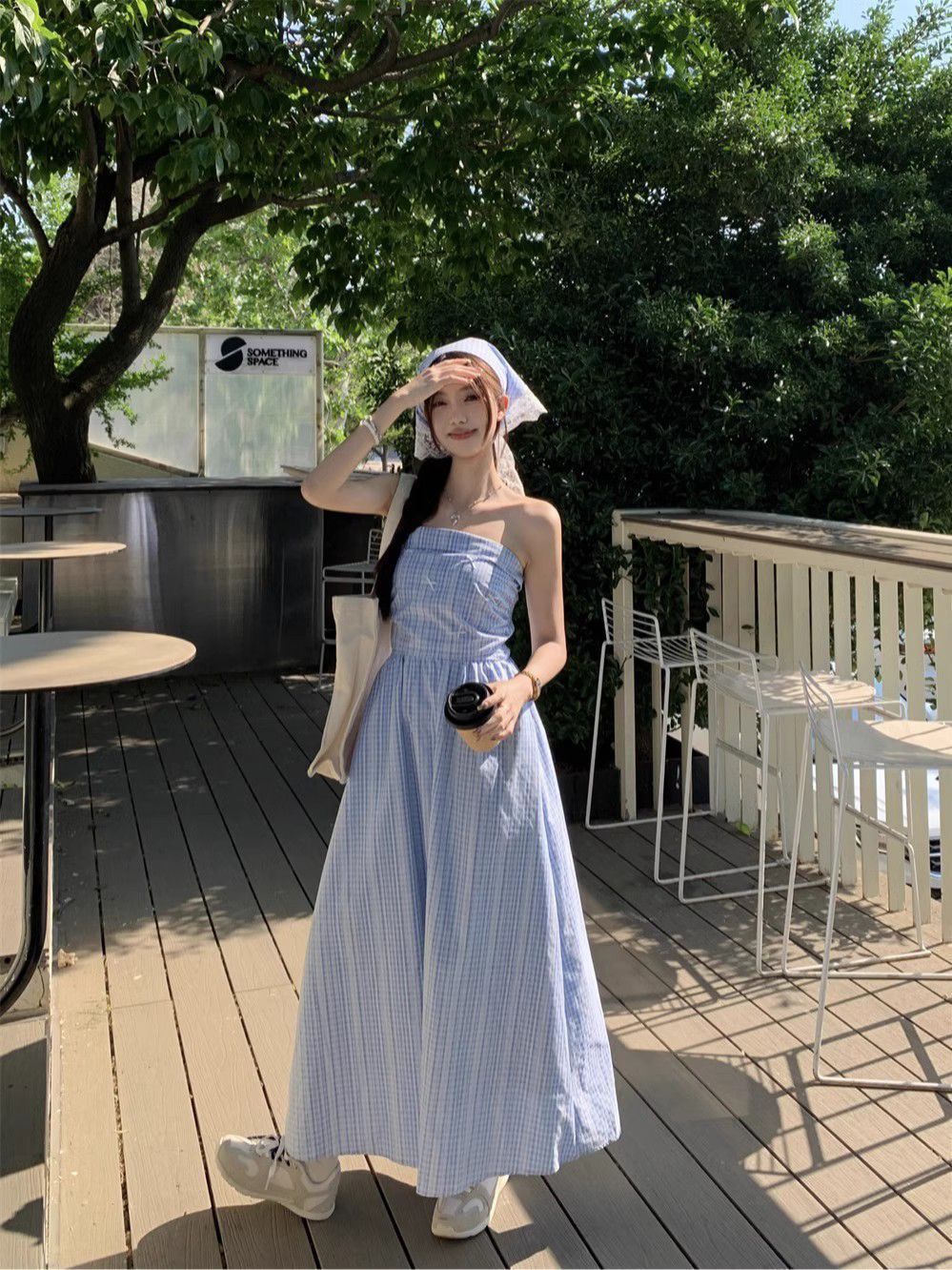 法式蓝色格纹一字肩抹胸吊带连衣裙子女夏季新款海边度假长裙