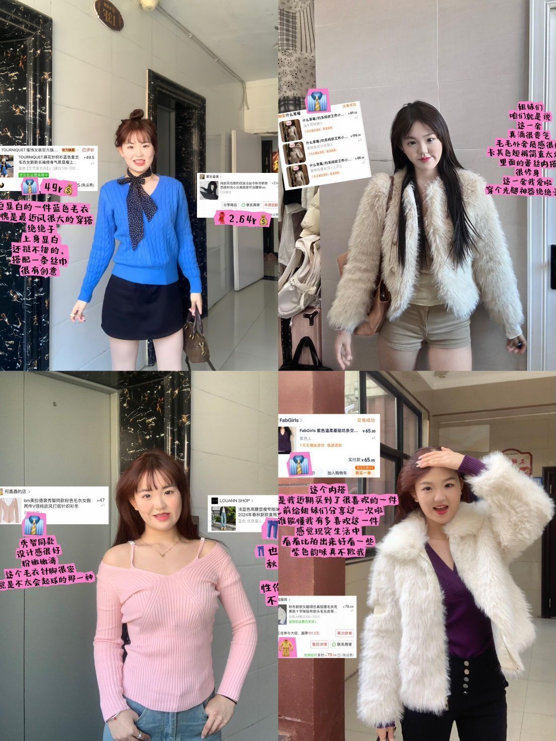 嗨嗨嗨喽啊姐妹们👭 这一期给大家分享一下几件秋冬内搭还有一些我的爱用好物 1⃣️最近这件蓝色毛衣的这一套穿搭真的风很大我也买了一套来试一下我挖到的这件质量还挺好的,而且基本上跟原图没有什么差别这条斑点资金真的是点睛之笔搭配神器我之前都没发现🥳 2⃣️蕾丝内达我真的很推荐很纯欲的感觉,我当时是直接购买了一整套在店铺里看准一整套买的还挺好看的,这一整套都可以当作过年战袍🥳 3⃣️啦啦啦这件粉色的吊带内...