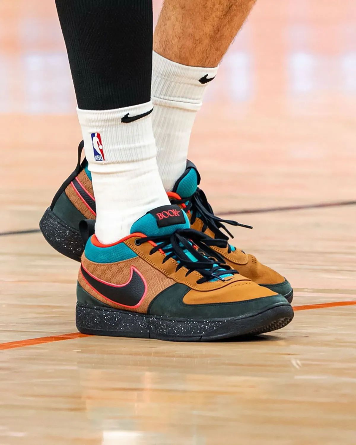 德文·布克再度上脚Nike Book 1 PE,这款鞋的灵感来源于1991年Nike推出的一种跑步/徒步混合鞋的另一个原始配色。 这种黑/棕/青色配色是1991年Nike提供的六种原始款式之一;它最后一次向公众发布是在2019年末,作为Olivia Kim策划的Nike x Nordstrom系列的一部分。这款PE预计不会向公众发售。