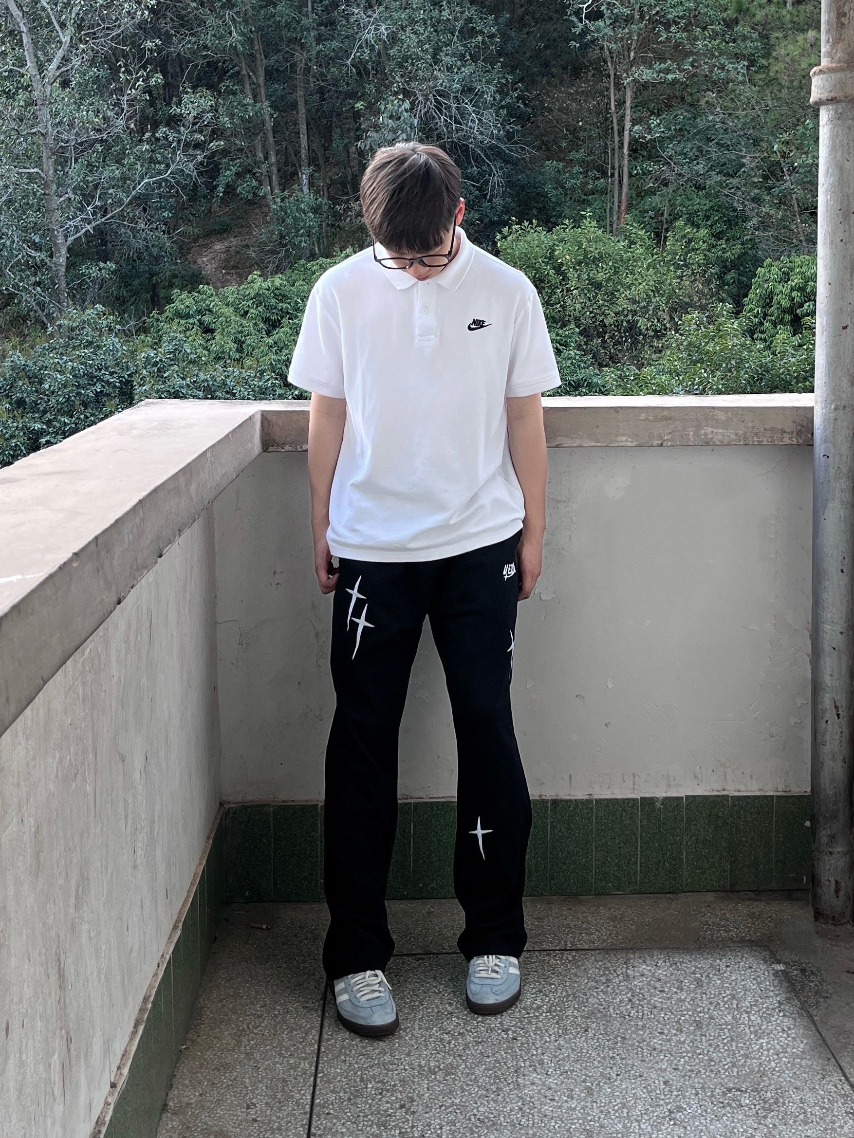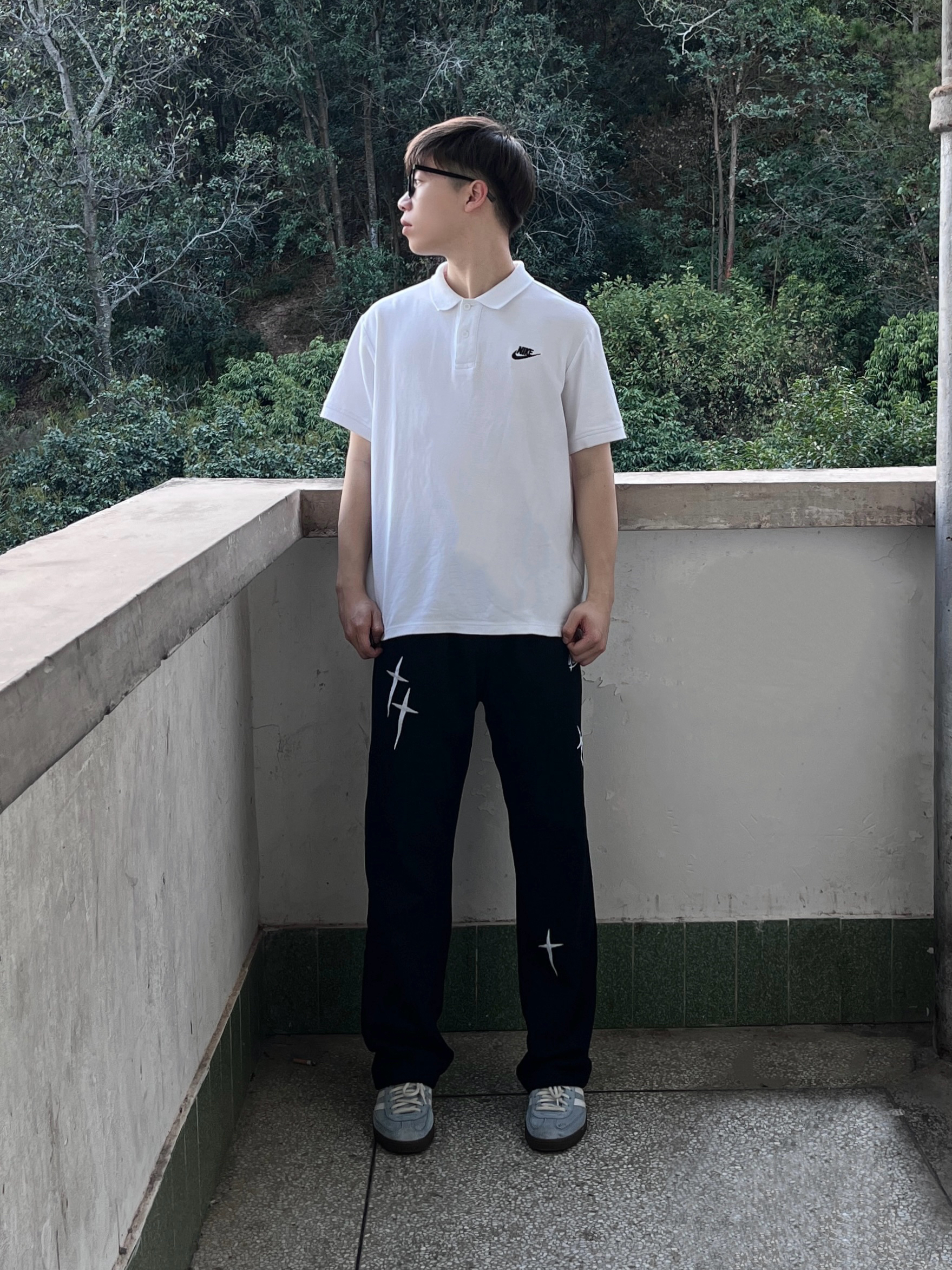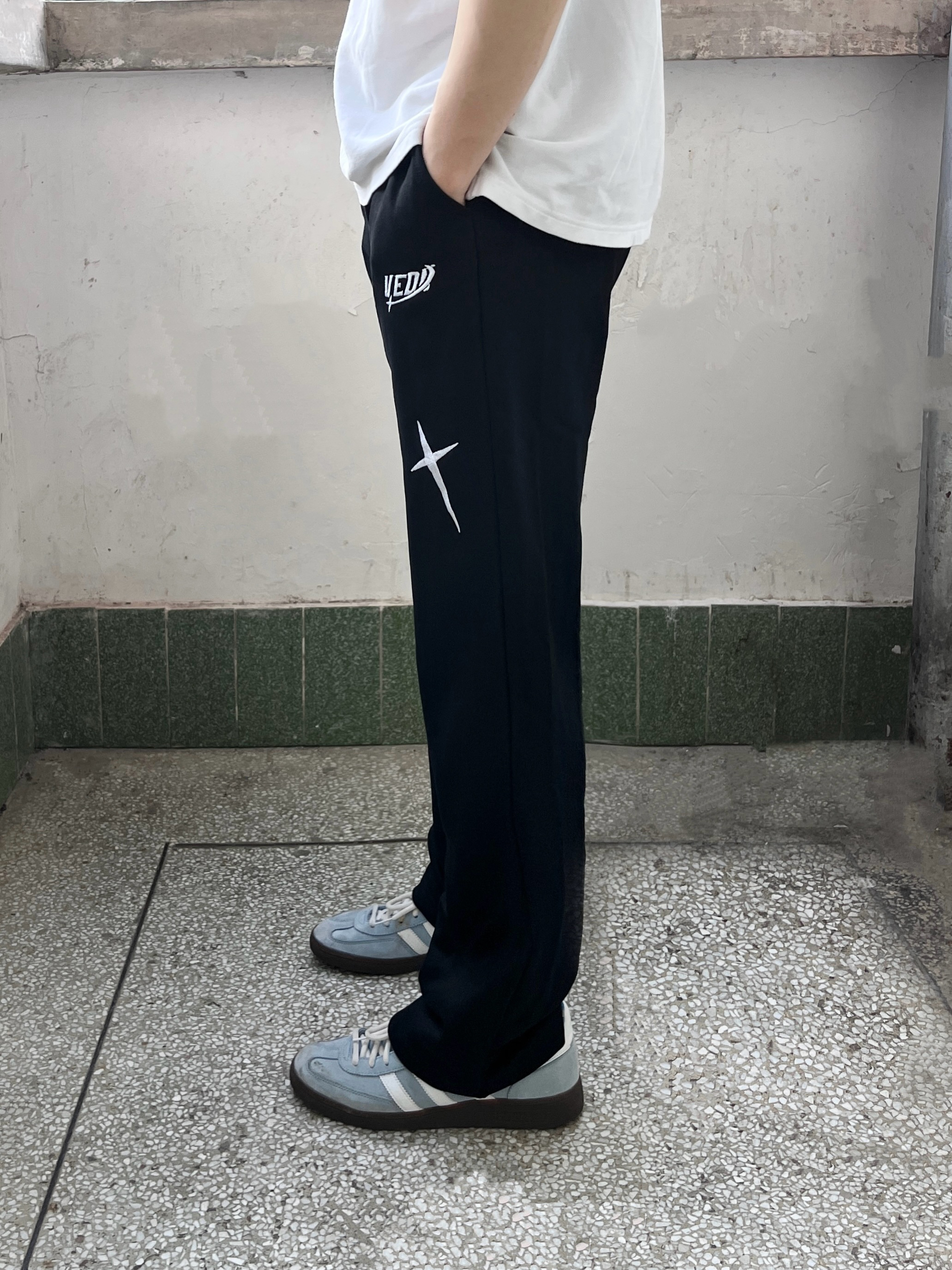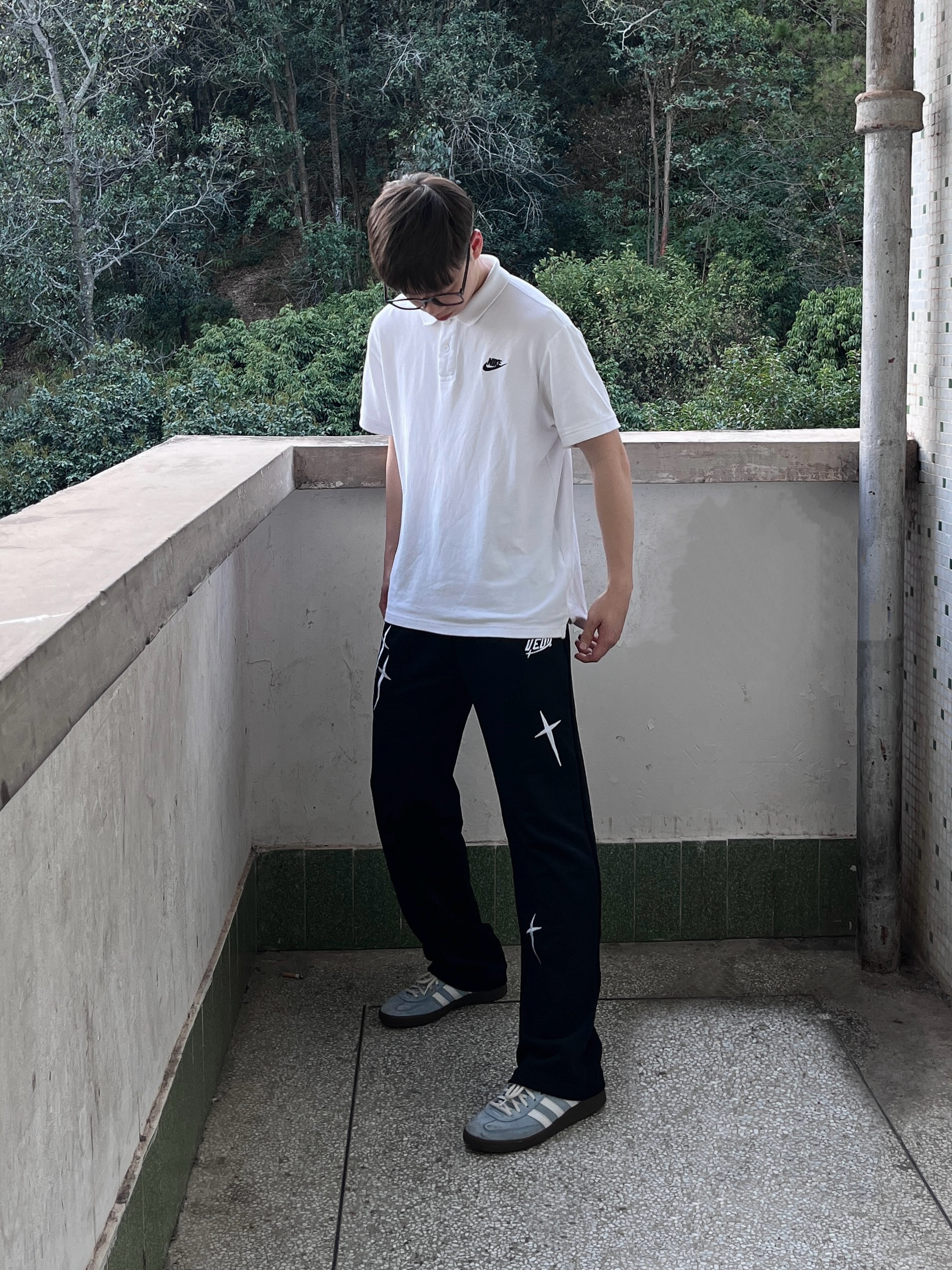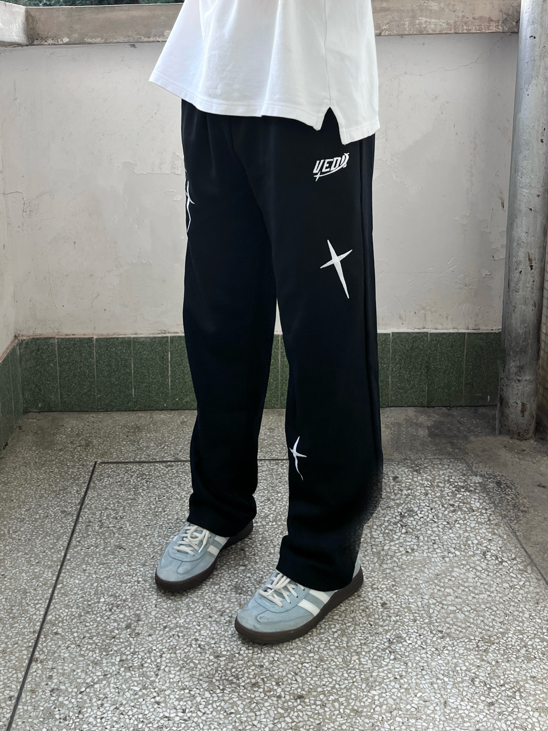 今日份穿搭分享look👀 衣服是经典白色立领Polo衫 搭配 维动 VEIDOORN 家的耀影直筒卫裤👖 星耀💫印花logo潮酷时尚 针织面料亲肤透气 无论是日常出行还是运动健身都很合适 一套搭配下来 开春出街休闲又百搭🔥