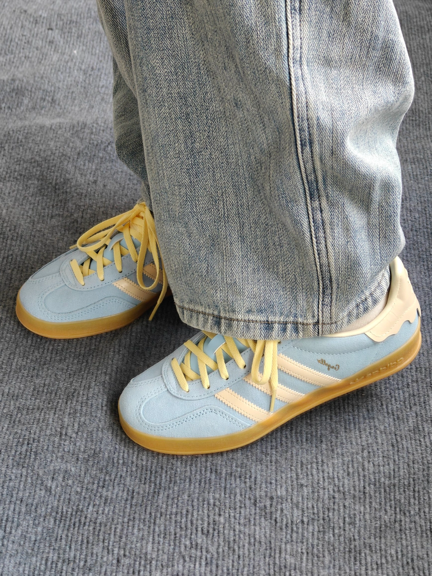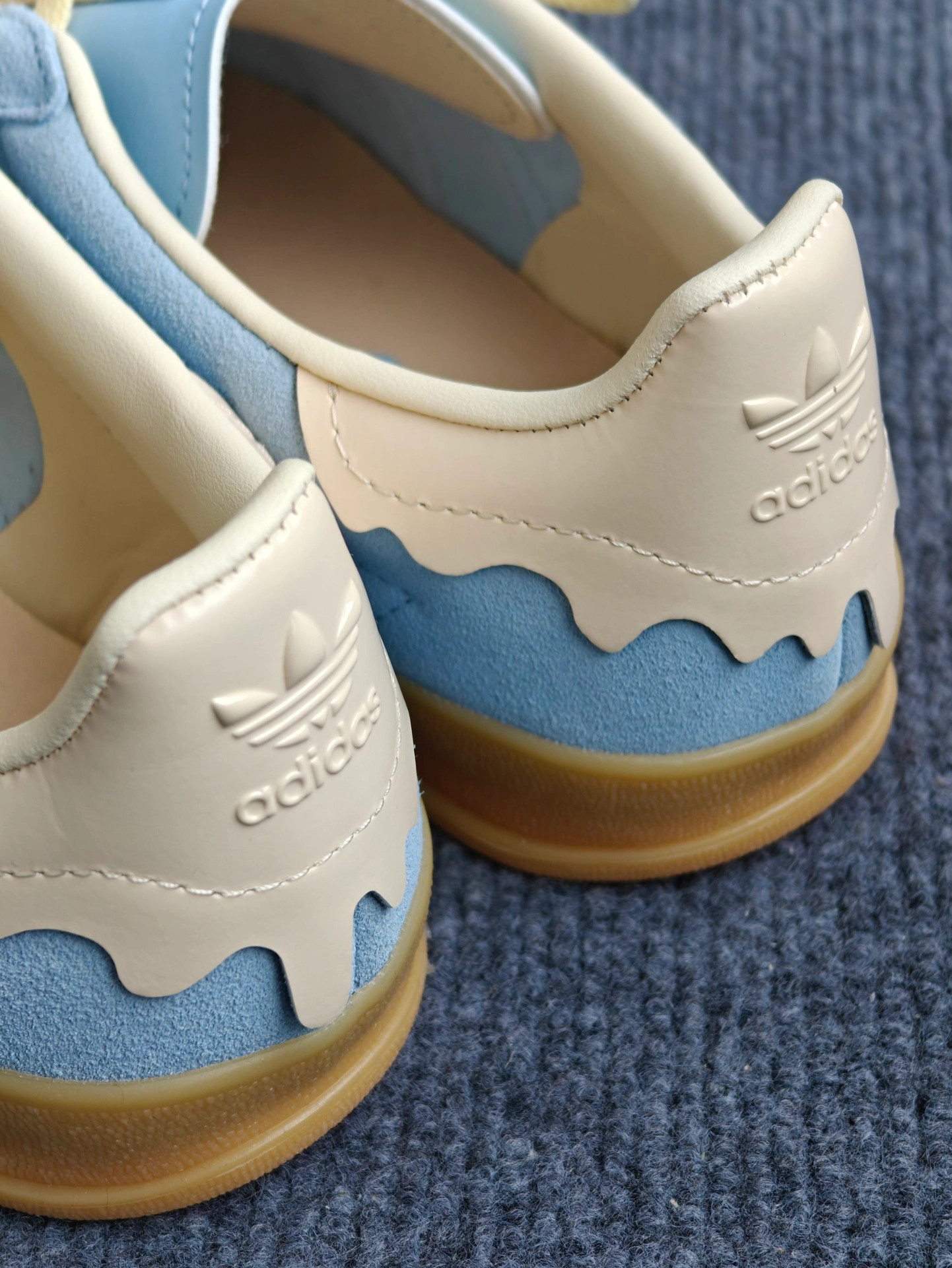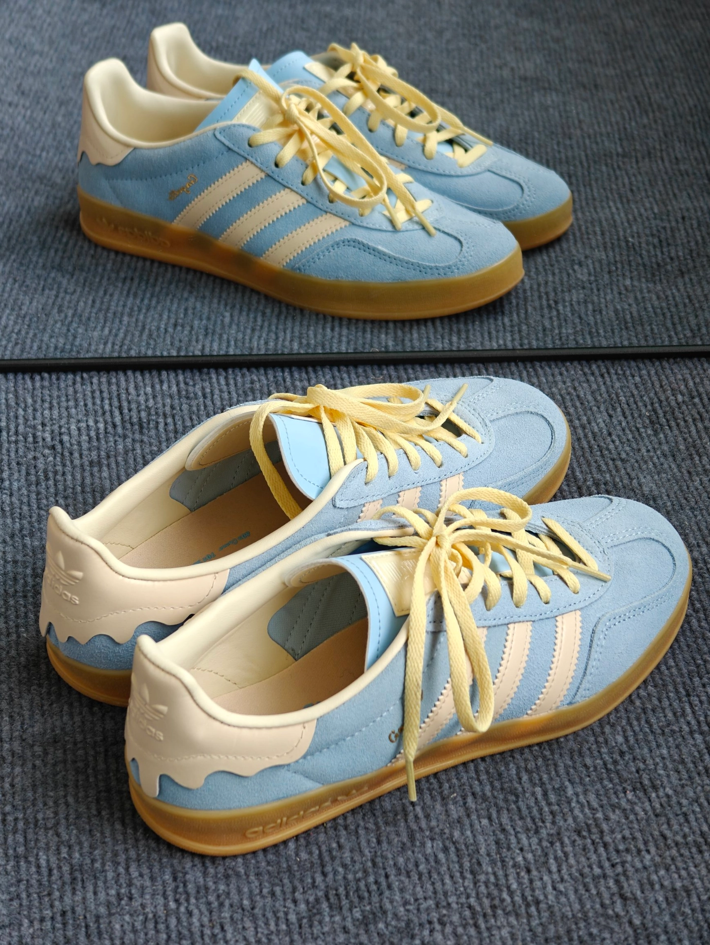 最近入手这款Adidas gazelle 后跟很有特色像块奶油蛋糕🍰,鞋面采用了天蓝色绒面革搭配小鸡黄🐥鞋带,非常小清新哇😯,春天穿跟朋友出去踏青🌿穿,非常上镜[爱心_blue] 上脚脚感适中不会很硬,日常通勤穿🚗🉑以,不适合下雨🌧️穿,弄脏不太好打理。鞋底防滑性来说整体一般,颜值还是挺不错的。鞋后跟是皮质的,不会硌脚。推荐正常尺码✌︎˶╹ꇴ╹˶✌︎ #把春天穿在脚上 #宝藏鞋子阿迪达斯三 #...
