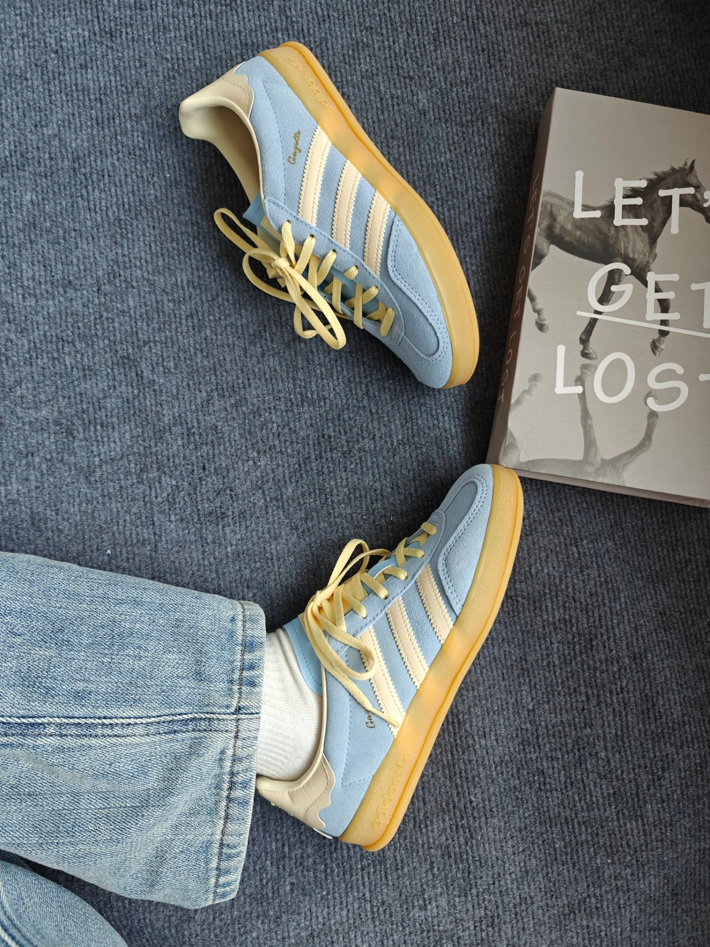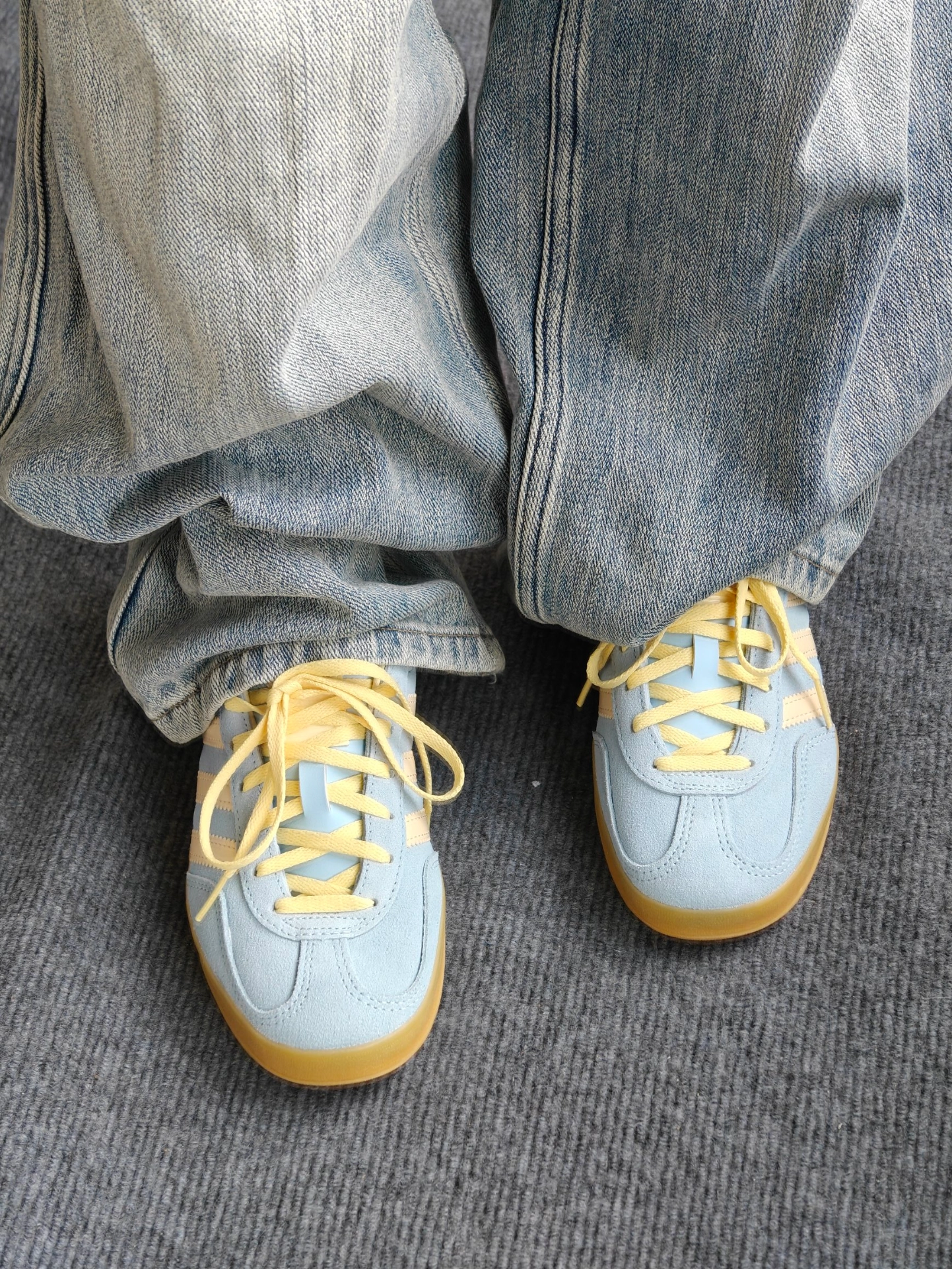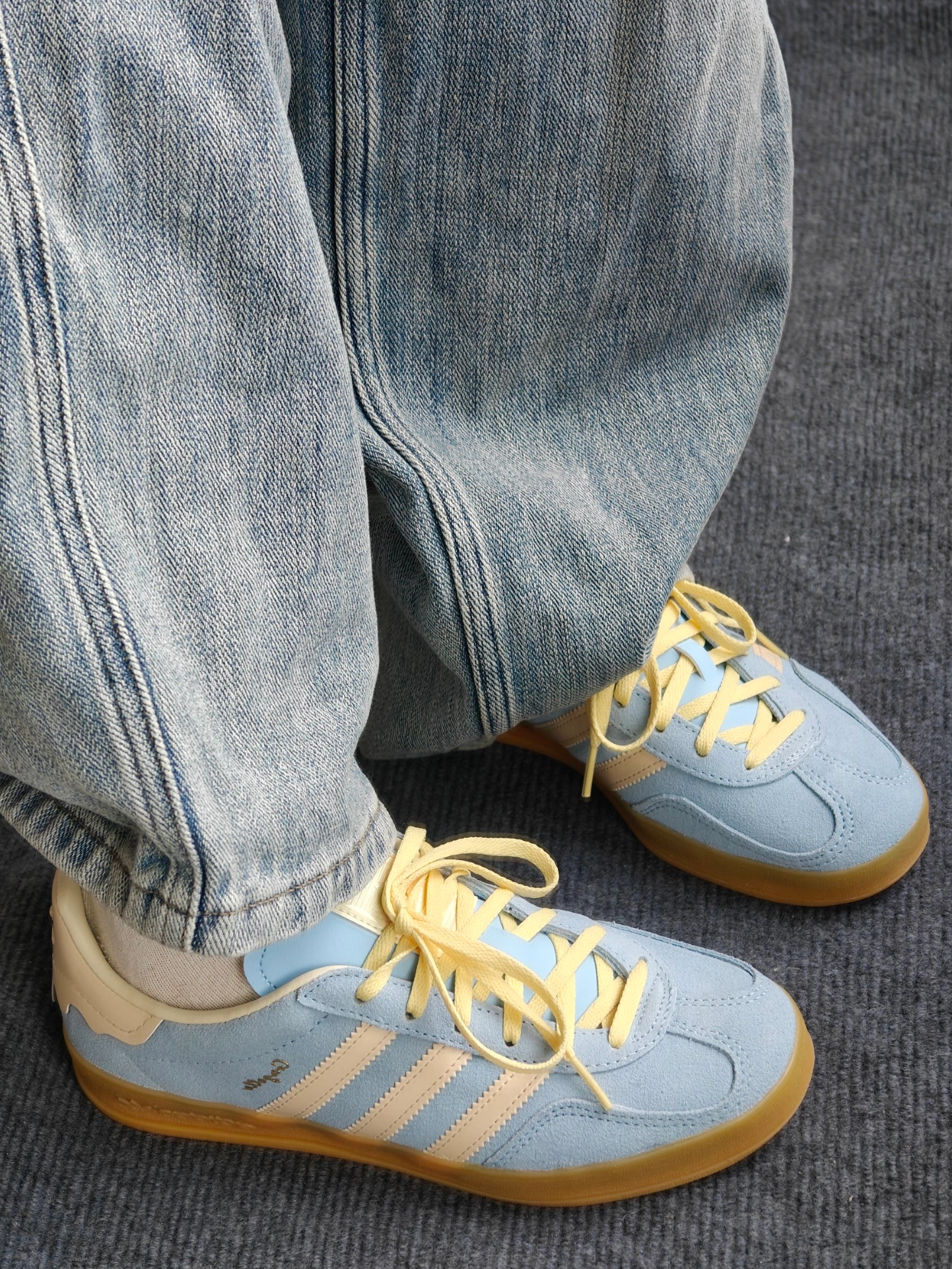 最近入手这款Adidas gazelle 后跟很有特色像块奶油蛋糕🍰,鞋面采用了天蓝色绒面革搭配小鸡黄🐥鞋带,非常小清新哇😯,春天穿跟朋友出去踏青🌿穿,非常上镜[爱心_blue] 上脚脚感适中不会很硬,日常通勤穿🚗🉑以,不适合下雨🌧️穿,弄脏不太好打理。鞋底防滑性来说整体一般,颜值还是挺不错的。鞋后跟是皮质的,不会硌脚。推荐正常尺码✌︎˶╹ꇴ╹˶✌︎ #把春天穿在脚上 #宝藏鞋子阿迪达斯三 #...