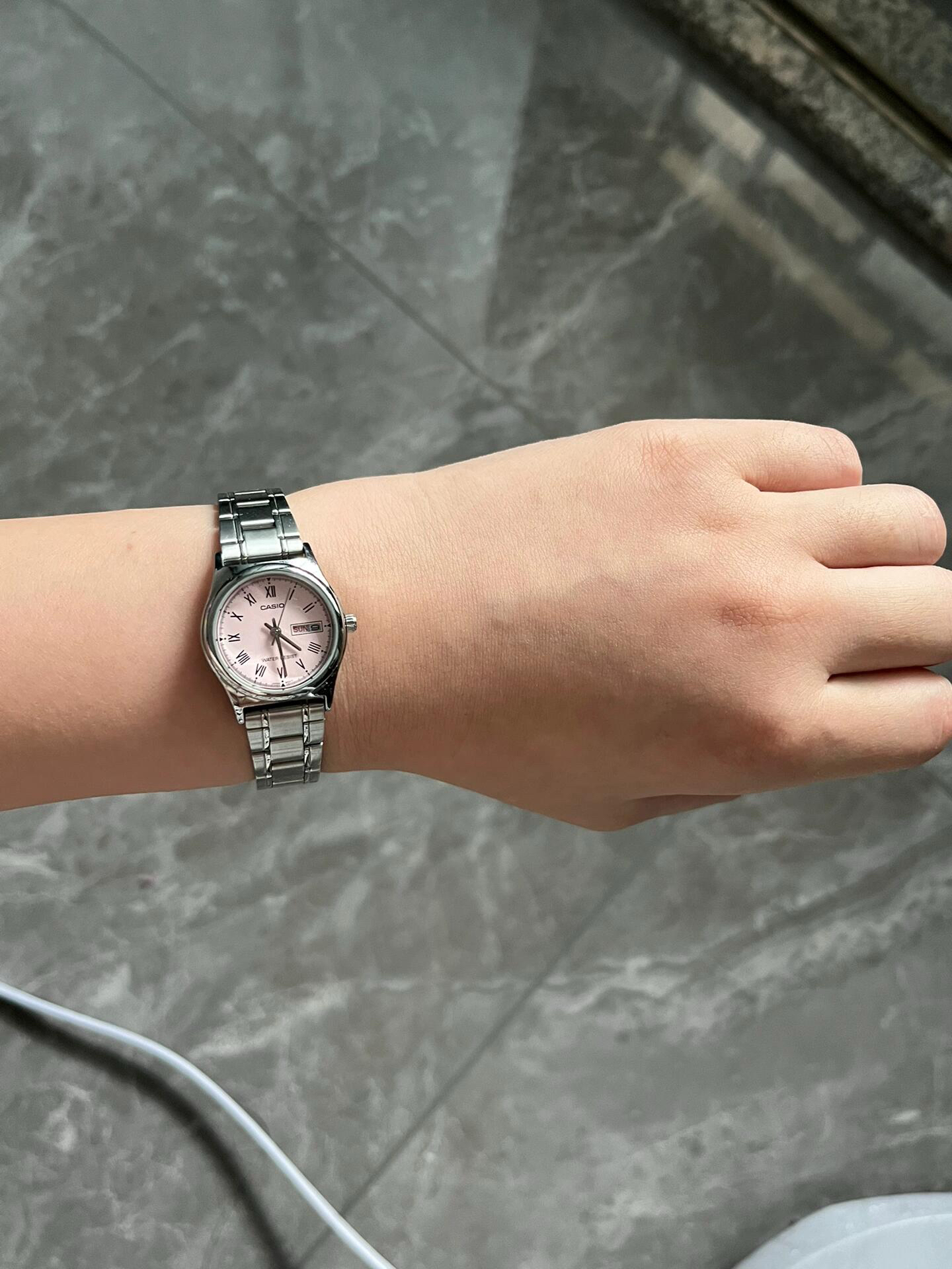 斐乐的玫红色手表坏了,姐姐送的新手表。识货转淘宝买的。表盘跟指甲盖差不多大比较小,不过我的指甲盖比较大,(跟指甲比是因为一次跟同学在拌嘴,那个同学说:你的手表看得清吗?有没有指甲盖大的嘞?🫠🤣)调表带比较难,刚刚好很合适。P5是高考前倒数第二个周末拍的 P6P7是刚到 调试好表带。其他是近照。带着不土,高考可以进考场