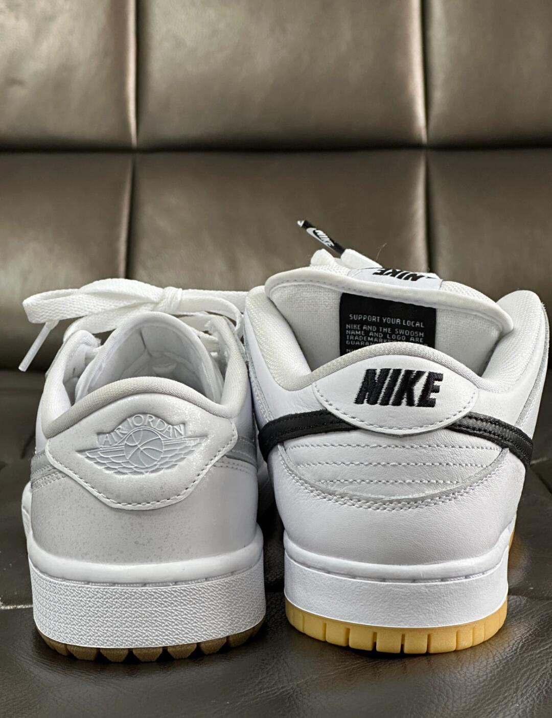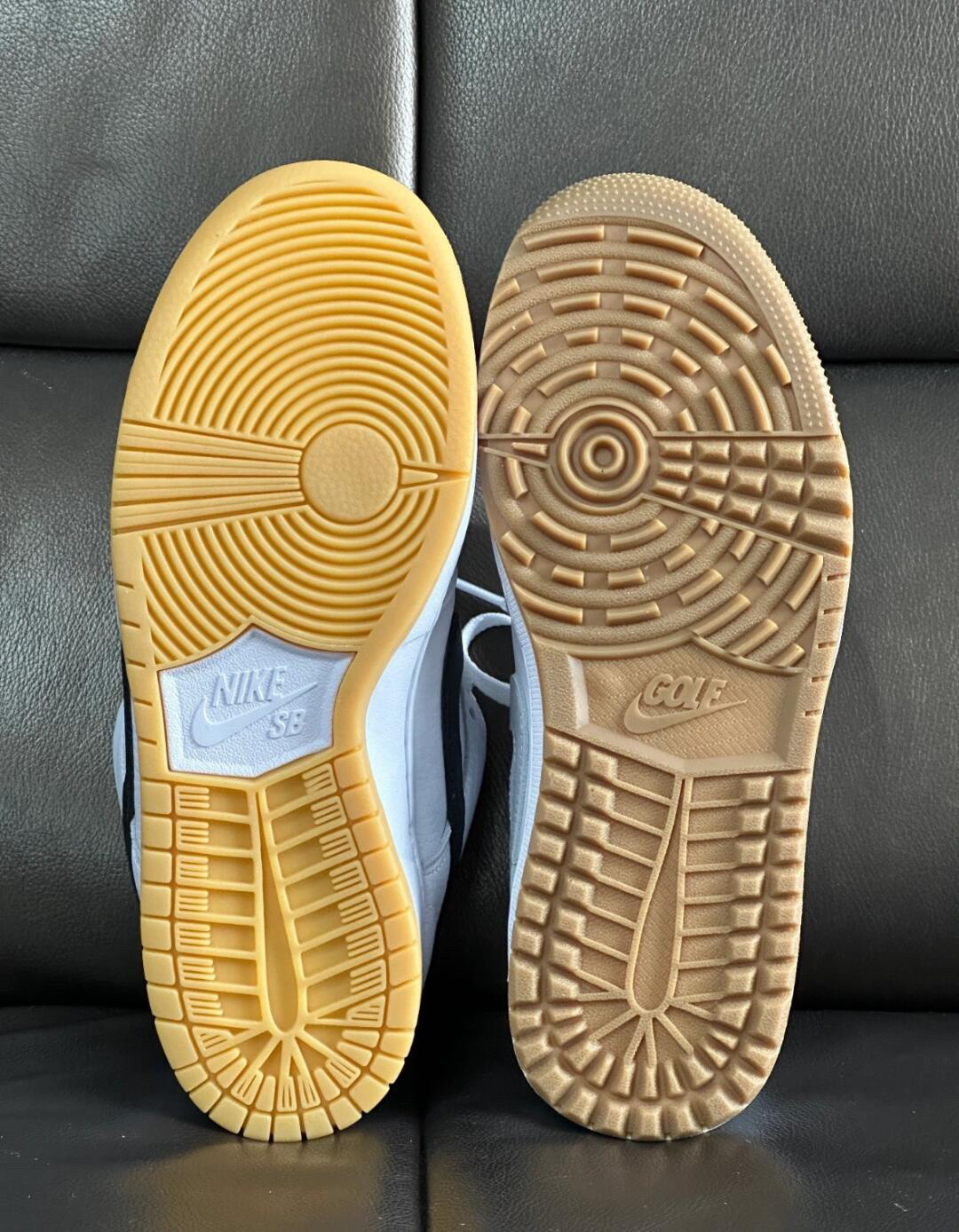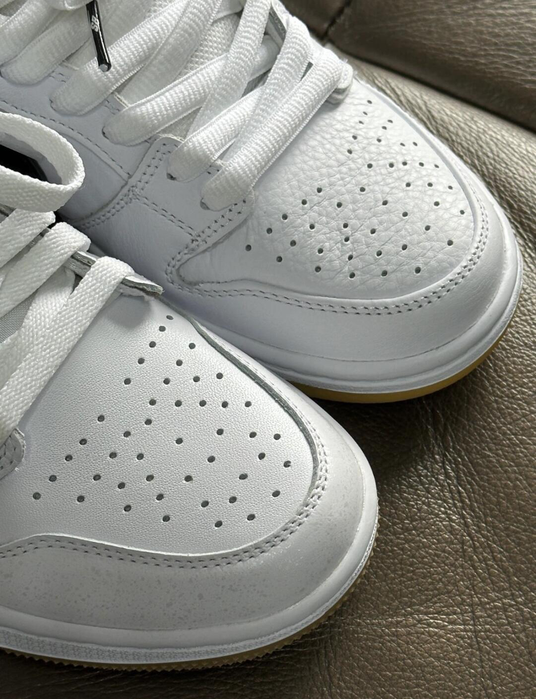 Jordan 1 Low Golf白生胶谁的颜值更能get到你呢? 口这两双鞋算是各有特色 ▶️Dunk SB白生胶的鞋型+配色出来的效果更帅气,不过AJ白生胶在鞋垫和外底的加持下则舒适性稍胜一筹 ▶️两双鞋都使用了头层牛皮革材质打造,用料出色且日常打理方便 ▶️尺码方面:Dunk SB白生胶尺码标准,AJ白生胶尺码偏大需要买小半码