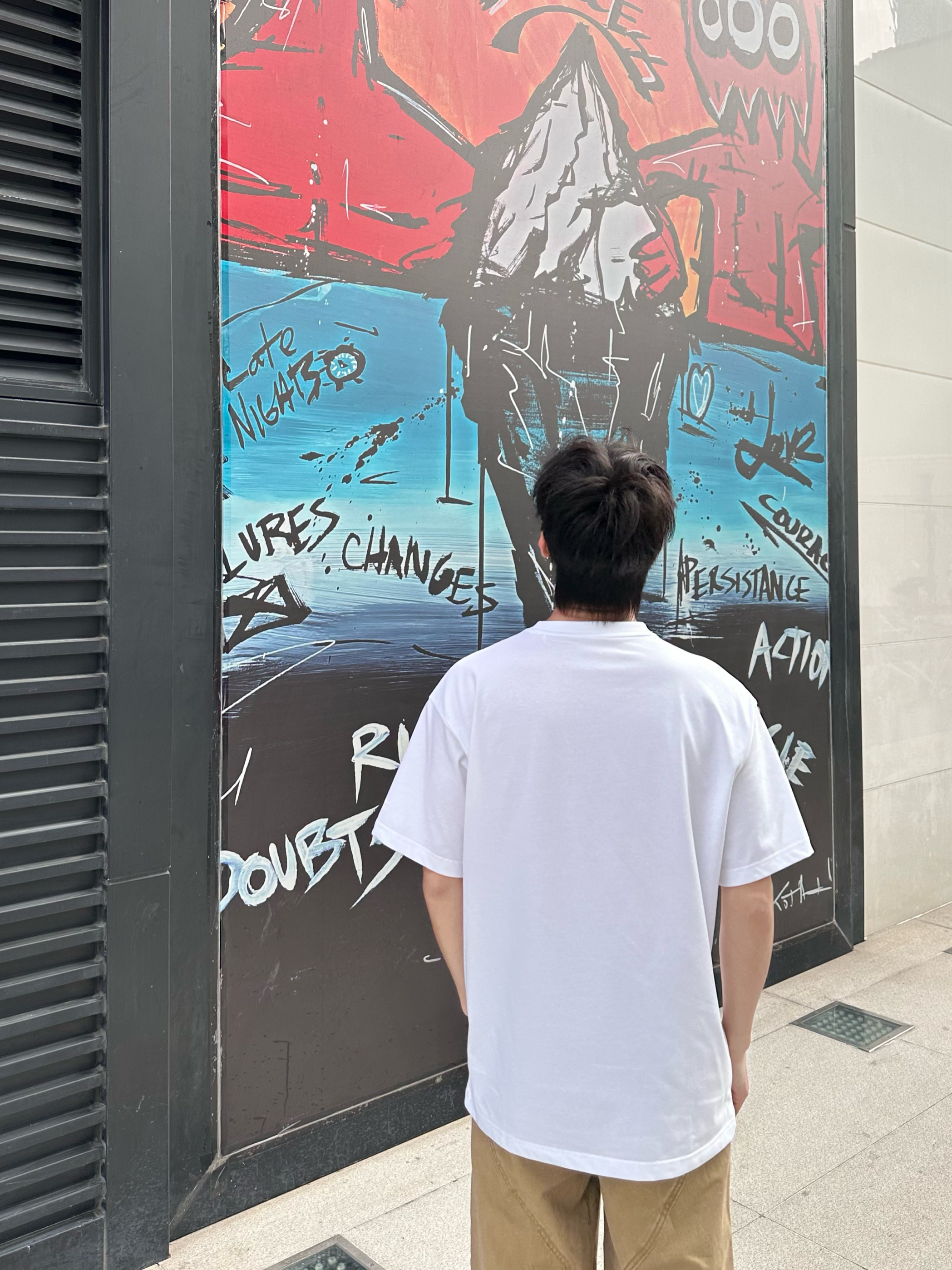 嘿~早春穿搭新思路! 美式圆领T 恤 宽松舒适 大幅手绘 Logo 很吸睛 与卡其裤、黄鞋搭配,走无性别主义路线 city walk 漫步、户外慢跑都OK 时尚百搭又随性 赶紧收藏起来