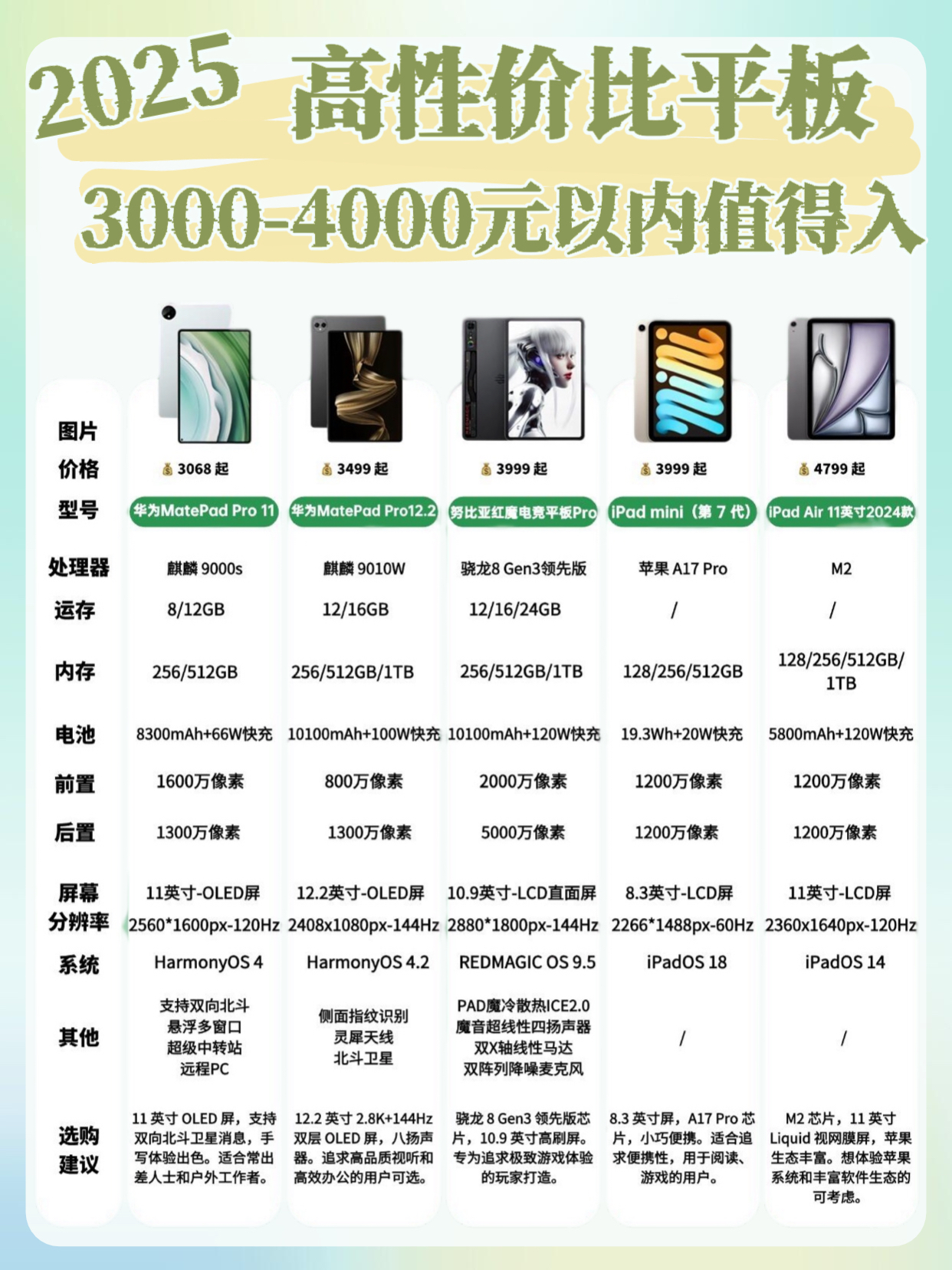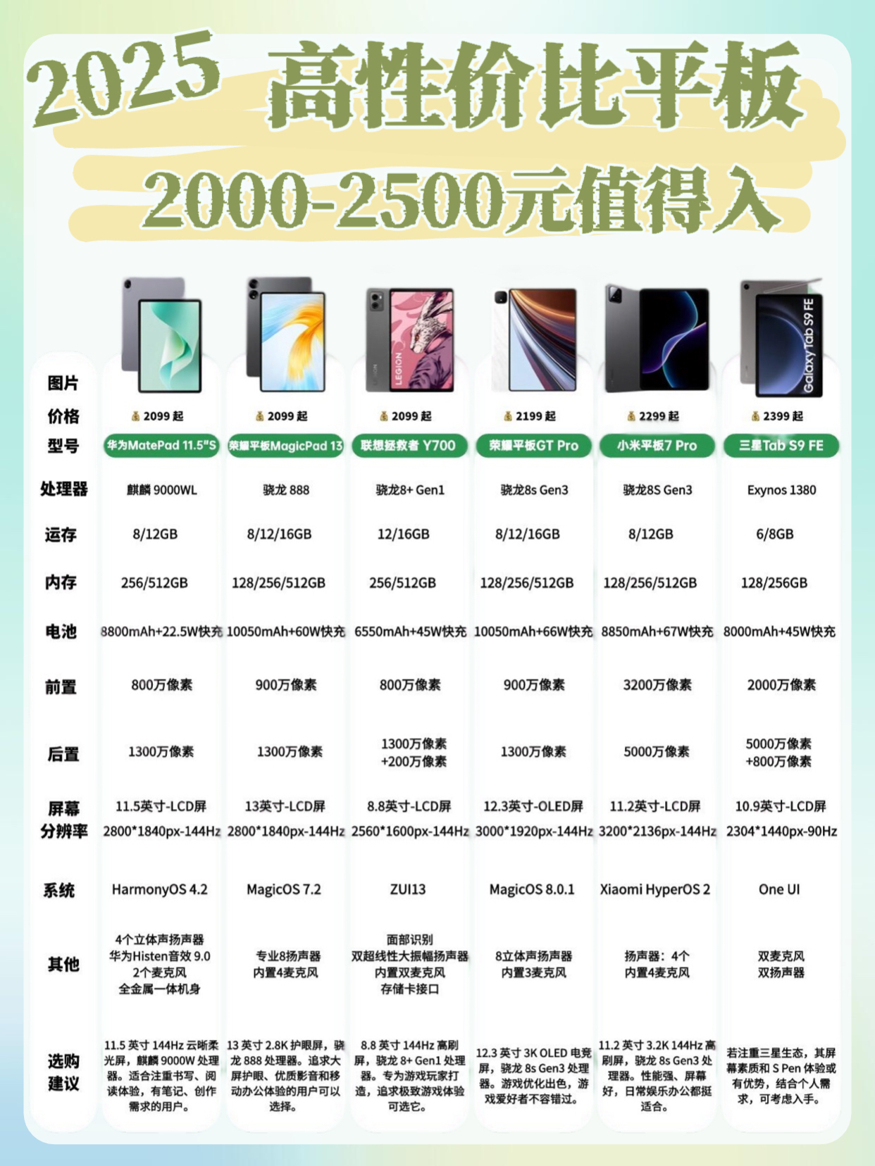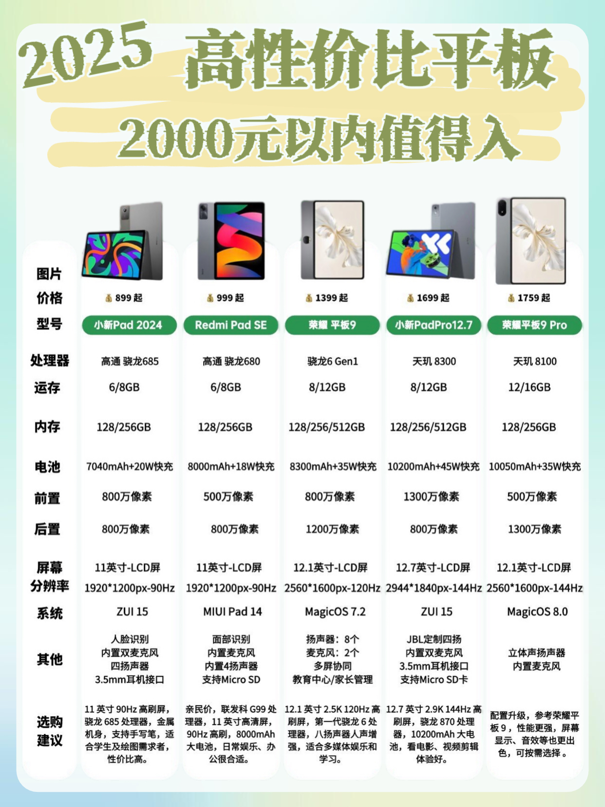 在2025年,选择一款高性价比的平板电脑确实需要考虑多个因素,包括预算、使用需求、品牌偏好等。以下是根据当前市场情况和用户反馈整理的各价位高性价比平板电脑推荐,以及选购平板电脑的一些要点: 各价位高性价比平板电脑推荐 1. 2000元以内 • 荣耀平板9:联发科G99处理器,11英寸90Hz高清屏,8000mAh大电池,适合日常轻度使用,如浏览网页、观看视频等。 ...