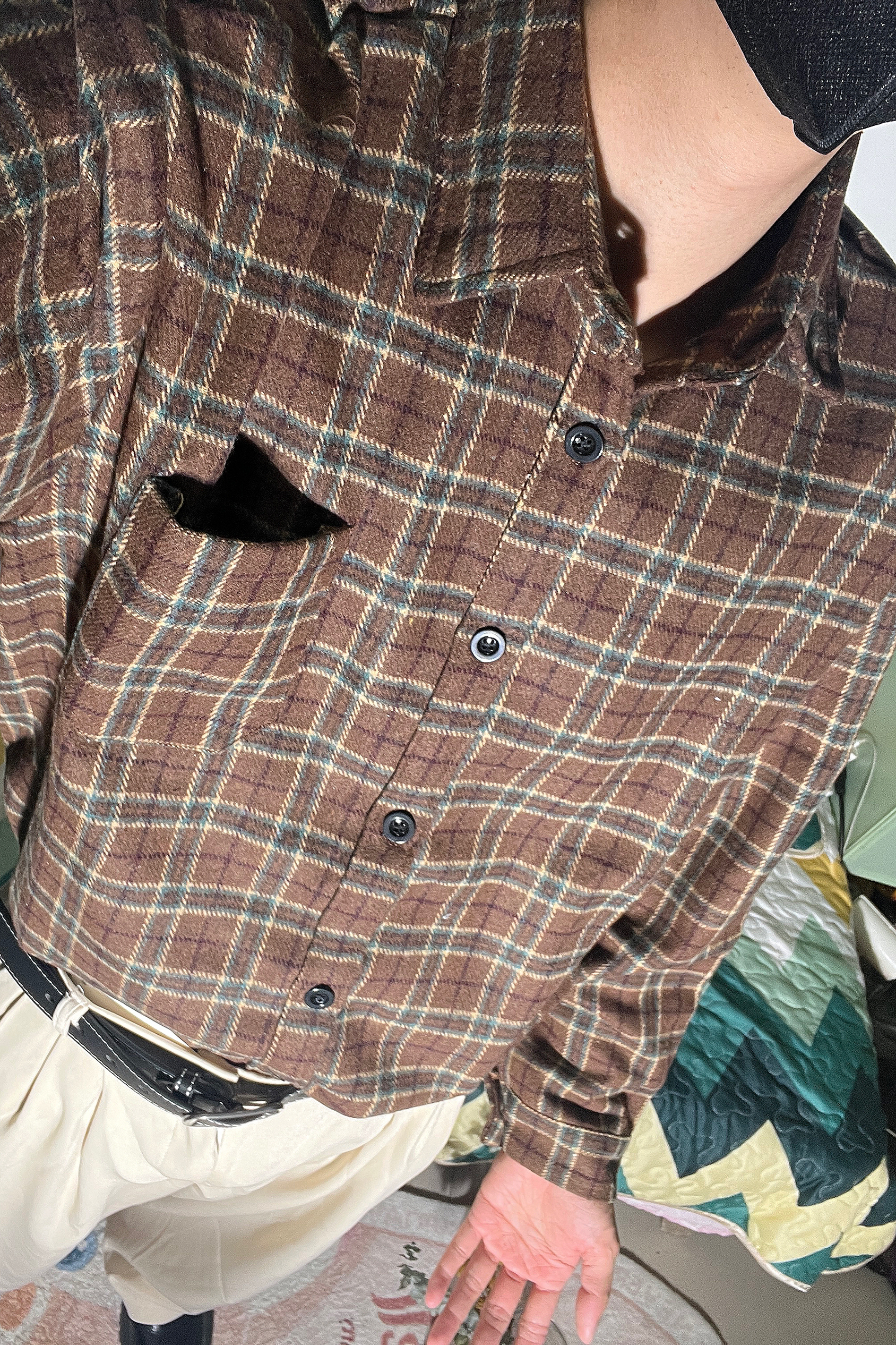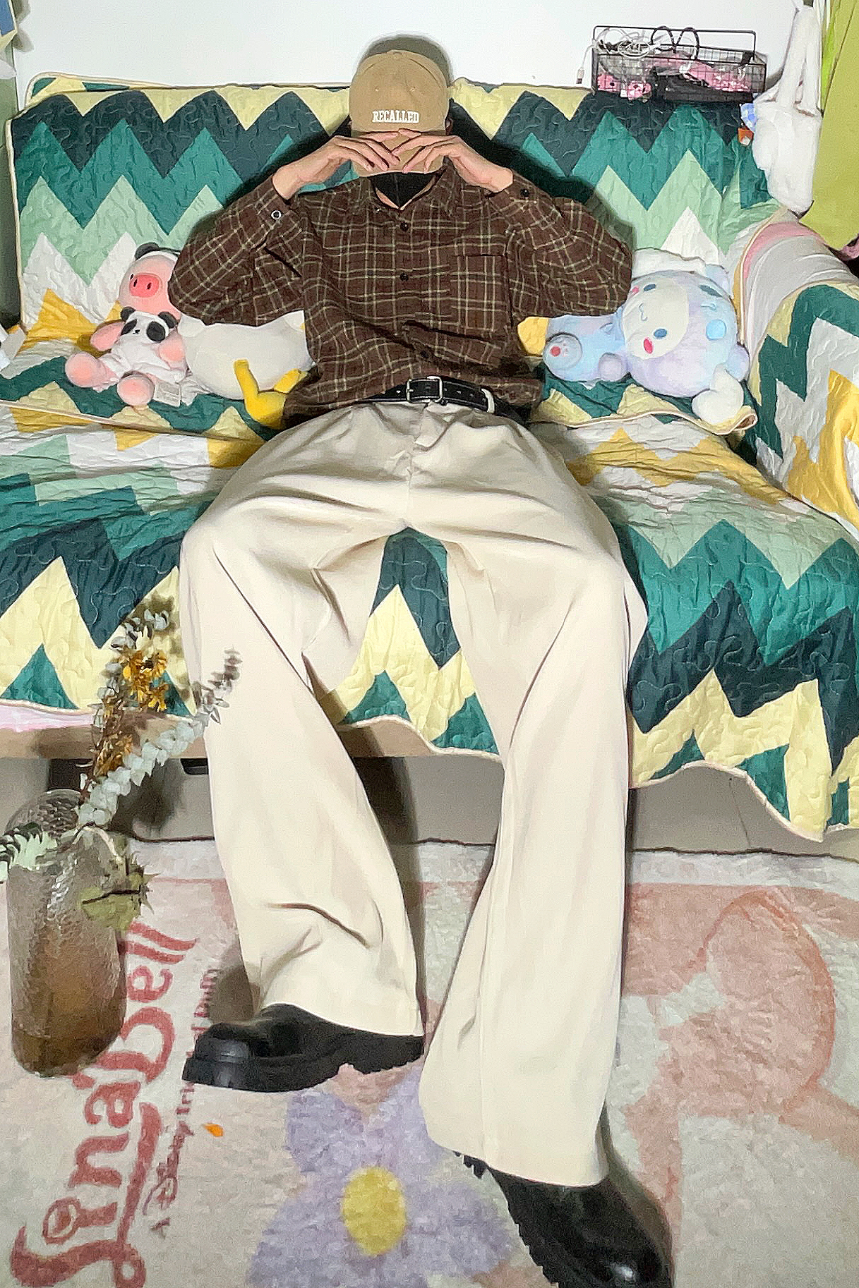 上衣 棕色衬衫 裤子 白色休闲西裤 鞋子 黑色皮鞋 最后把腰带系上就完成啦~