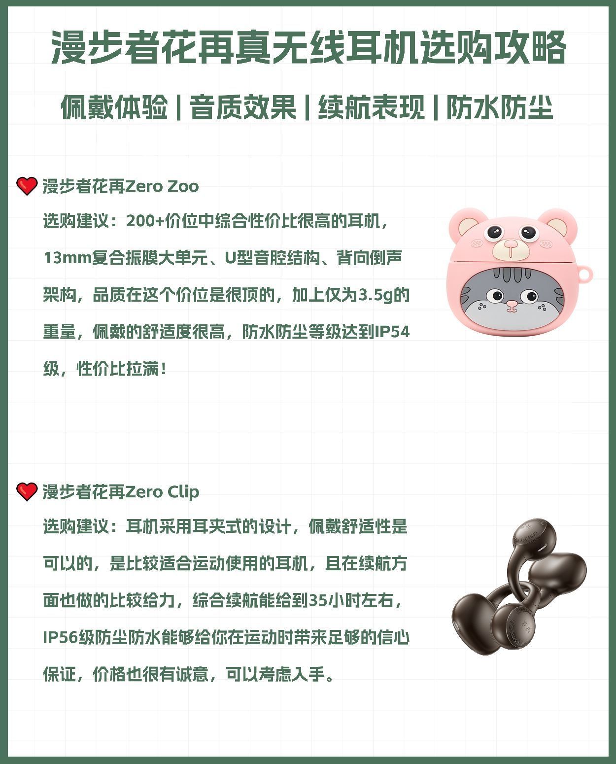 从去年到现在,我也做了不少耳机的横测,发现大部分小伙伴买耳机的预算都在500元以内,所以,今天就给小伙伴们说下,目前国产大牌-漫步者耳机系列中,值得入手的性价比机型! 漫步者花再Zero Zoo,200+价位中综合性价比很高的耳机,13mm复合振膜大单元、U型音腔结构、背向倒声架构,品质在这个价位是很顶的,加上仅为3.5g的重量,佩戴的舒适度很高,防水防尘等级达到IP54级,性价比拉满! 漫步...