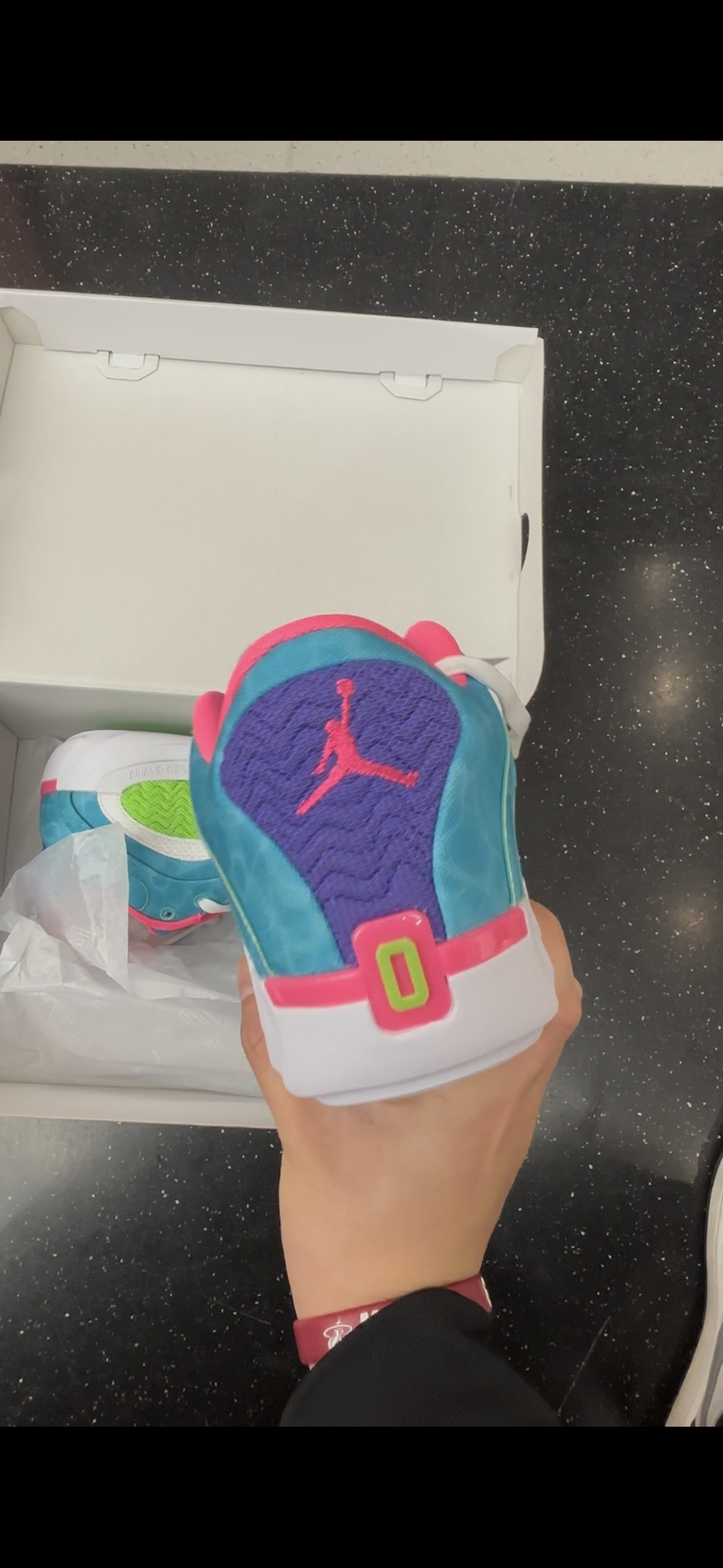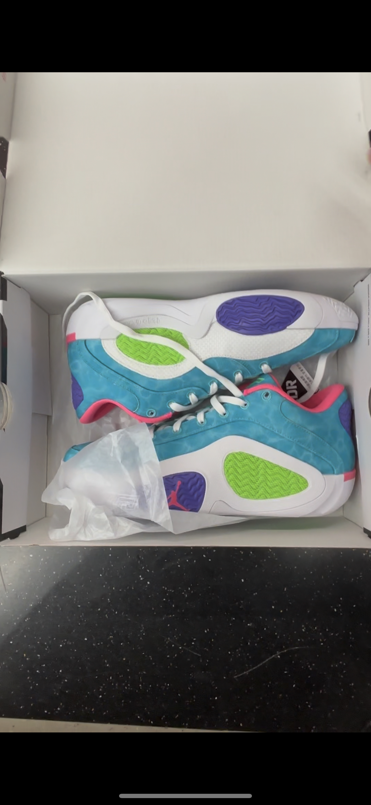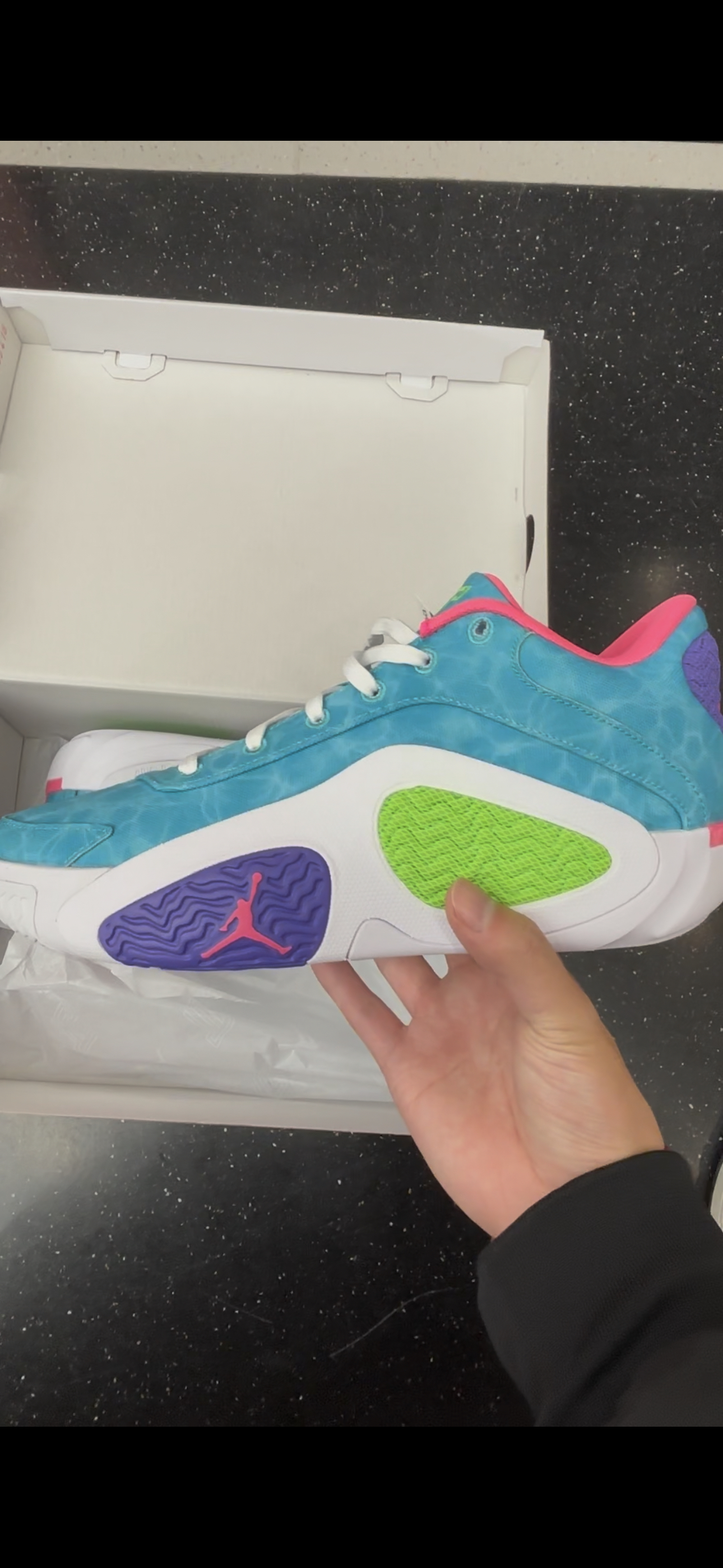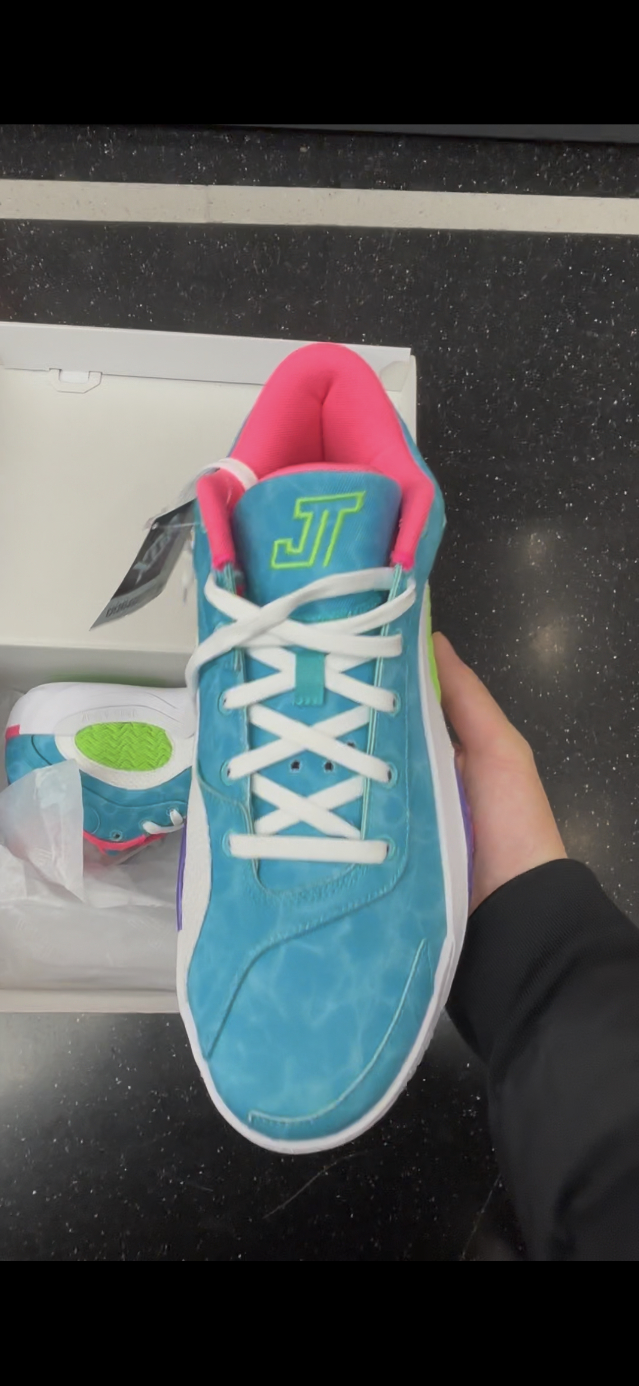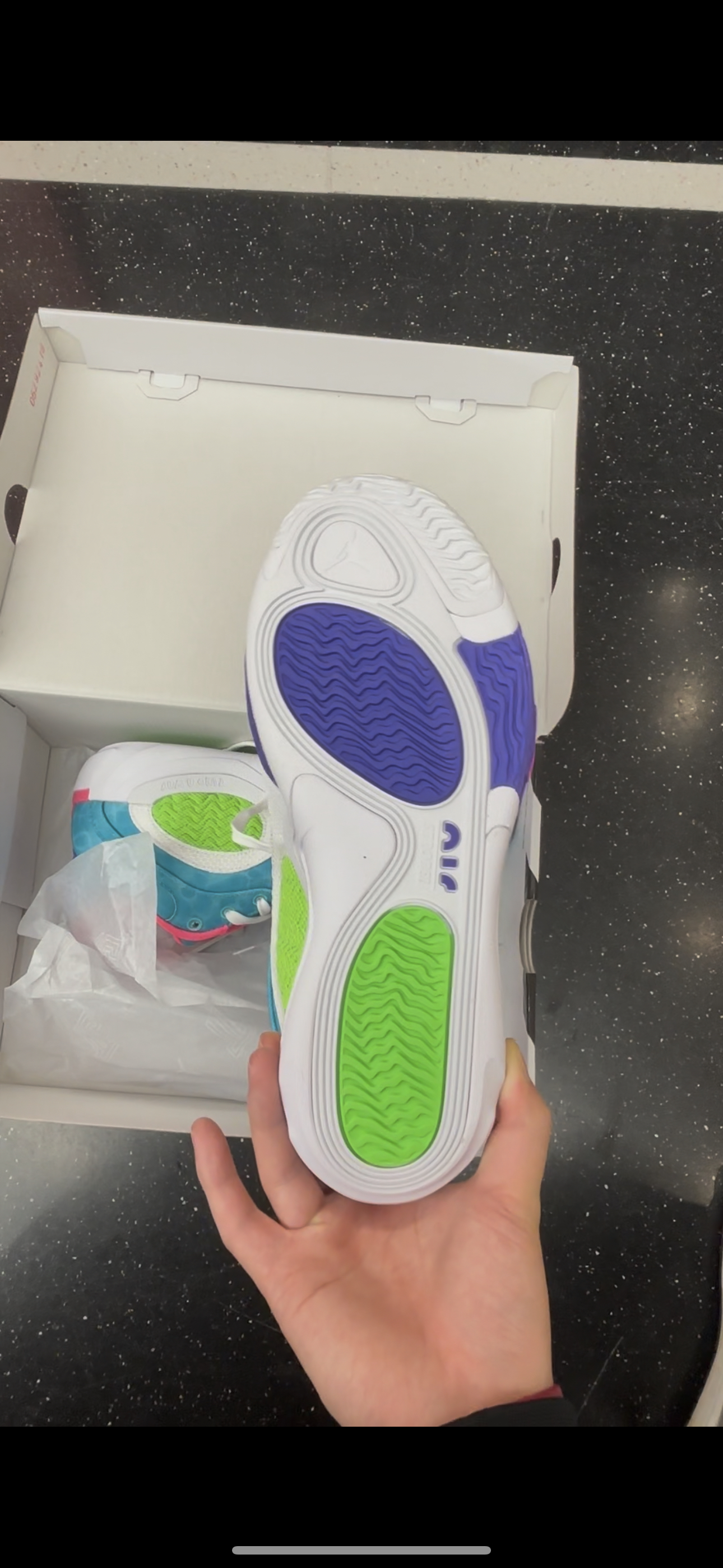 今天给大家带来的是一双塔图姆二代,蓝白紫配色,一眼看上去十分的亮眼,鞋面主要由蓝色构成 鞋楦处选择粉色内搭,中底选择全中掌的内置airs抓爆气垫 鞋后跟选择紫色设计和粉色飞人标志填充,大底橡胶底不吸灰,一共四块TPU贴片大大提升稳定性,是一双实战与颜值并兼的好鞋,最后为大家献上一张上脚图