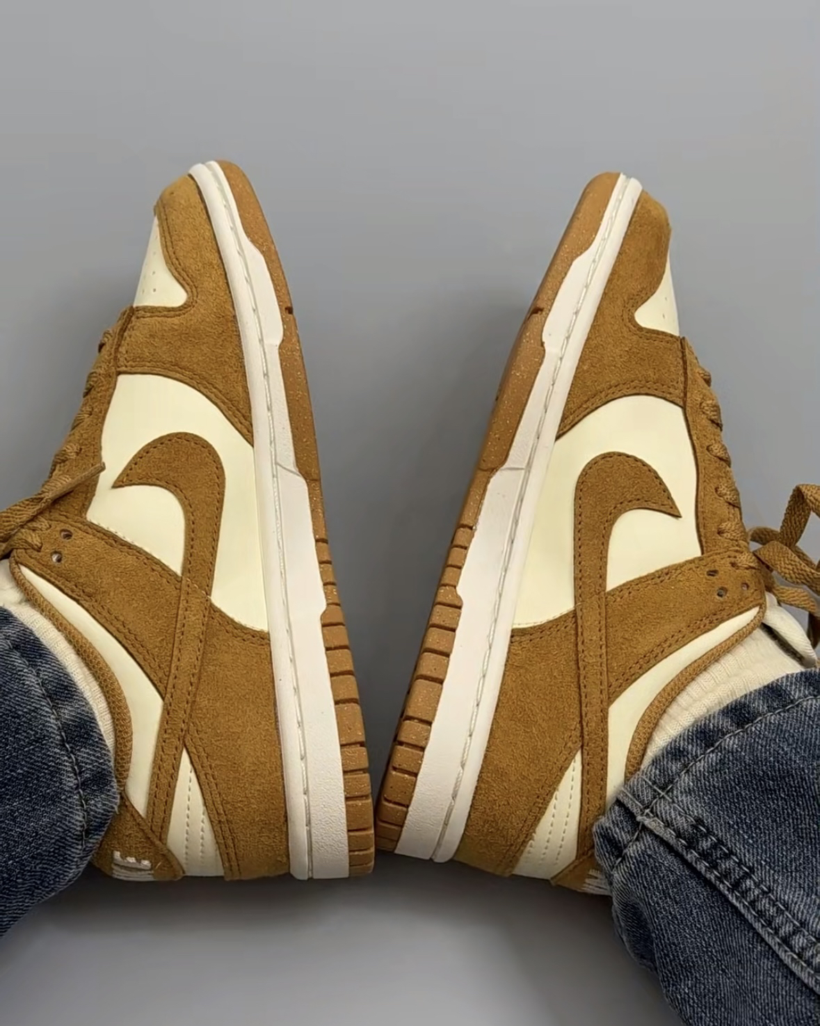宝子们,耐克Dunk Low板鞋,米白色与小麦色拼接的美拉德配色,充满秋冬氛围感,时尚感爆棚,一眼吸睛。鞋面材质有质感,透气又舒服,四季穿搭都适配。